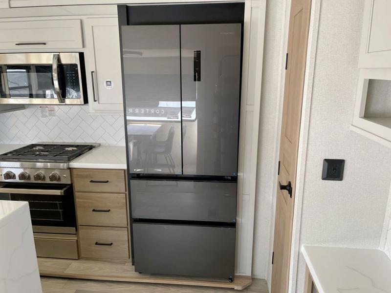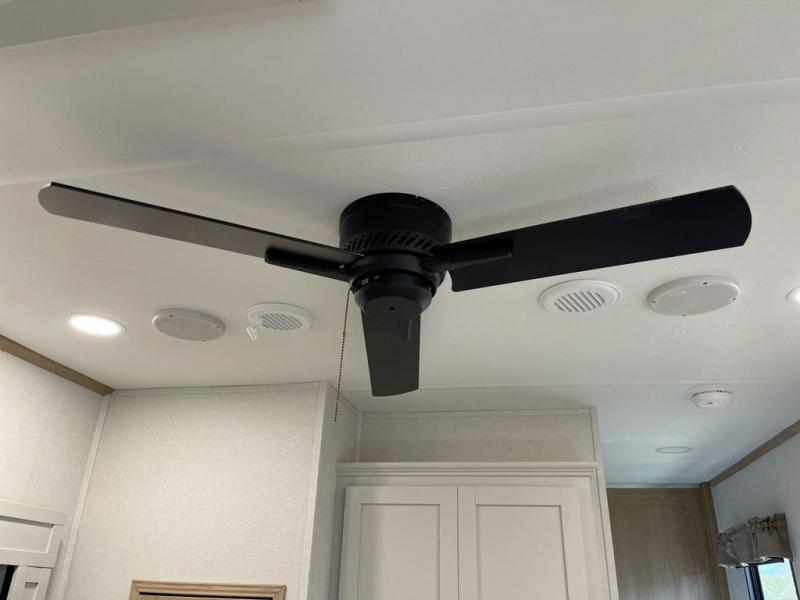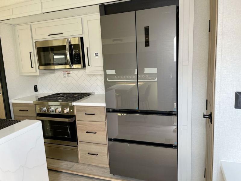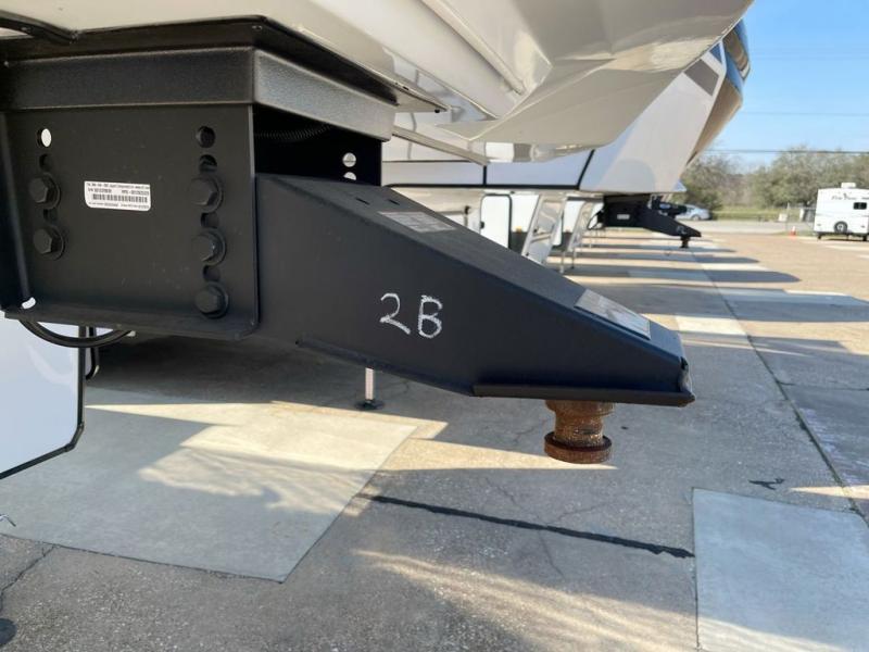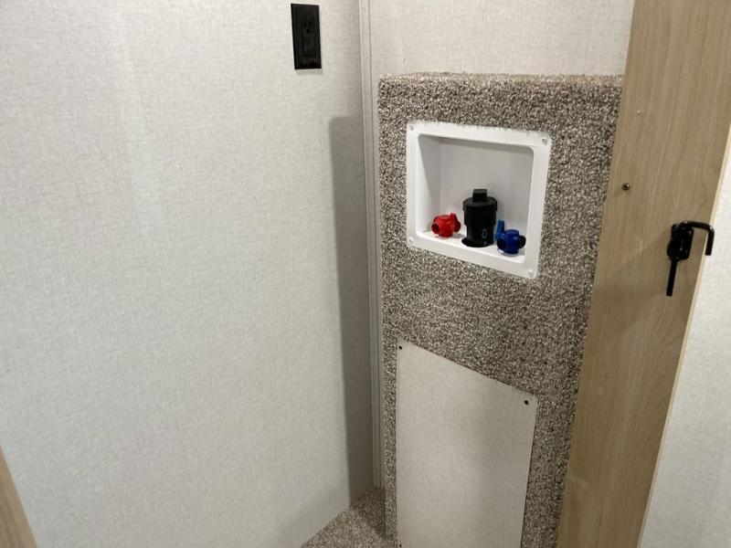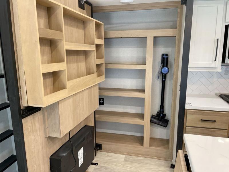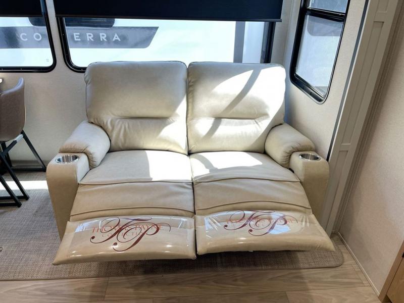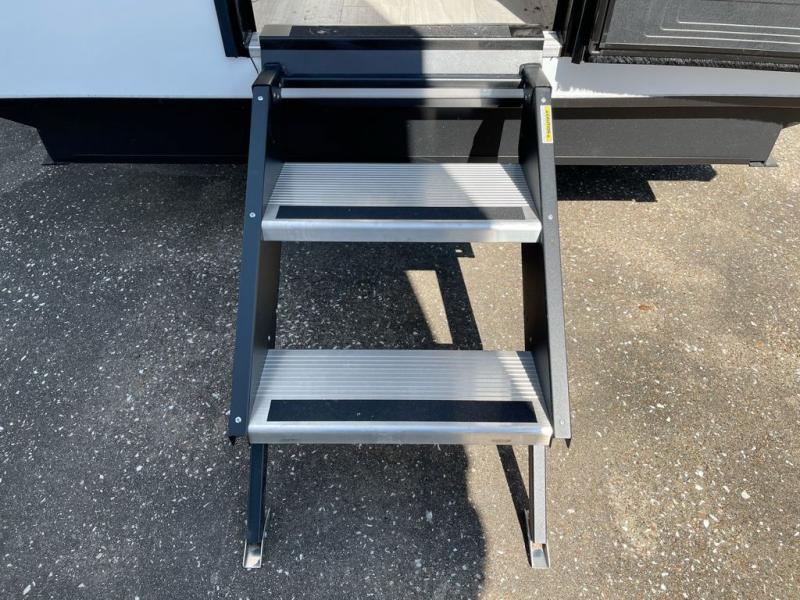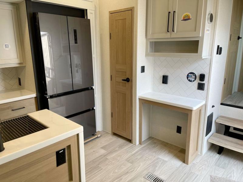 Enjoy a home on wheels with this fifth wheel! There are two bedrooms to choose from plus an upper loft with two 32" x 74" bunk mats, cabinets, and TV prep. The front private bedroom has a queen bed slide across from a dresser and a front wardrobe that is prepped to add an optional washer and dryer. The second bedroom has a queen bed slide across from a dresser with wardrobes on either side, plus it's very own full rear bathroom which has a 36" x 24" tub and a rear entry/exit door to the unit. The second full bathroom has a shower with a seat so everyone can get ready quickly in the morning. Prepare your best home cooked meals with the kitchen island and three burner cooktop then enjoy it at the free standing dinette. Relax in true comfort each night in the theater seating across from the fireplace and 50" TV at the entertainment center!