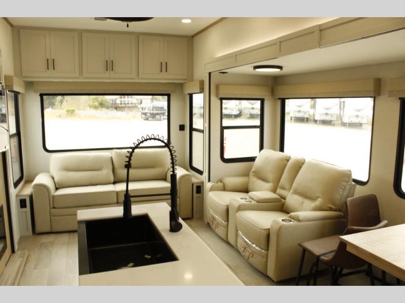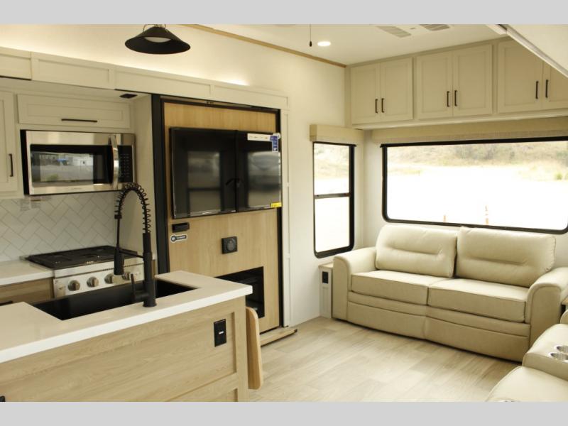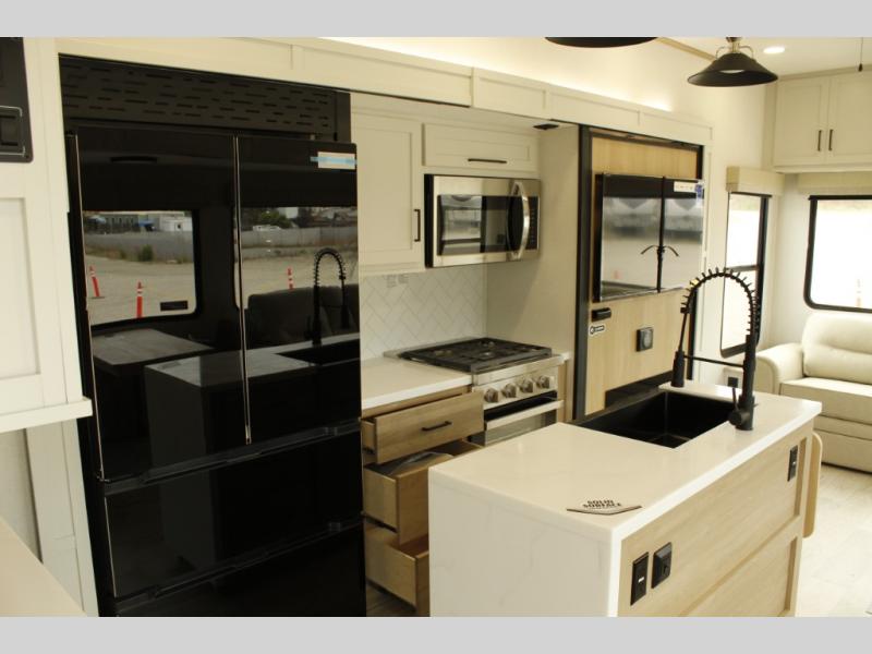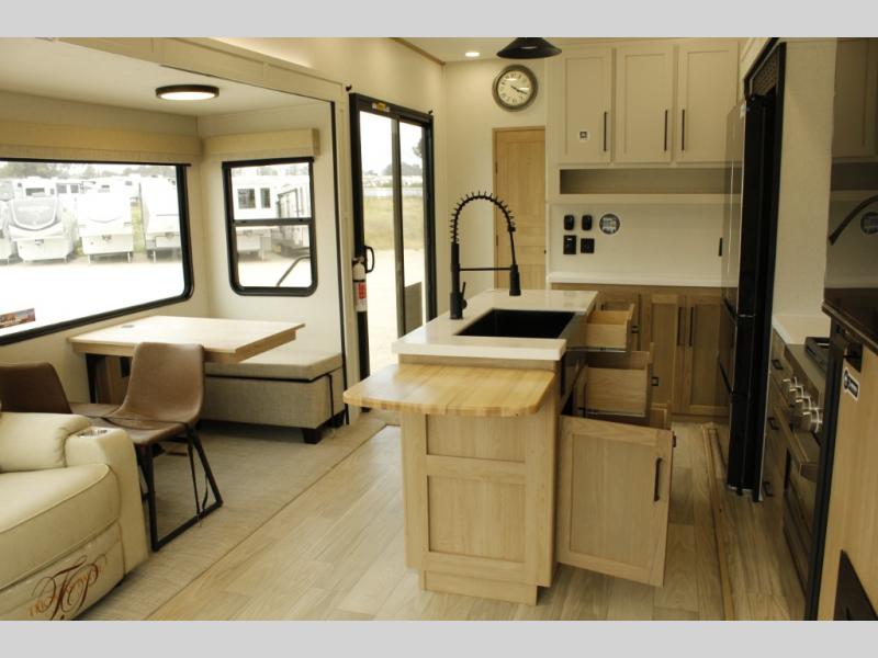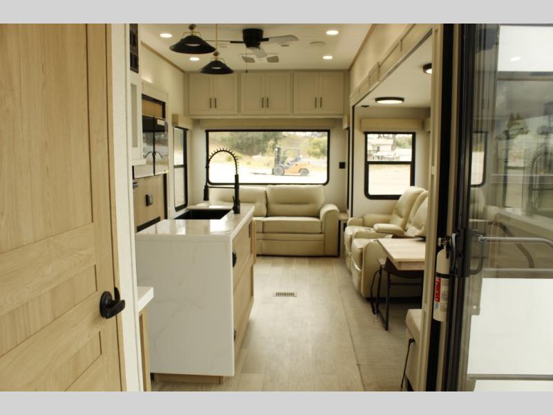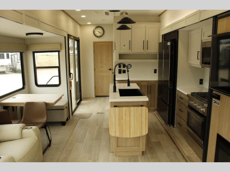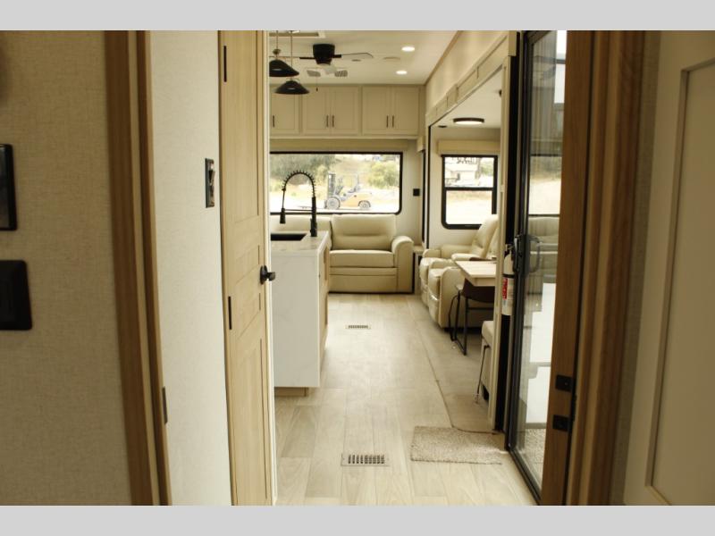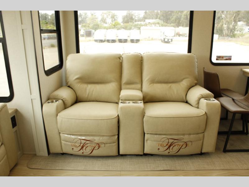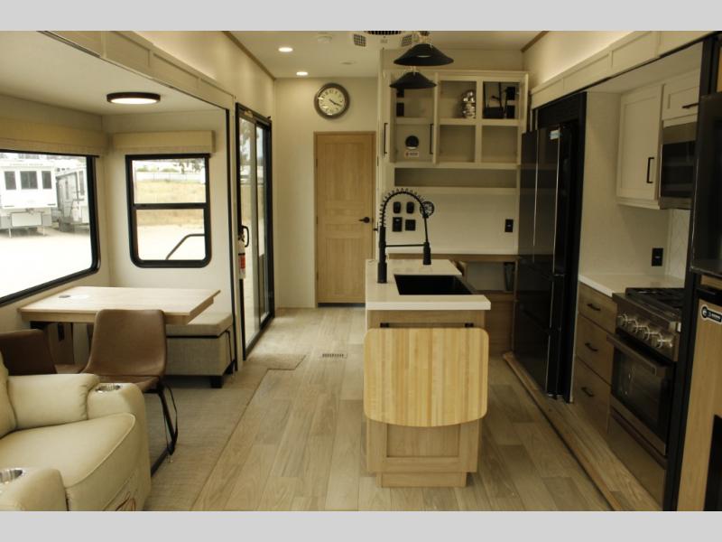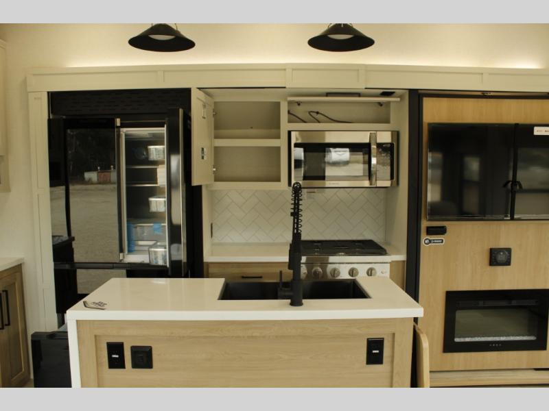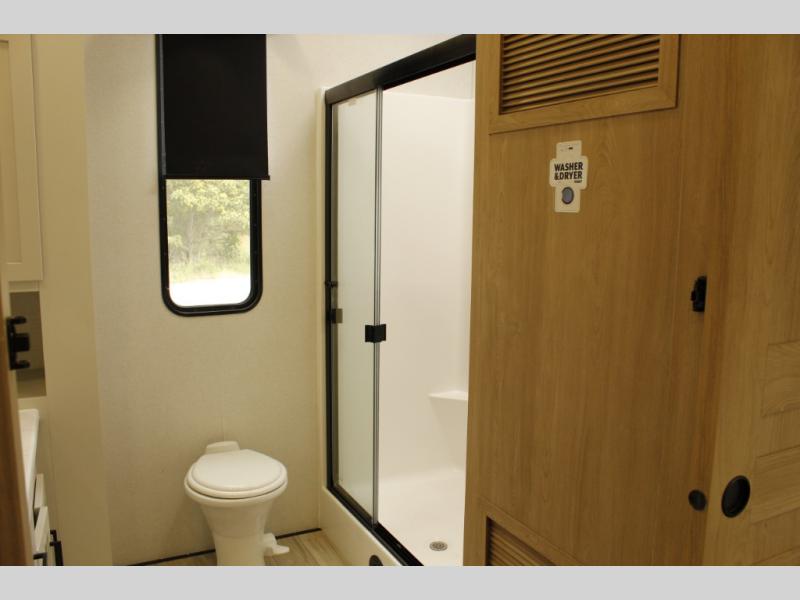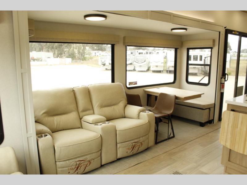 Unwind in style with the spacious full rear bathroom, featuring a shower with seat, linen closet, and washer and dryer prep for ultimate convenience. Enjoy the comfort of a private bathroom, complete with everything you need to start your day off right. Retreat to the private bedroom, boasting a plush king bed, dresser with TV prep, and dual wardrobe for ample storage, this serene oasis is the perfect place to rest and recharge after a long day. A convenient half bathroom with linen closet and medicine cabinets is perfectly situated for guests, providing a comfortable and private space for them to freshen up. With ample counter space and modern appliances, this kitchen is perfect for cooking up a storm and entertaining friends and family. The kitchen has overhead cabinets, a hutch, a 19.6 cu refrigerator, a microwave, a 3-burner cooktop, a kitchen island, and a free-standing dinette with chairs and a bench. The front living room is the ultimate entertainment space, featuring 68” theater seating, an 80” tri-fold hide-a-bed sofa, an entertainment center with a hidden pantry, shelves, and a ceiling fan. Whether you're watching your favorite movie, playing games, or just relaxing, this spacious living area has everything you need to relax and have fun.