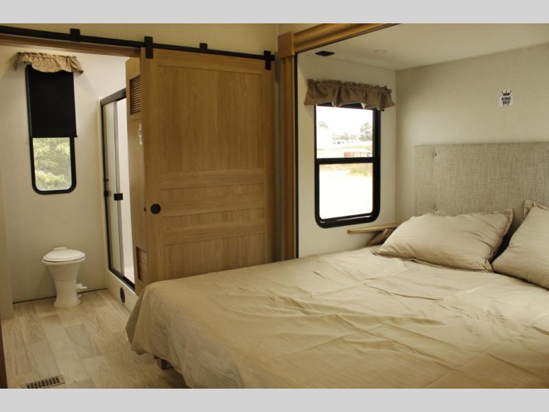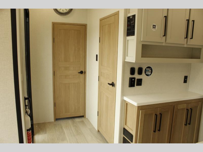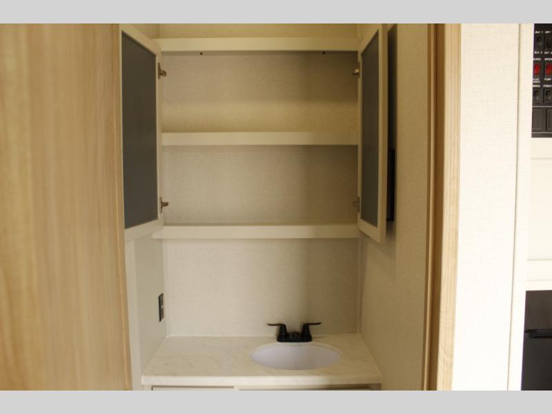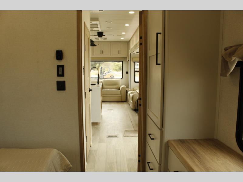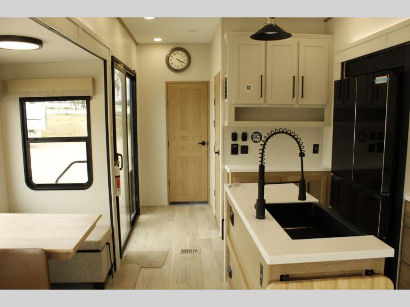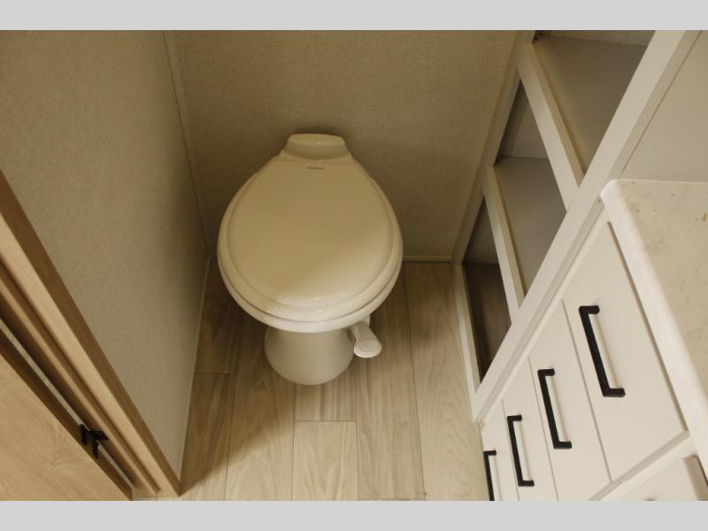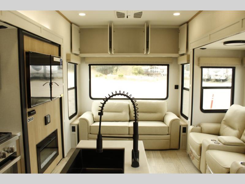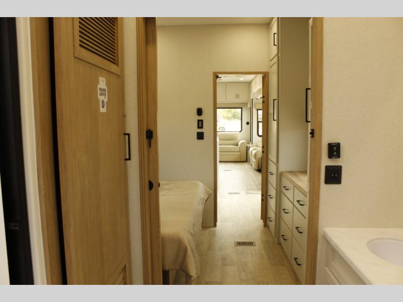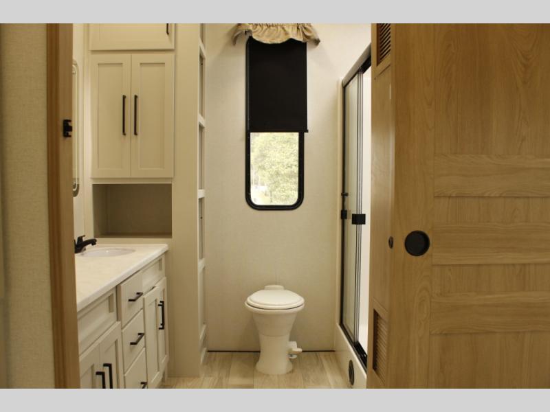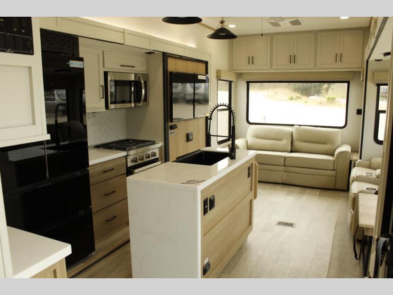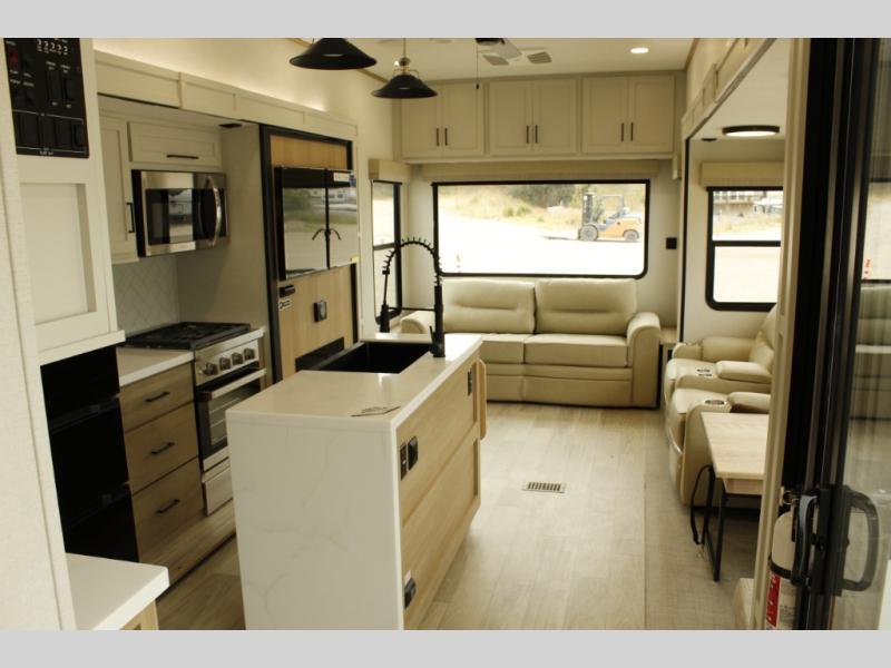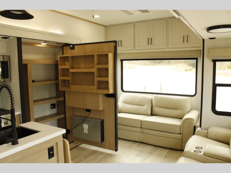 Unwind in style with the spacious full rear bathroom, featuring a shower with seat, linen closet, and washer and dryer prep for ultimate convenience. Enjoy the comfort of a private bathroom, complete with everything you need to start your day off right. Retreat to the private bedroom, boasting a plush king bed, dresser with TV prep, and dual wardrobe for ample storage, this serene oasis is the perfect place to rest and recharge after a long day. A convenient half bathroom with linen closet and medicine cabinets is perfectly situated for guests, providing a comfortable and private space for them to freshen up. With ample counter space and modern appliances, this kitchen is perfect for cooking up a storm and entertaining friends and family. The kitchen has overhead cabinets, a hutch, a 19.6 cu refrigerator, a microwave, a 3-burner cooktop, a kitchen island, and a free-standing dinette with chairs and a bench. The front living room is the ultimate entertainment space, featuring 68” theater seating, an 80” tri-fold hide-a-bed sofa, an entertainment center with a hidden pantry, shelves, and a ceiling fan. Whether you're watching your favorite movie, playing games, or just relaxing, this spacious living area has everything you need to relax and have fun.