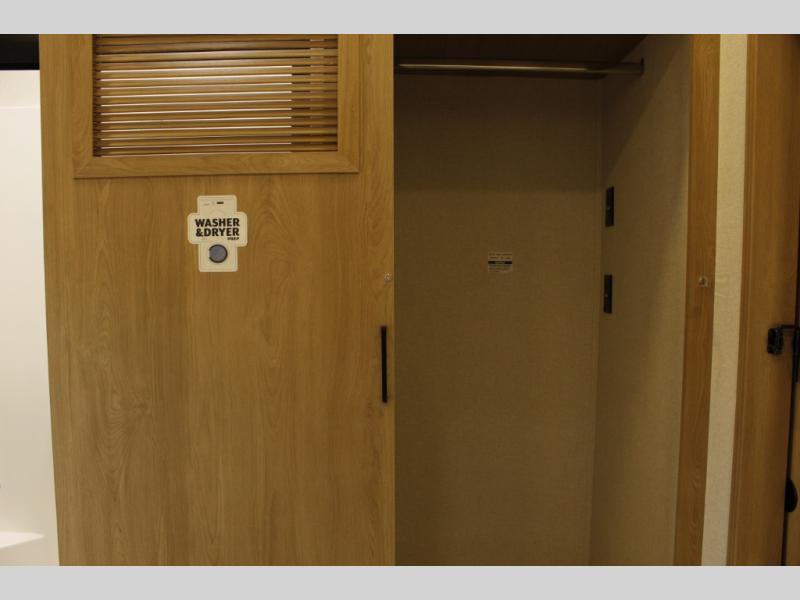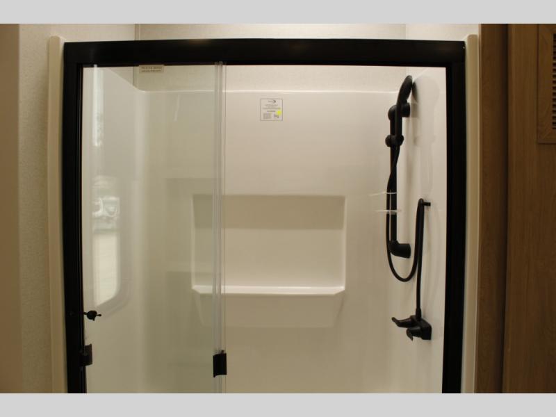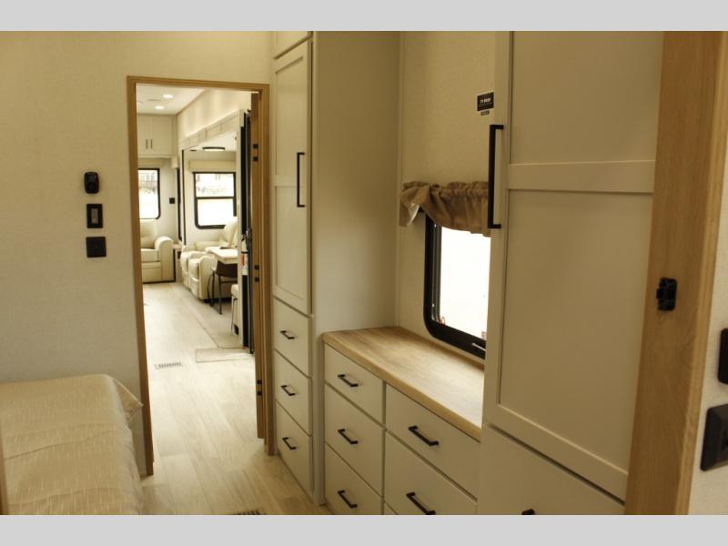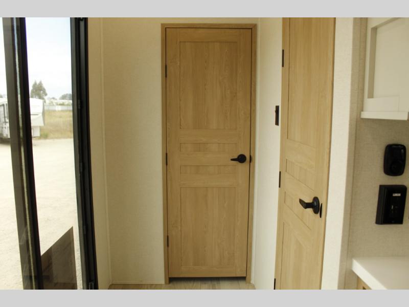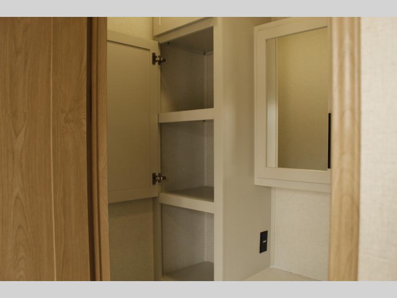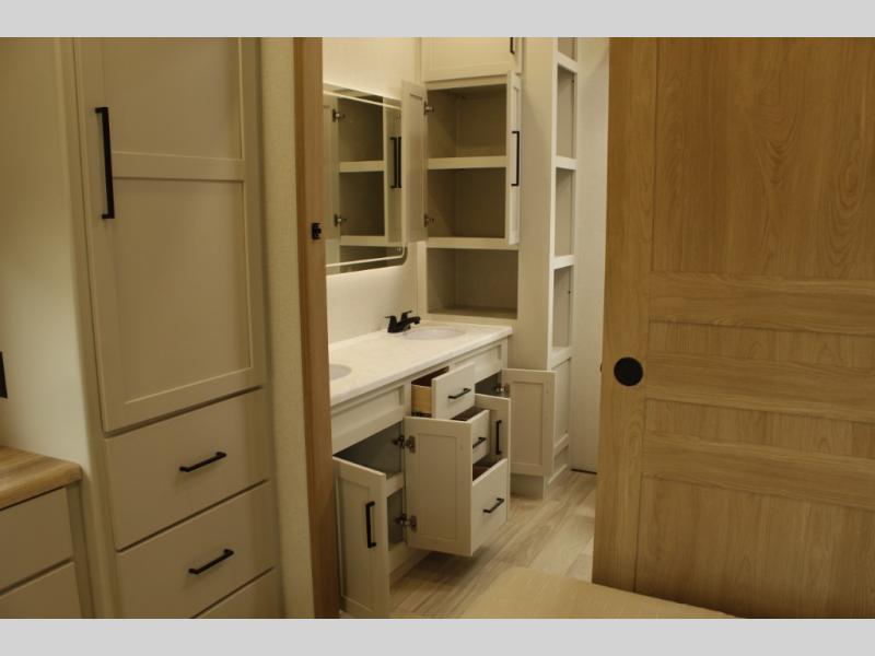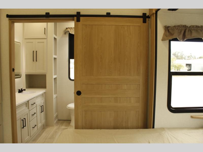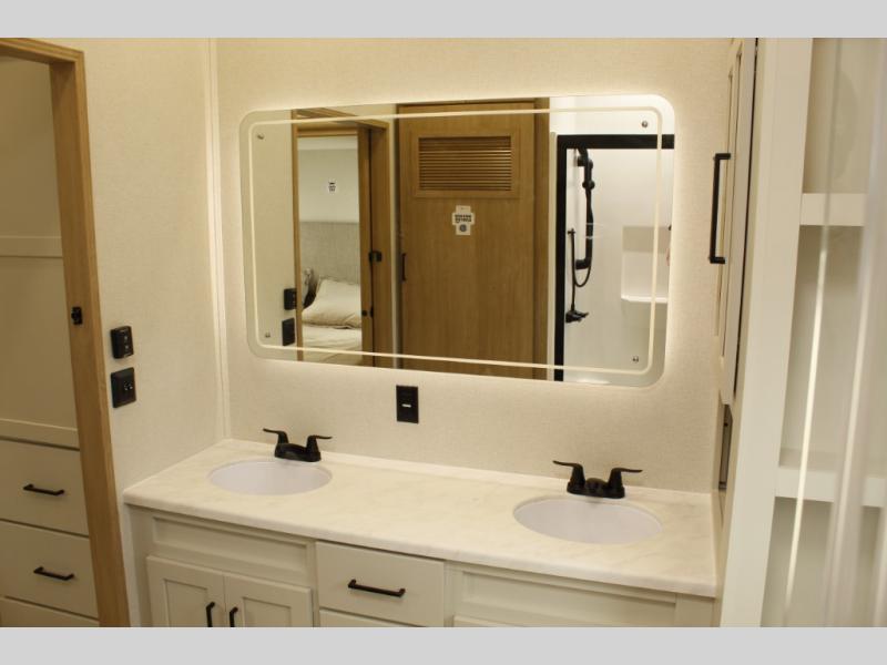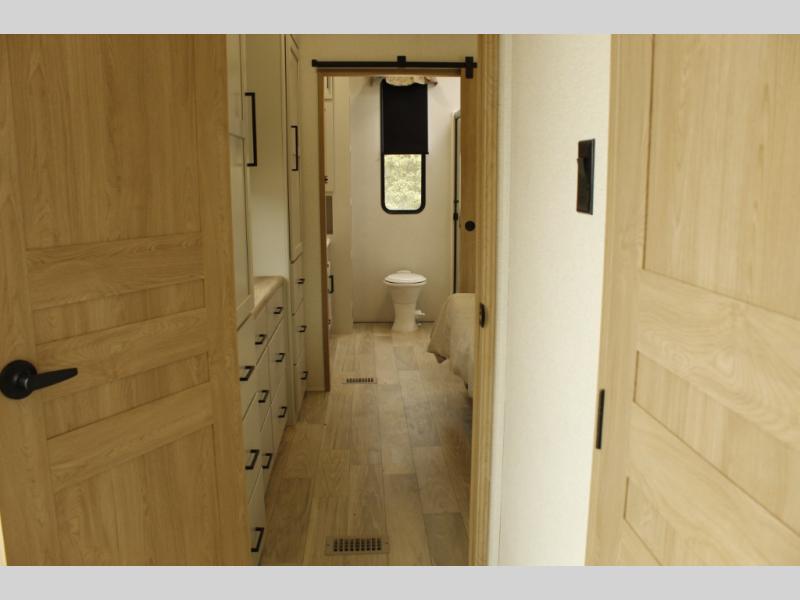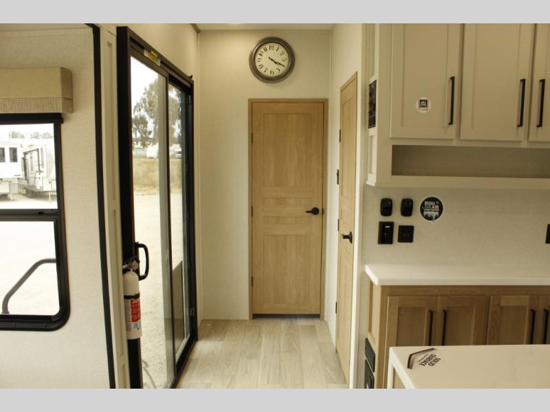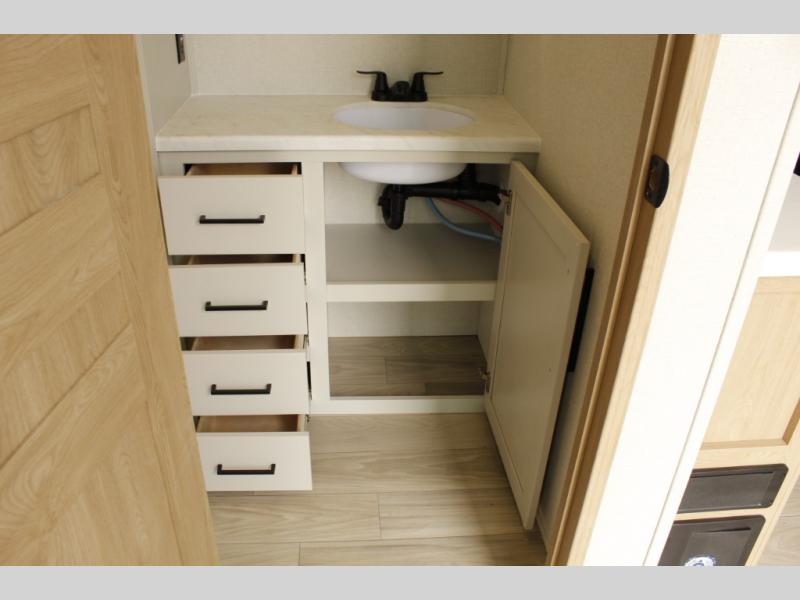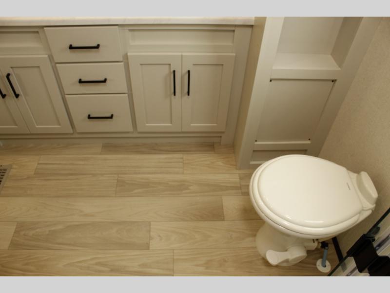 Unwind in style with the spacious full rear bathroom, featuring a shower with seat, linen closet, and washer and dryer prep for ultimate convenience. Enjoy the comfort of a private bathroom, complete with everything you need to start your day off right. Retreat to the private bedroom, boasting a plush king bed, dresser with TV prep, and dual wardrobe for ample storage, this serene oasis is the perfect place to rest and recharge after a long day. A convenient half bathroom with linen closet and medicine cabinets is perfectly situated for guests, providing a comfortable and private space for them to freshen up. With ample counter space and modern appliances, this kitchen is perfect for cooking up a storm and entertaining friends and family. The kitchen has overhead cabinets, a hutch, a 19.6 cu refrigerator, a microwave, a 3-burner cooktop, a kitchen island, and a free-standing dinette with chairs and a bench. The front living room is the ultimate entertainment space, featuring 68” theater seating, an 80” tri-fold hide-a-bed sofa, an entertainment center with a hidden pantry, shelves, and a ceiling fan. Whether you're watching your favorite movie, playing games, or just relaxing, this spacious living area has everything you need to relax and have fun.