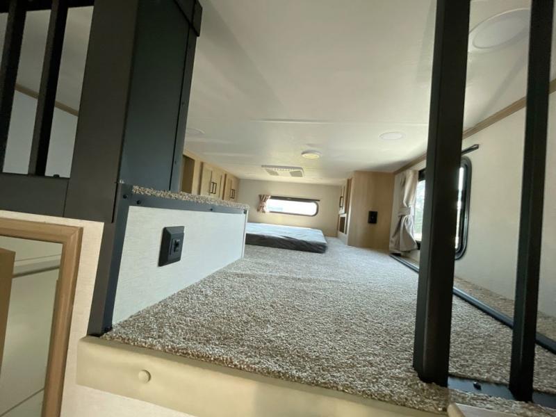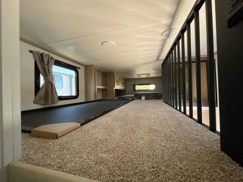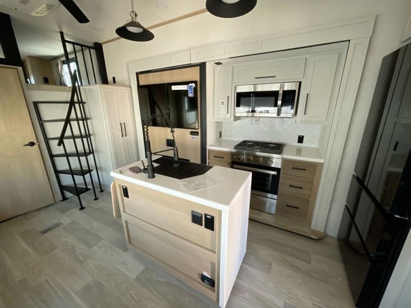You won't believe the comfort and convenience found in this destination trailer. There are two private bedrooms; one up front with a queen bed slide out and storage space, and one in back with a queen bed slide out and a half bath! There is even washer and dryer prep here if you want to add those appliances and the second entry door is also found in this location so you can easily slip out in the morning. Above each of these rooms is a loft providing three total bunk mats for sleeping, storage cabinets, and TV prep in the front loft if you want to add entertainment. Everyone can meet in the combined kitchen and living room that includes dual opposing slides, theater seating across from a 50" flat screen TV and fireplace, plus a free-standing table and chairs to dine at. The chef of your group will love the large kitchen island, 3.7 cu. ft. free-standing range with four burners, and a 19 cu. ft. 12V stainless refrigerator for food storage.