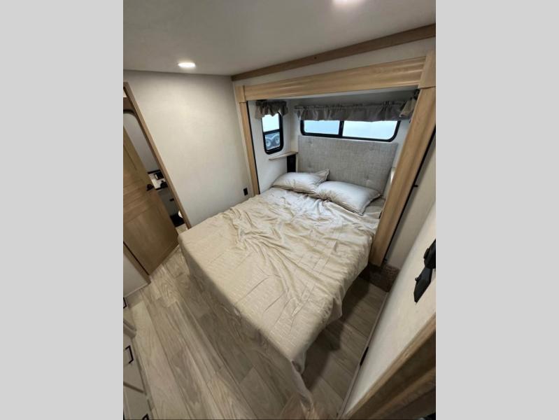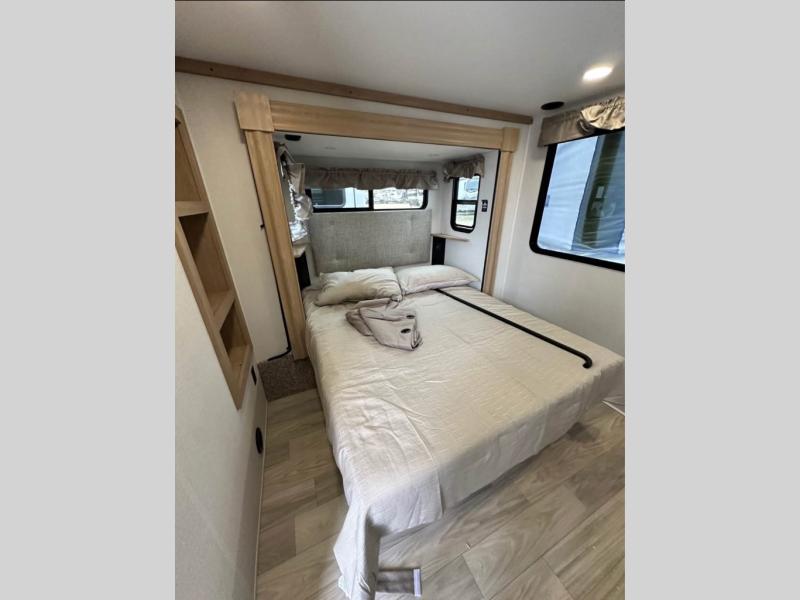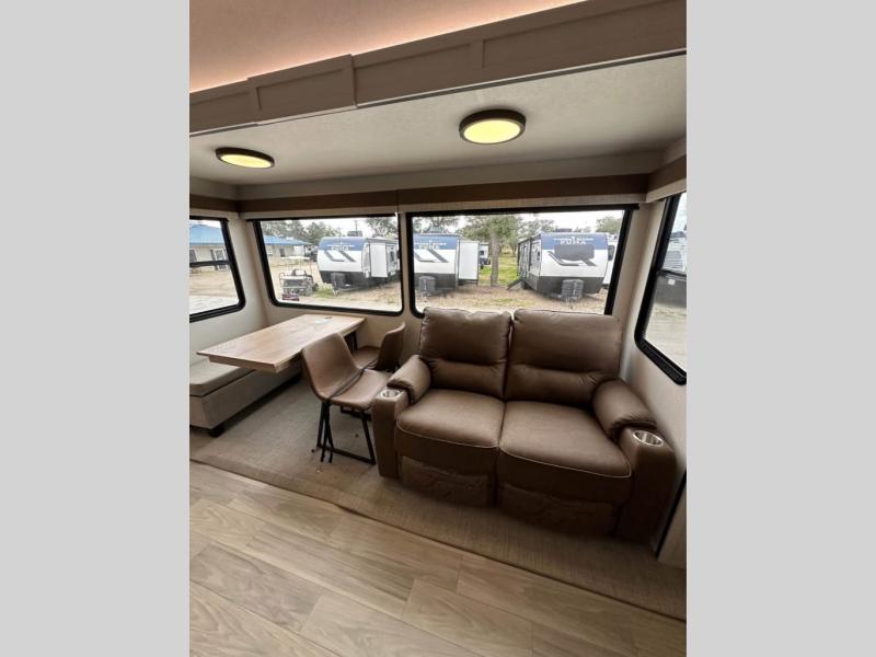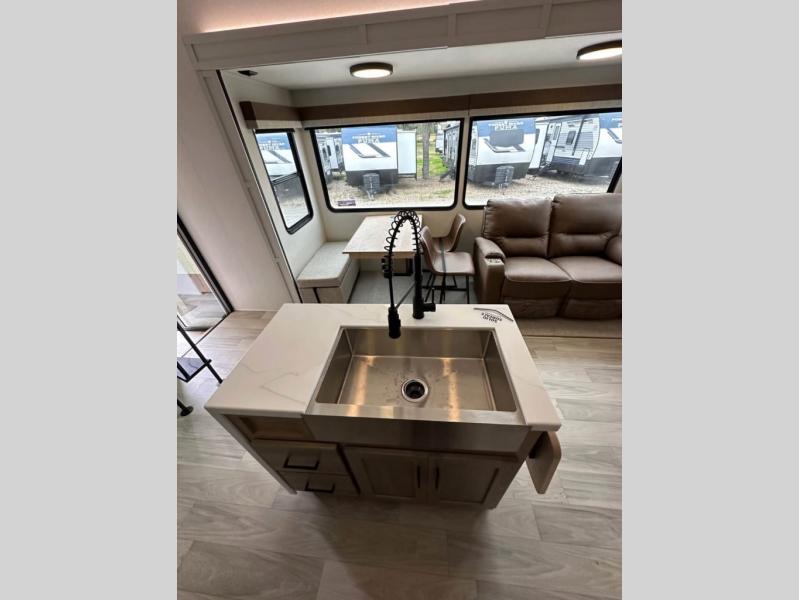 With each Sierra Destination Trailer by Forest River you will enjoy many luxurious features, such as crown molding over the kitchen cabinets, solid surface kitchen countertops, a memory foam mattress, plus so much more. The extra large picture windows throughout let natural light in and provide beautiful outdoor views, and each model includes three or more slides for added interior space. You'll find many exterior conveniences, like the porch light with an interior switch, the rain gutters with extra long drip spouts to prevent black streaking, and an electric awning with LED light strip, plus more! You will stay comfortable year around with dual 15,000 A/C units and the high-efficiency radiant foil in the roof and floor, plus each model is constructed with an Underbelly Armor for better insulation!