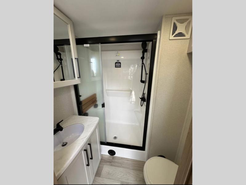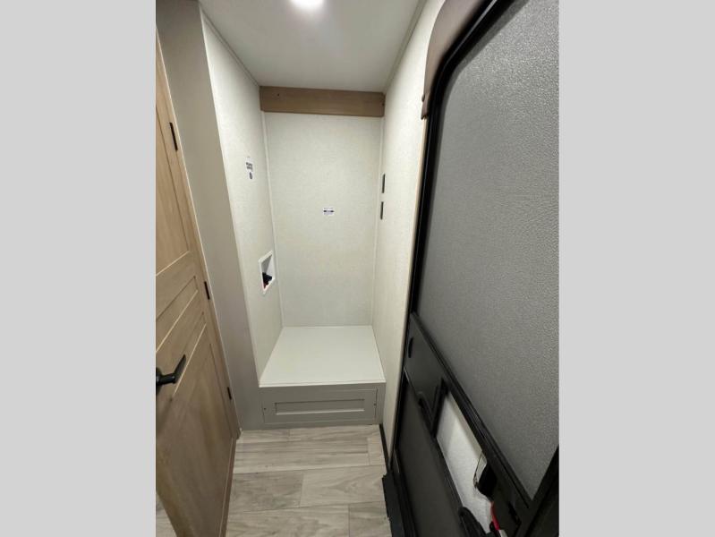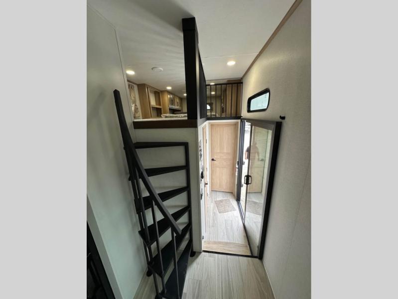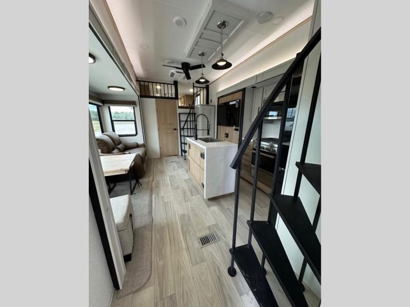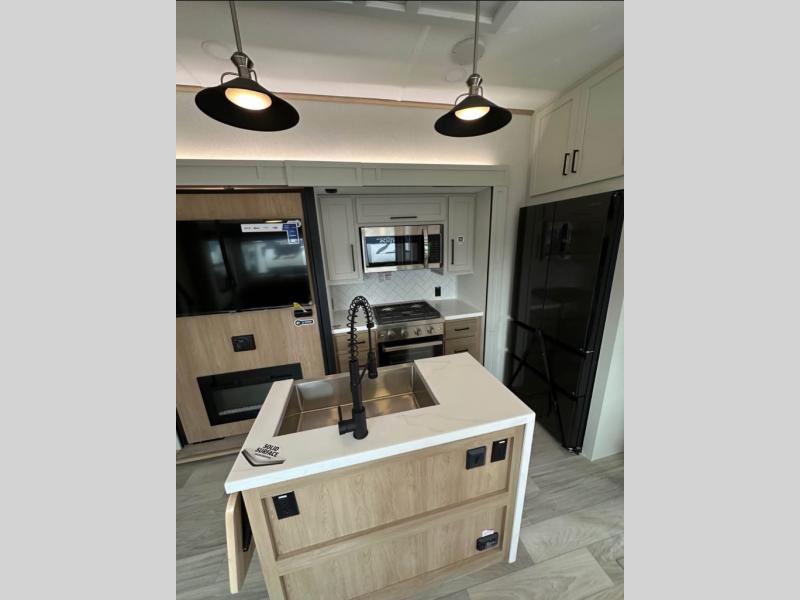 You won't believe the comfort and convenience found in this destination trailer. There are two private bedrooms; one up front with a queen bed slide out and storage space, and one in back with a queen bed slide out and a half bath! There is even washer and dryer prep here if you want to add those appliances and the second entry door is also found in this location so you can easily slip out in the morning. Above each of these rooms is a loft providing three total bunk mats for sleeping, storage cabinets, and TV prep in the front loft if you want to add entertainment. Everyone can meet in the combined kitchen and living room that includes dual opposing slides, a 60" theater seating across from a 50" flat screen TV and fireplace, plus a free-standing table with chairs and bench to dine at. The chef of your group will love the large kitchen island, free-standing range with four burners, and a 16.2 cu. ft. 12V stainless refrigerator for food storage.