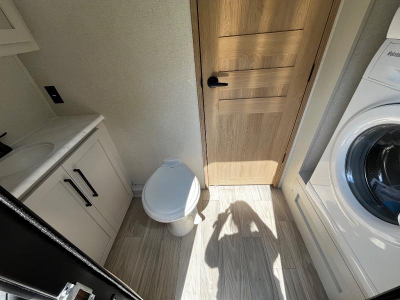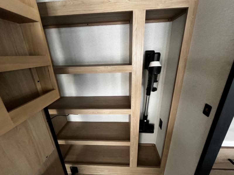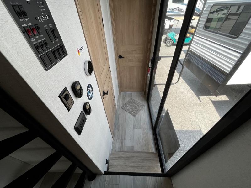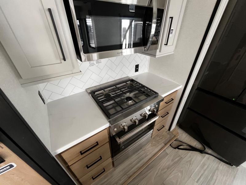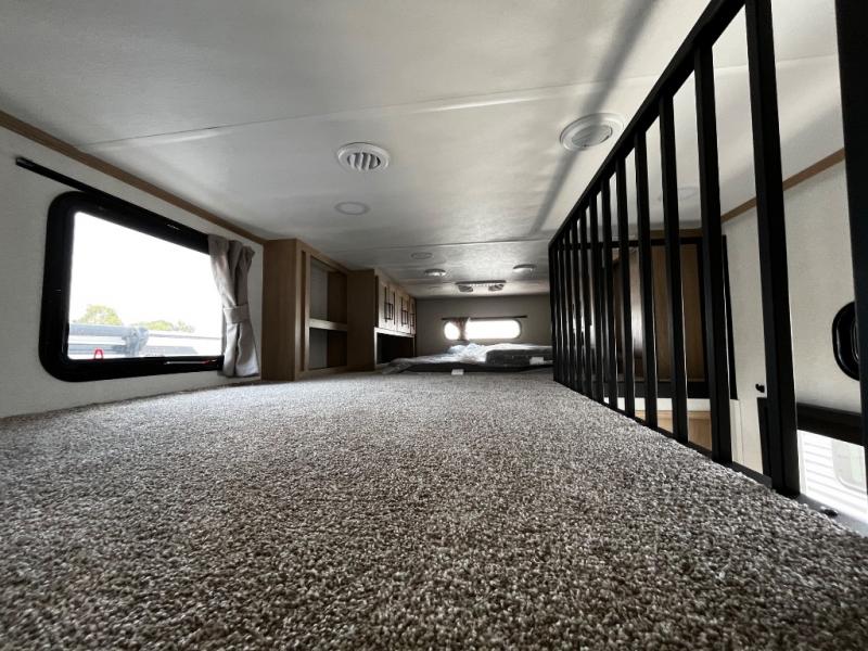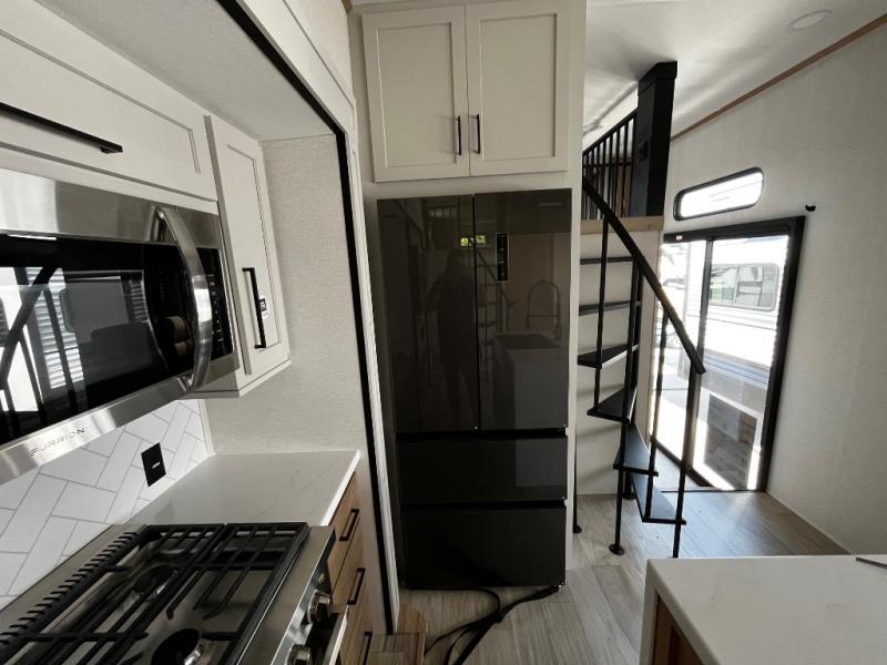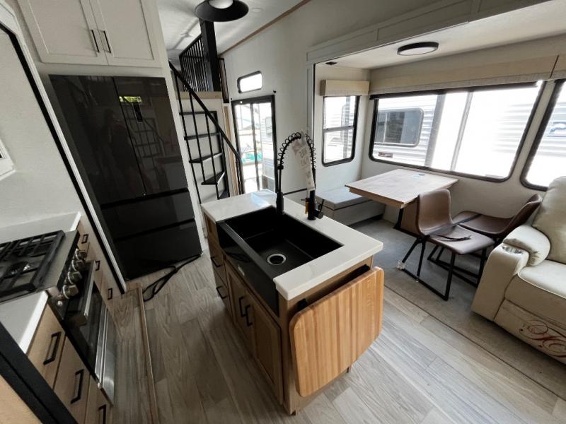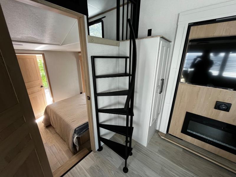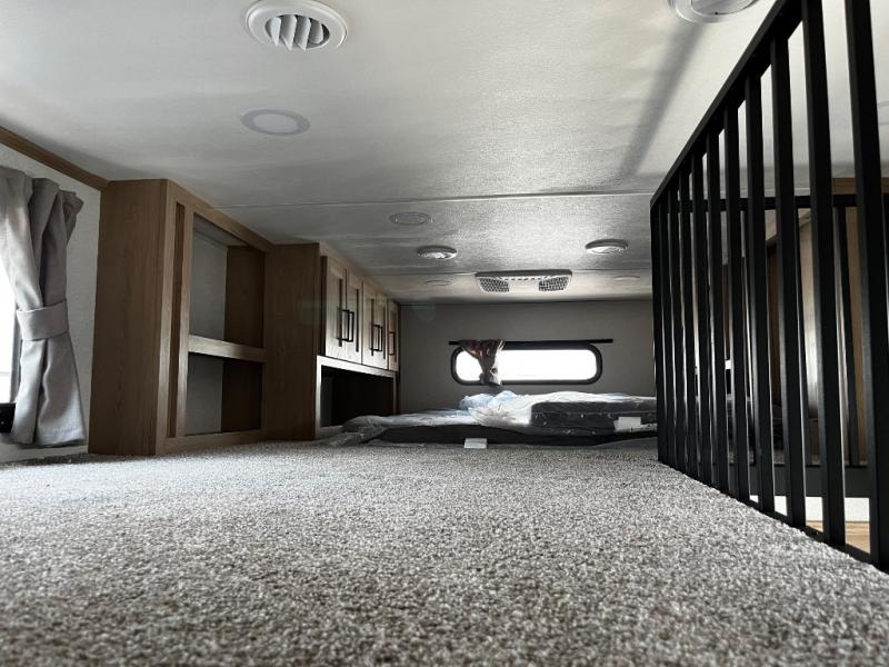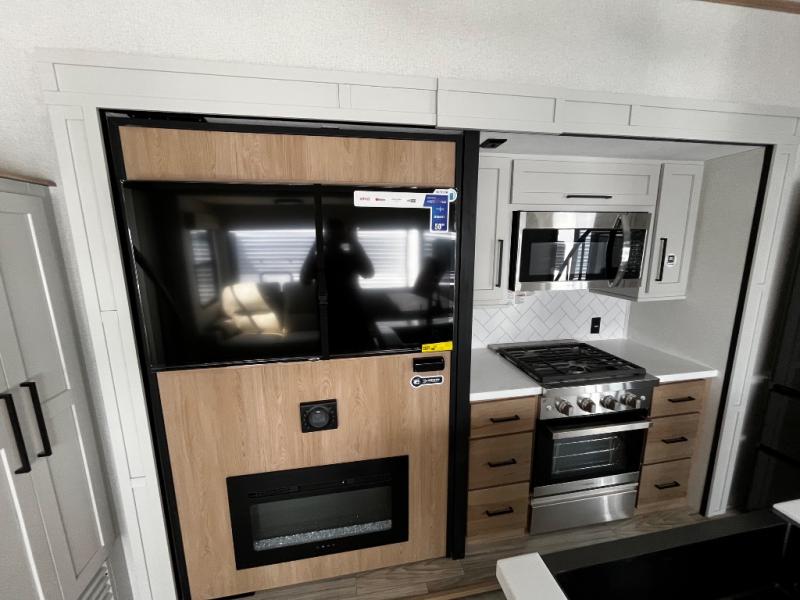 You won't believe the comfort and convenience found in this destination trailer. There are two private bedrooms; one up front with a queen bed slide out and storage space, and one in back with a queen bed slide out and a half bath! There is even washer and dryer prep here if you want to add those appliances and the second entry door is also found in this location so you can easily slip out in the morning. Above each of these rooms is a loft providing three total bunk mats for sleeping, storage cabinets, and TV prep in the front loft if you want to add entertainment. Everyone can meet in the combined kitchen and living room that includes dual opposing slides, a 60" theater seating across from a 50" flat screen TV and fireplace, plus a free-standing table with chairs and bench to dine at. The chef of your group will love the large kitchen island, free-standing range with four burners, and a 16.2 cu. ft. 12V stainless refrigerator for food storage.