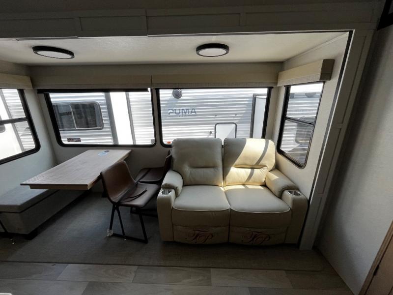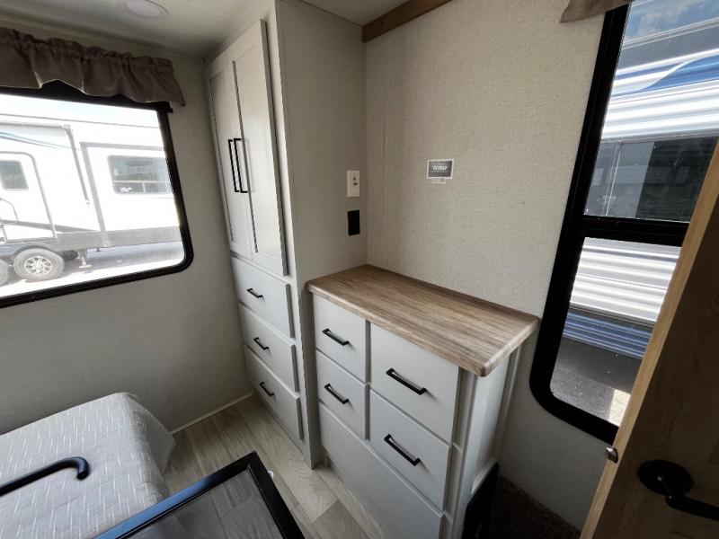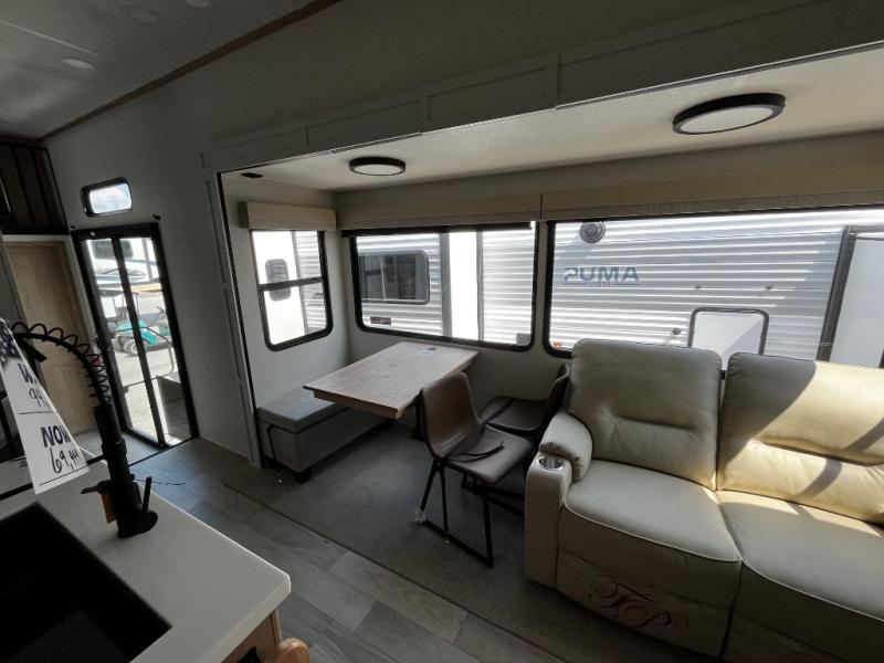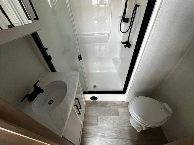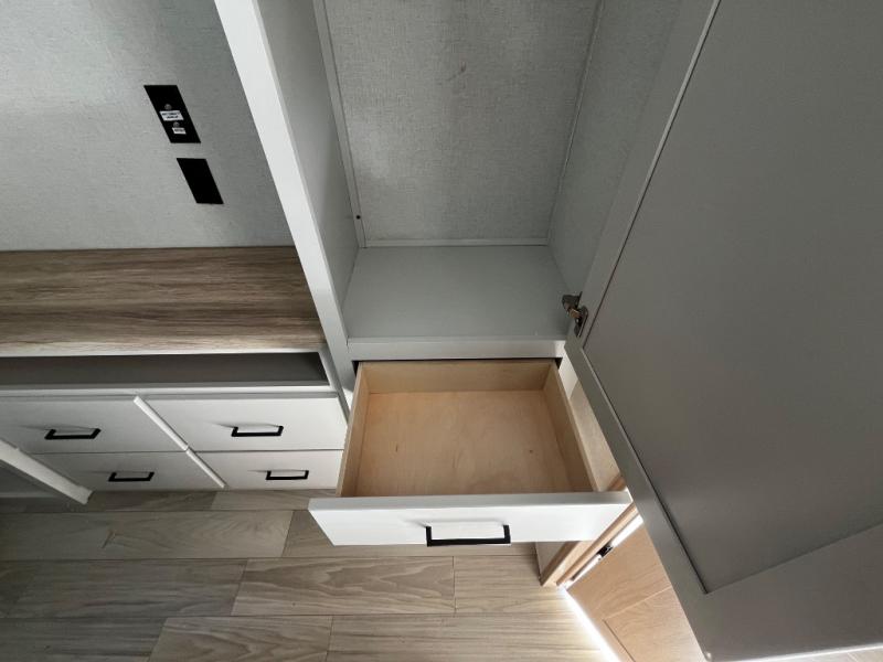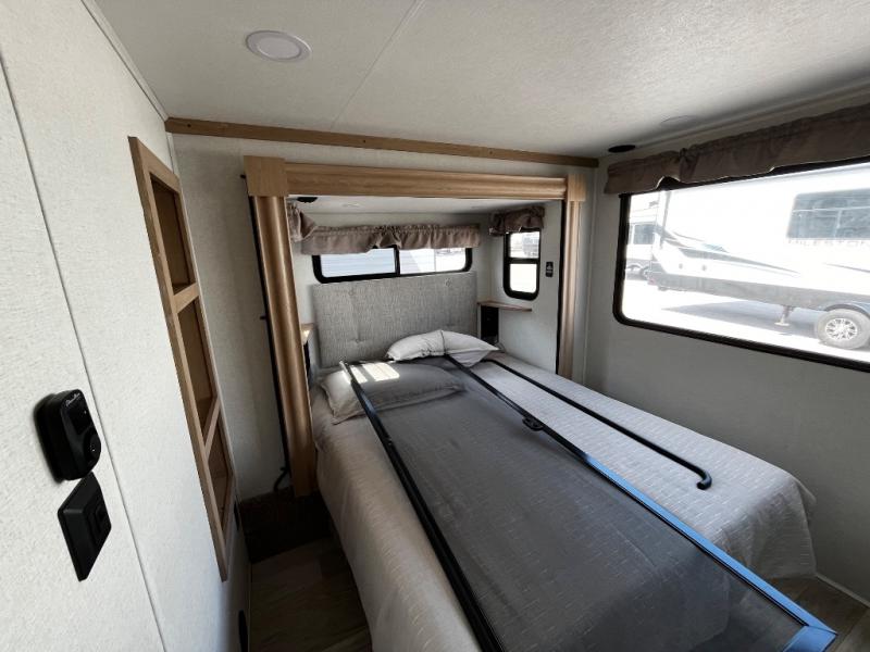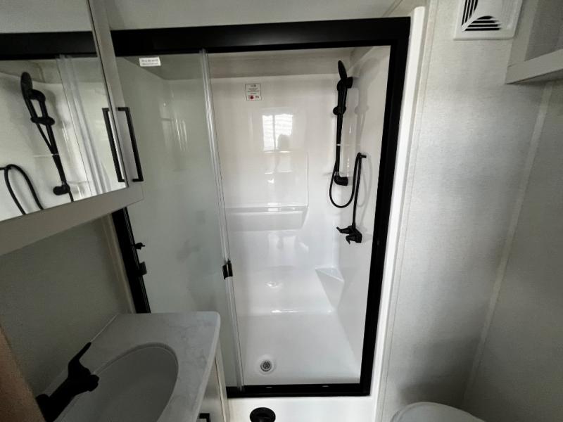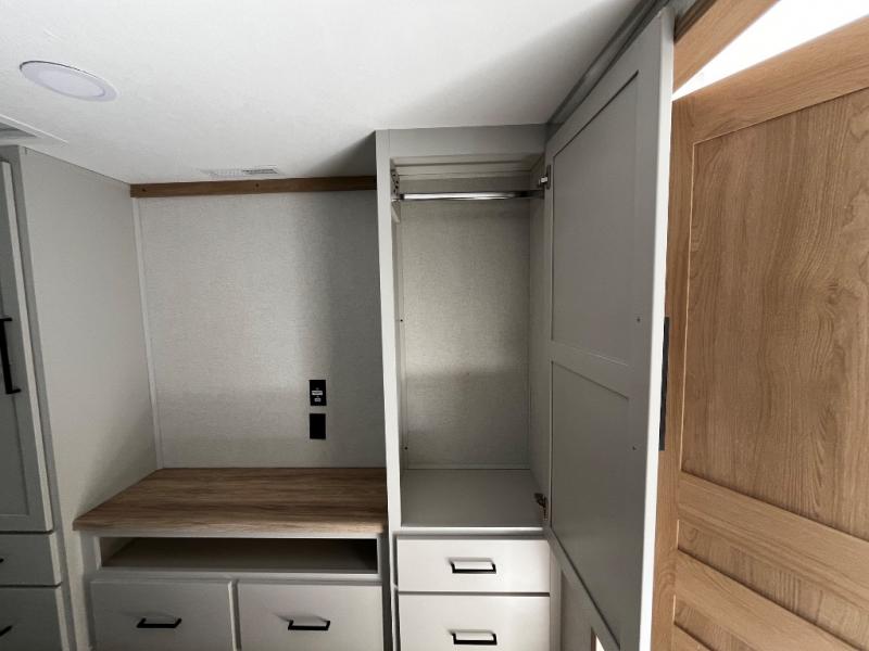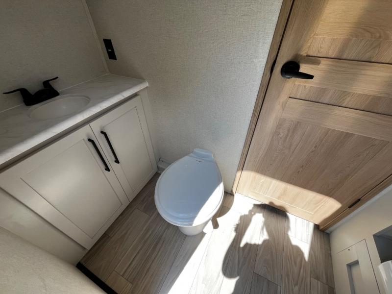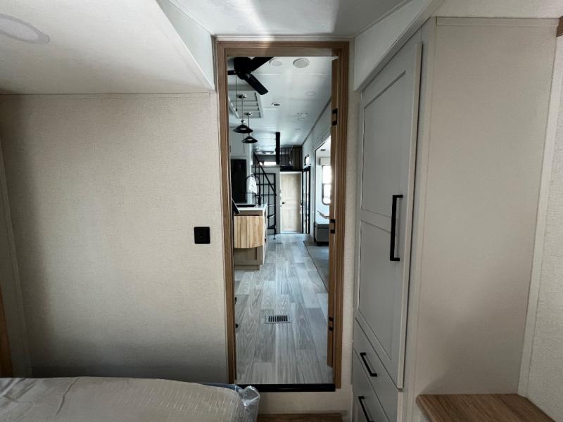 You won't believe the comfort and convenience found in this destination trailer. There are two private bedrooms; one up front with a queen bed slide out and storage space, and one in back with a queen bed slide out and a half bath! There is even washer and dryer prep here if you want to add those appliances and the second entry door is also found in this location so you can easily slip out in the morning. Above each of these rooms is a loft providing three total bunk mats for sleeping, storage cabinets, and TV prep in the front loft if you want to add entertainment. Everyone can meet in the combined kitchen and living room that includes dual opposing slides, a 60" theater seating across from a 50" flat screen TV and fireplace, plus a free-standing table with chairs and bench to dine at. The chef of your group will love the large kitchen island, free-standing range with four burners, and a 16.2 cu. ft. 12V stainless refrigerator for food storage.