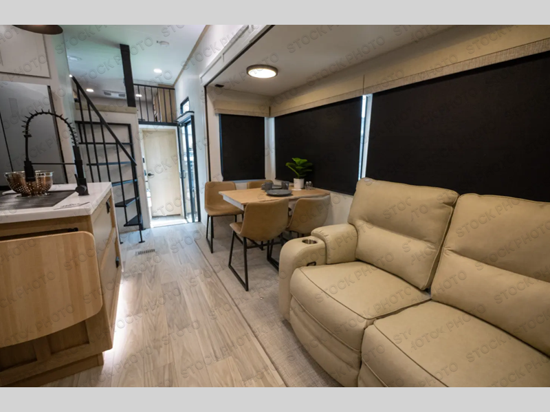 You won't believe the comfort and convenience found in this destination trailer. There are two private bedrooms; one up front with a queen bed slide out and storage space, and one in back with a queen bed slide out and a half bath! There is even washer and dryer prep here if you want to add those appliances and the second entry door is also found in this location so you can easily slip out in the morning. Above each of these rooms is a loft providing three total bunk mats for sleeping, storage cabinets, and TV prep in the front loft if you want to add entertainment. Everyone can meet in the combined kitchen and living room that includes dual opposing slides, a 60" theater seating across from a 50" flat screen TV and fireplace, plus a free-standing table with chairs and bench to dine at. The chef of your group will love the large kitchen island, free-standing range with four burners, and a 16.2 cu. ft. 12V stainless refrigerator for food storage.
