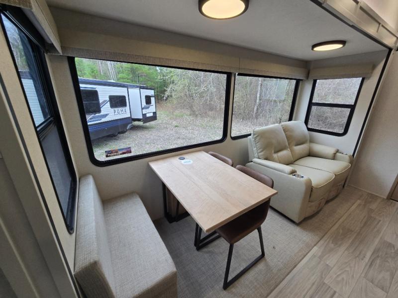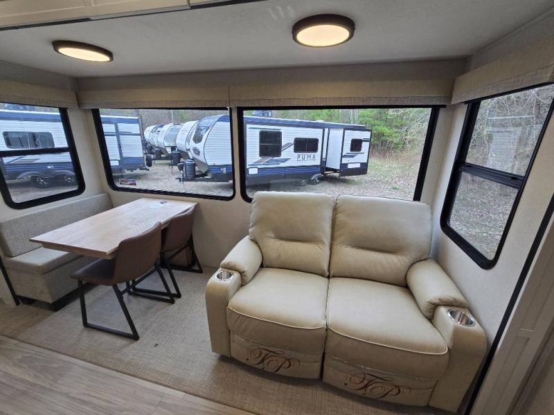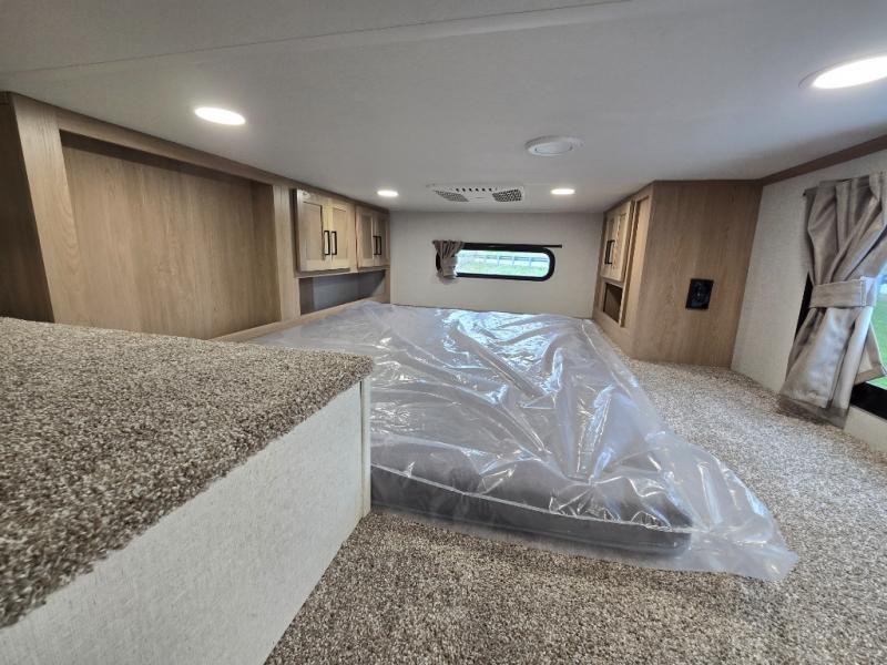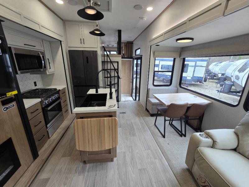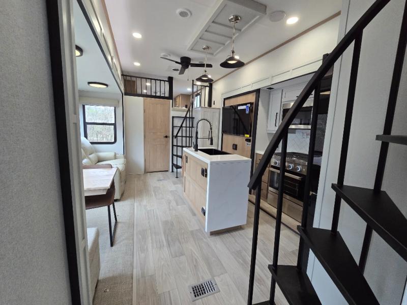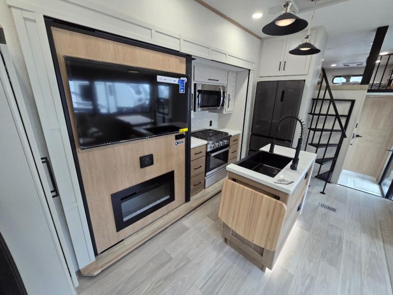 You won't believe the comfort and convenience found in this destination trailer. There are two private bedrooms; one up front with a queen bed slide out and storage space, and one in back with a queen bed slide out and a half bath! There is even washer and dryer prep here if you want to add those appliances and the second entry door is also found in this location so you can easily slip out in the morning. Above each of these rooms is a loft providing three total bunk mats for sleeping, storage cabinets, and TV prep in the front loft if you want to add entertainment. Everyone can meet in the combined kitchen and living room that includes dual opposing slides, a 60" theater seating across from a 50" flat screen TV and fireplace, plus a free-standing table with chairs and bench to dine at. The chef of your group will love the large kitchen island, free-standing range with four burners, and a 16.2 cu. ft. 12V stainless refrigerator for food storage.
