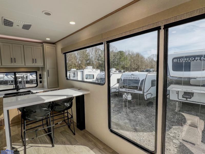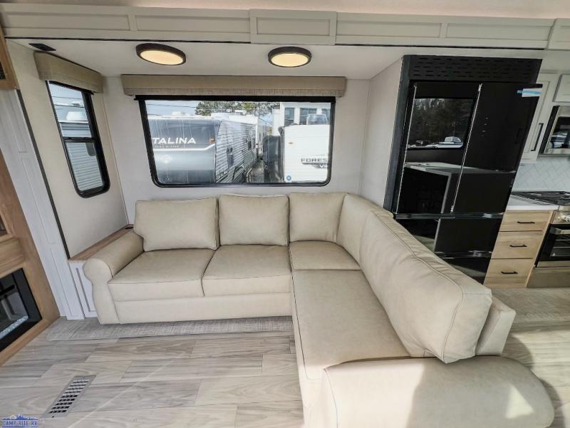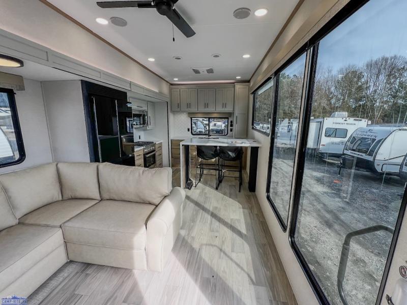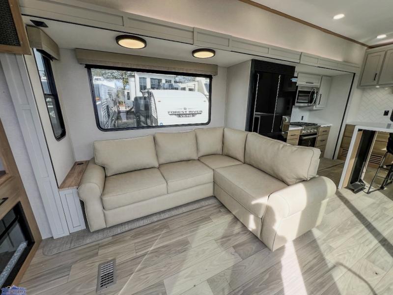 With each Sierra Destination Trailer by Forest River you will enjoy many luxurious features, such as crown molding over the kitchen cabinets, solid surface kitchen countertops, a memory foam mattress, plus so much more. The extra large picture windows throughout let natural light in and provide beautiful outdoor views, and each model includes three or more slides for added interior space. You'll find many exterior conveniences, like the porch light with an interior switch, the rain gutters with extra long drip spouts to prevent black streaking, and an electric awning with LED light strip, plus more! You will stay comfortable year around with dual 15,000 A/C units and the high-efficiency radiant foil in the roof and floor, plus each model is constructed with an Underbelly Armor for better insulation!