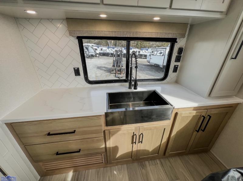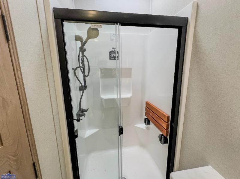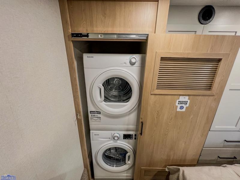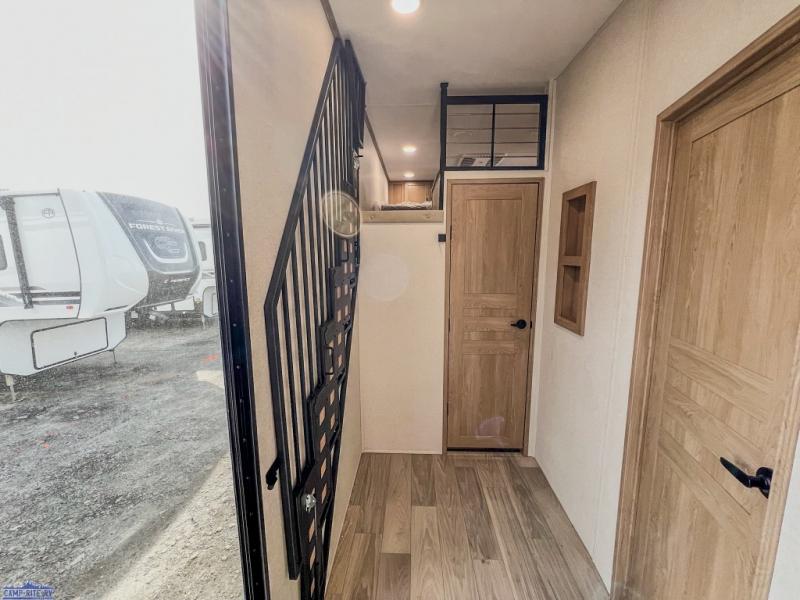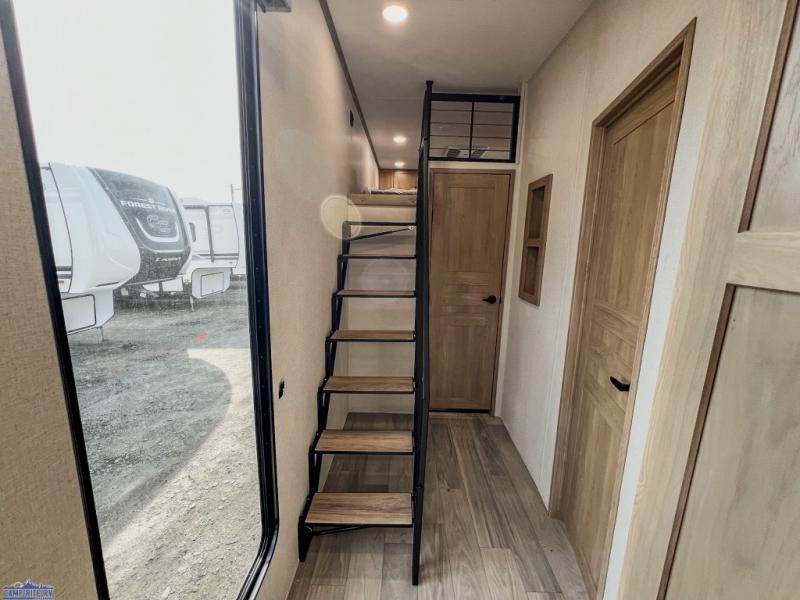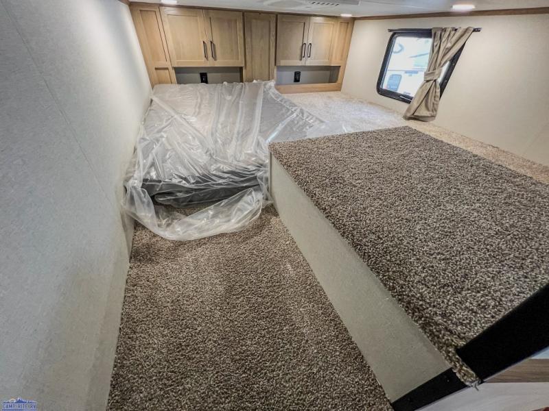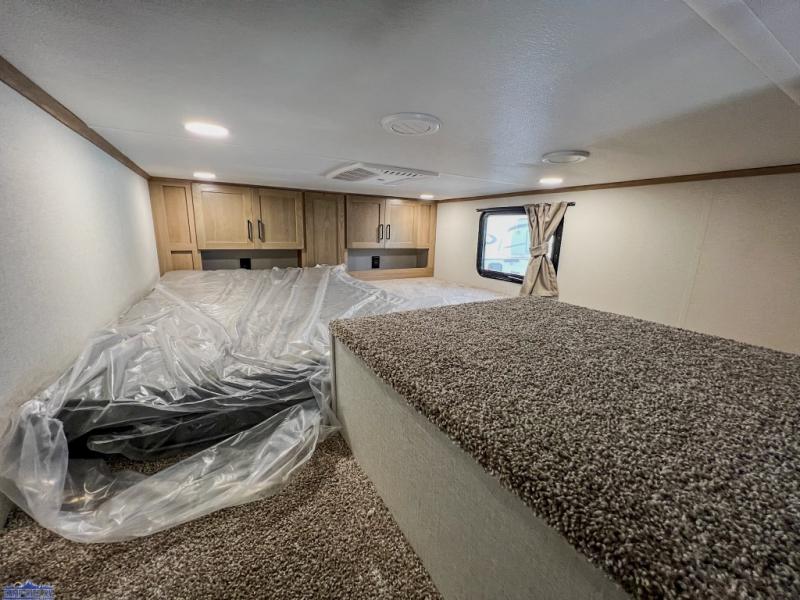 This incredible destination trailer has everything you need to live life to the fullest. Imagine retreating to a peaceful rear bedroom, complete with a king bed, spacious wardrobe, closet with washer and dryer prep, dresser, and TV box, is the perfect sanctuary to rest and recharge. Unwind and pamper yourself in style in the incredible full bathroom, featuring a linen closet, medicine cabinets, and a fiberglass shower with a seat. The living room is the heart of the home, boasting a comfortable sectional sofa, ottoman, and entertainment center perfect for gathering with family or friends and creating unforgettable memories. The loft is a cozy retreat for kids or guests, featuring two bunk mats, and a dual wardrobe/bookcase, is the perfect place to read, play, or sleep. The front kitchen has a 19.6 cu refrigerator, overhead cabinet, microwave, three-burner cooktop, and free-standing dinette with chairs, and the pantry provides ample storage for all your favorite foods. Finally, step outside and enjoy the shade and protection of the 17’ and 21’ awnings and the two entry and two exit doors will make it easy to come and go.