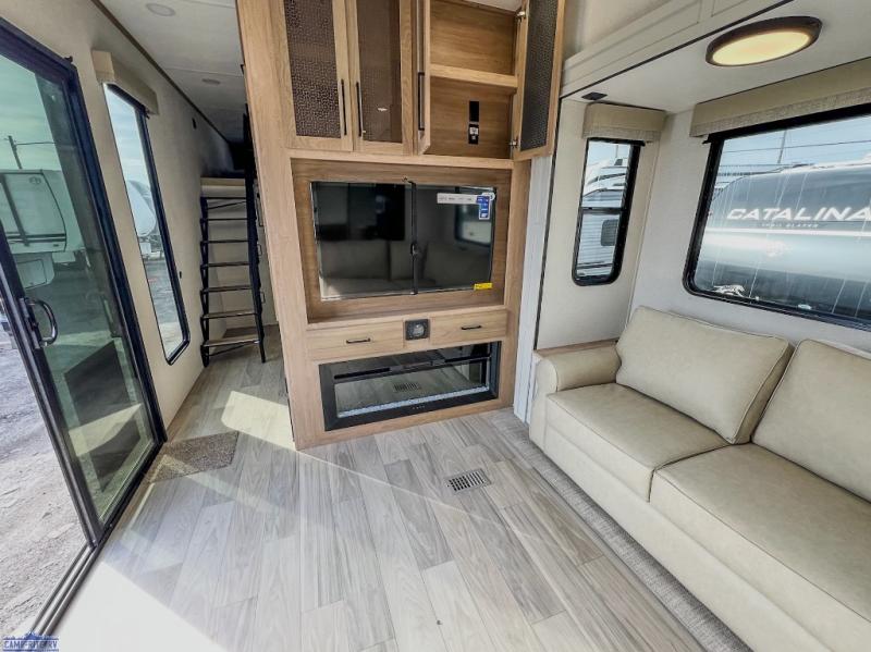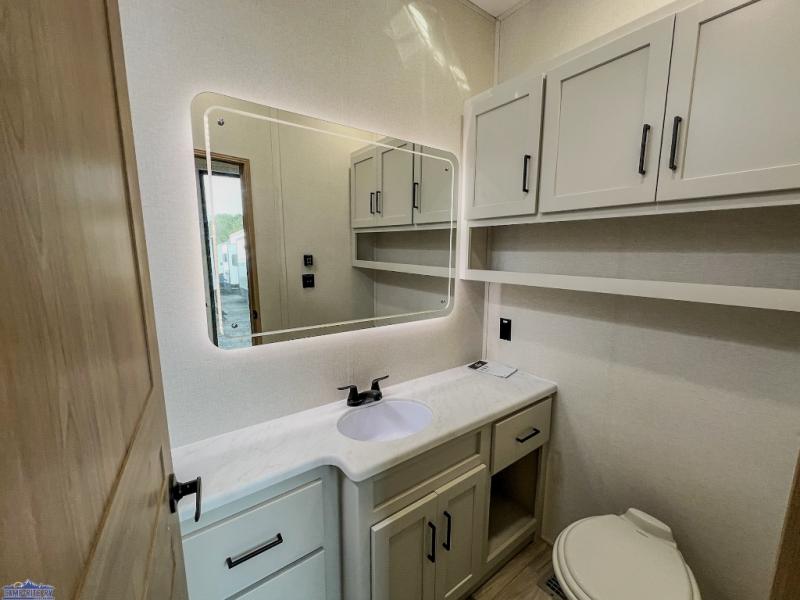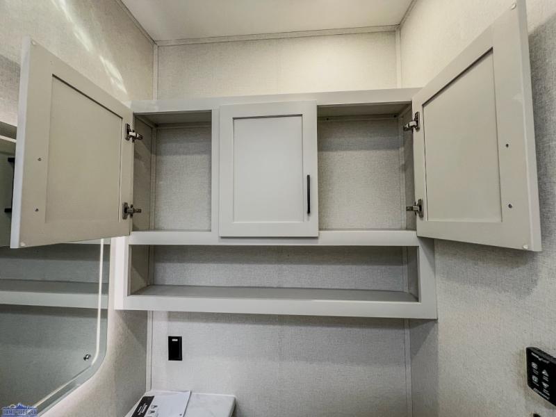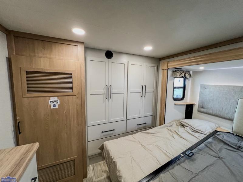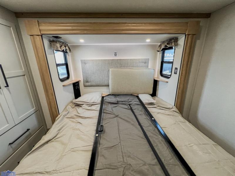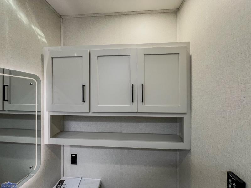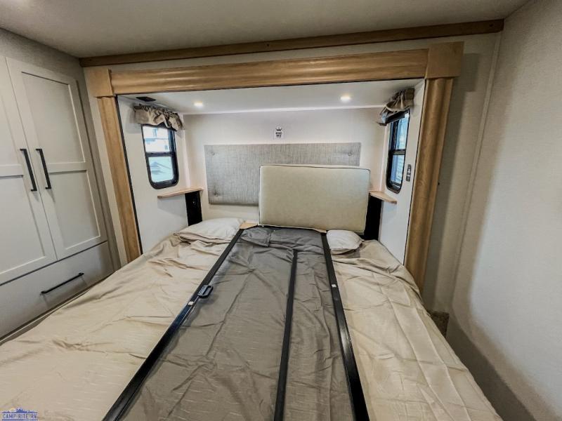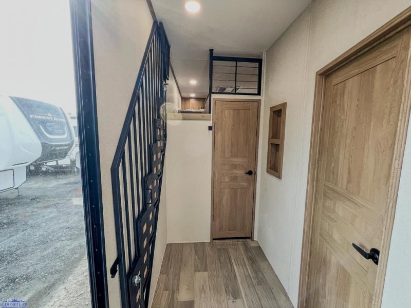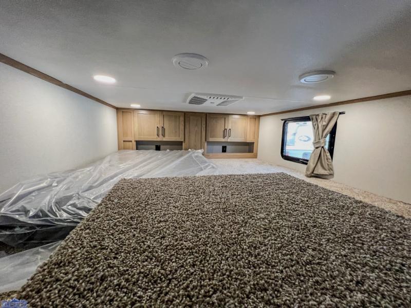 This incredible destination trailer has everything you need to live life to the fullest. Imagine retreating to a peaceful rear bedroom, complete with a king bed, spacious wardrobe, plus a closet with washer and dryer prep. Unwind and pamper yourself in style in the incredible full bathroom, featuring a linen closet, medicine cabinets, and a fiberglass shower with a seat. The living room is the heart of the home, boasting a comfortable sectional sofa, ottoman, and entertainment center perfect for gathering with family or friends and creating unforgettable memories. The loft is a cozy retreat for kids or guests, featuring two bunk mats, and a dual wardrobe/bookcases for their things. The front kitchen has a 19 cu. ft. refrigerator, overhead cabinet, microwave, three-burner cooktop, and free-standing dinette with a waterfall edge, and the pantry provides ample storage for all your favorite foods. Finally, step outside and enjoy the shade and protection of the two awnings and the two entry and two exit doors will make it easy to come and go.