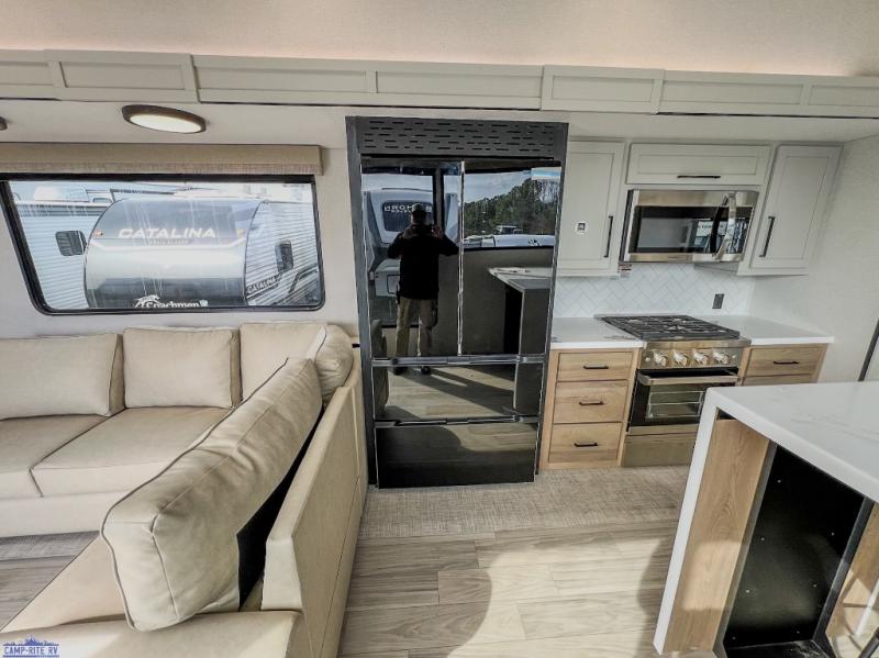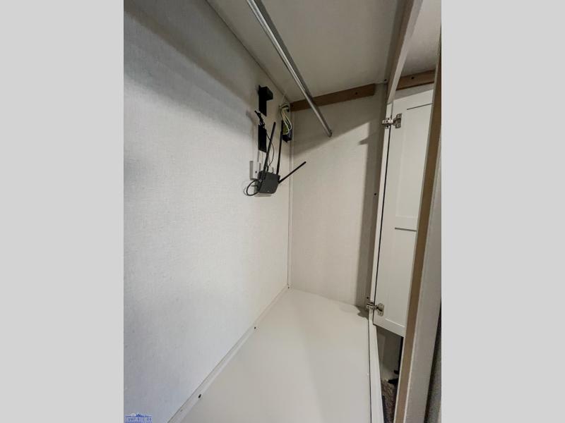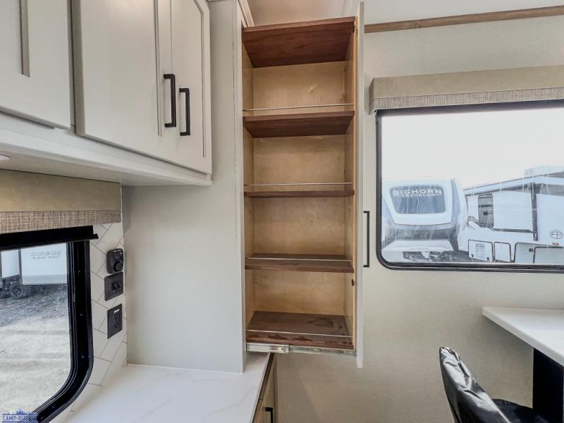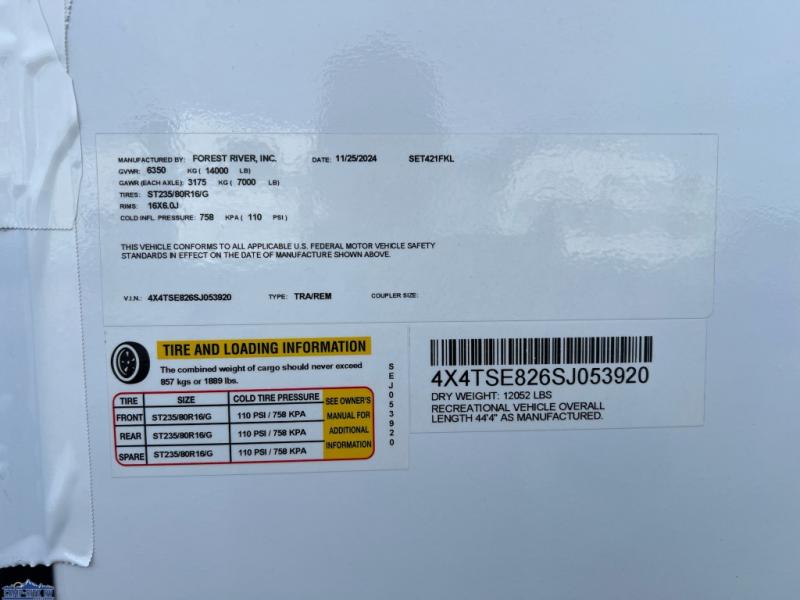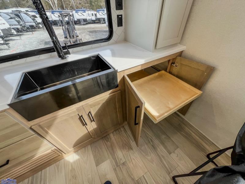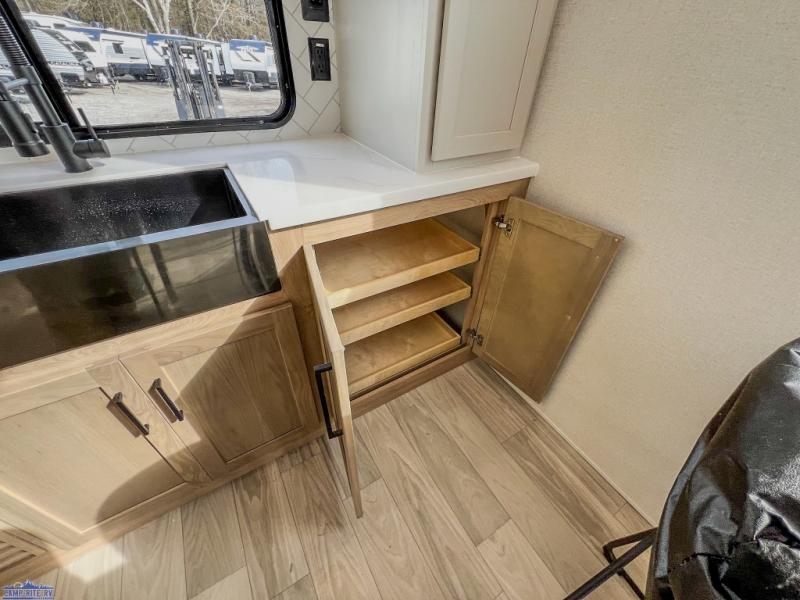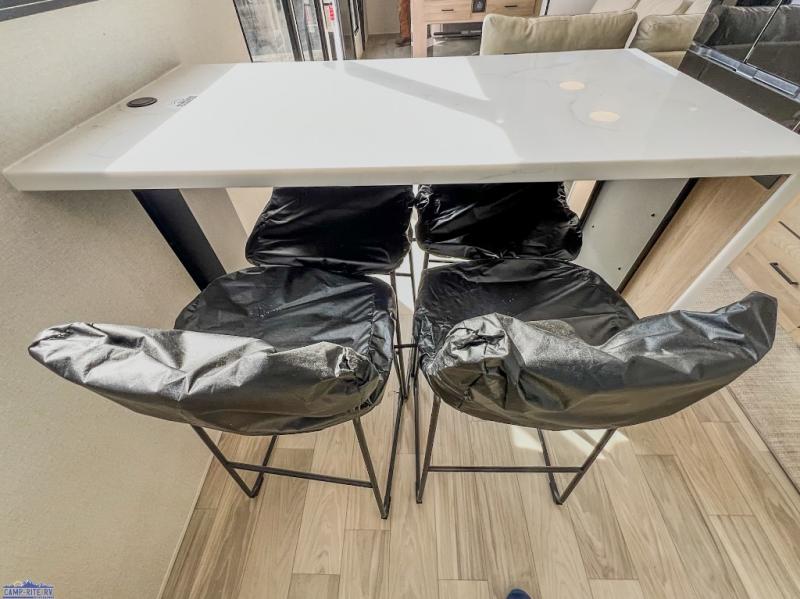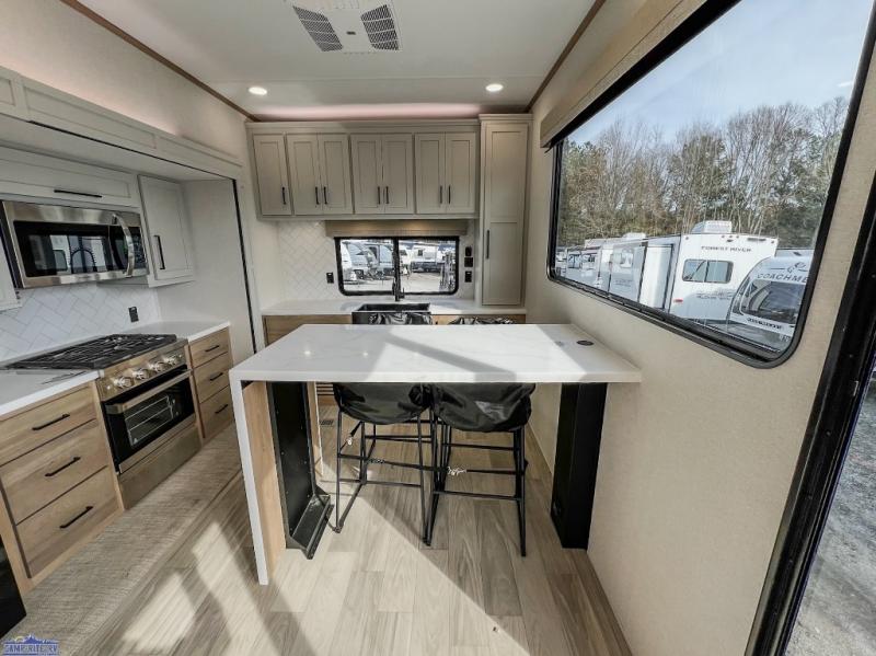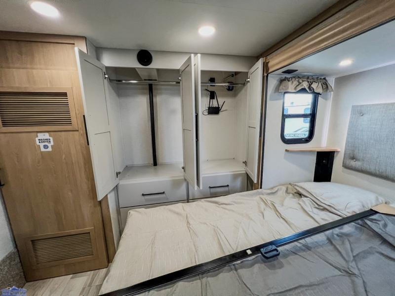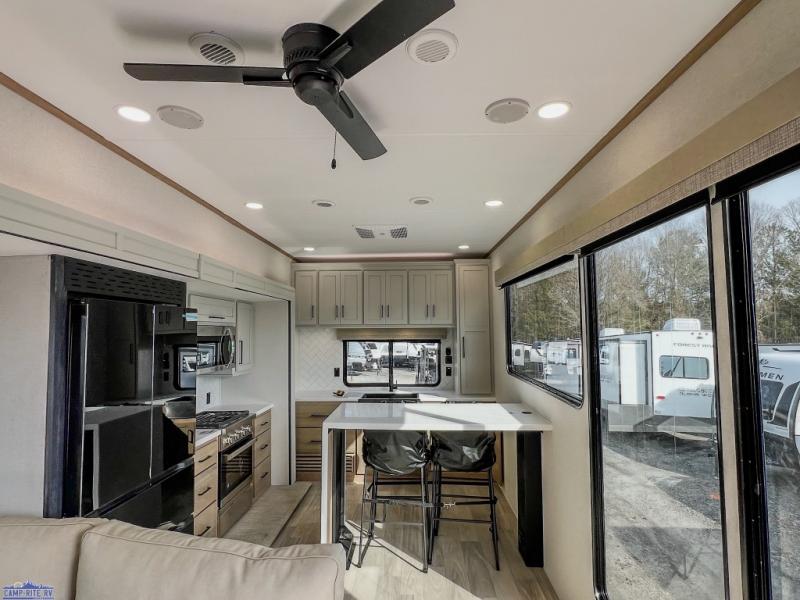This incredible destination trailer has everything you need to live life to the fullest. Imagine retreating to a peaceful rear bedroom, complete with a king bed, spacious wardrobe, plus a closet with washer and dryer prep. Unwind and pamper yourself in style in the incredible full bathroom, featuring a linen closet, medicine cabinets, and a fiberglass shower with a seat. The living room is the heart of the home, boasting a comfortable sectional sofa, ottoman, and entertainment center perfect for gathering with family or friends and creating unforgettable memories. The loft is a cozy retreat for kids or guests, featuring two bunk mats, and a dual wardrobe/bookcases for their things. The front kitchen has a 19 cu. ft. refrigerator, overhead cabinet, microwave, three-burner cooktop, and free-standing dinette with a waterfall edge, and the pantry provides ample storage for all your favorite foods. Finally, step outside and enjoy the shade and protection of the two awnings and the two entry and two exit doors will make it easy to come and go.