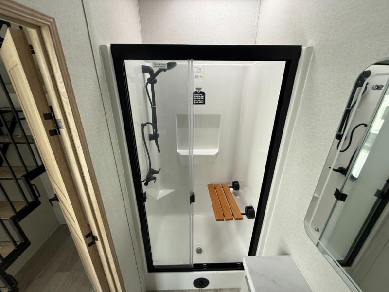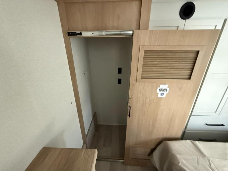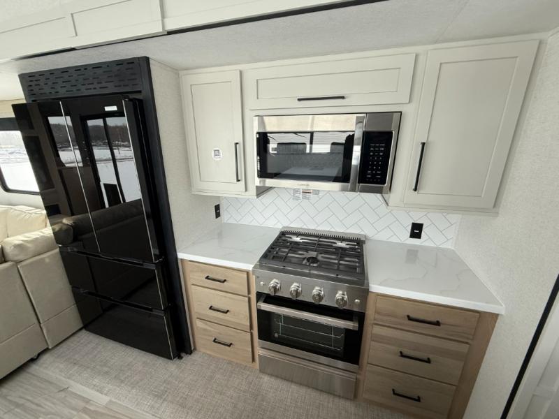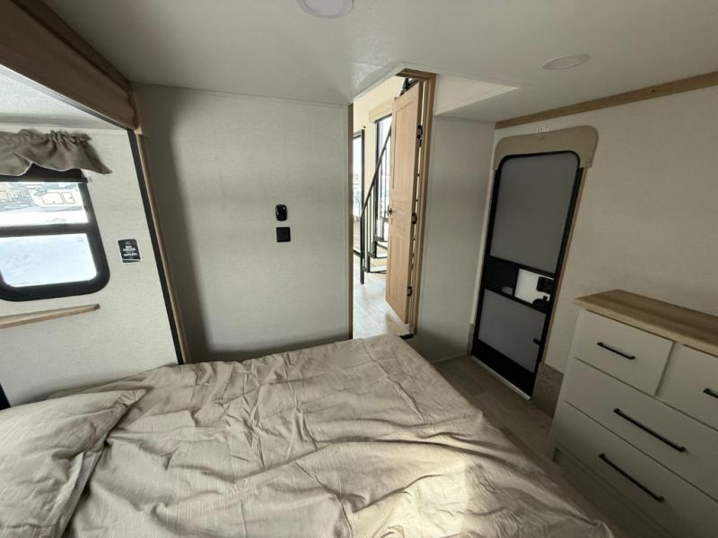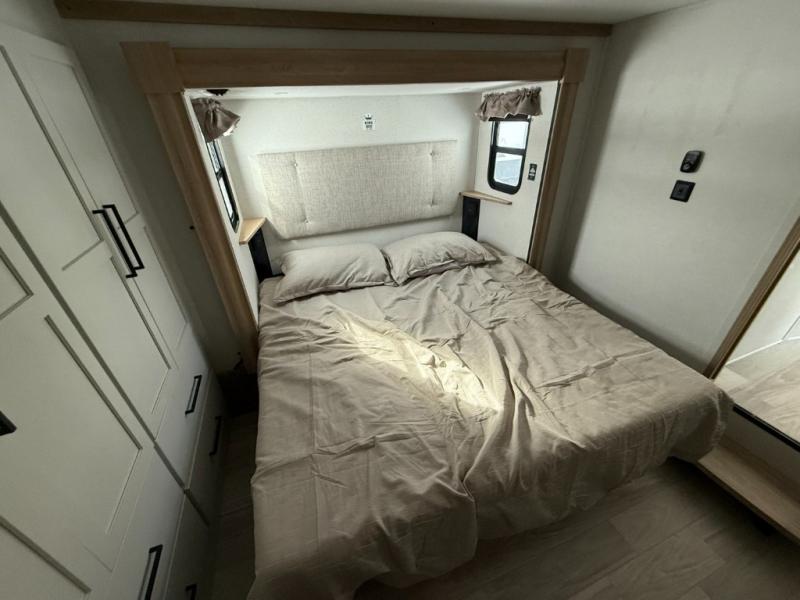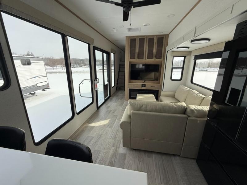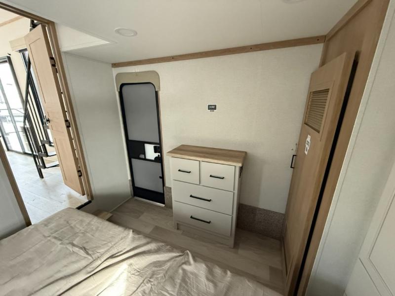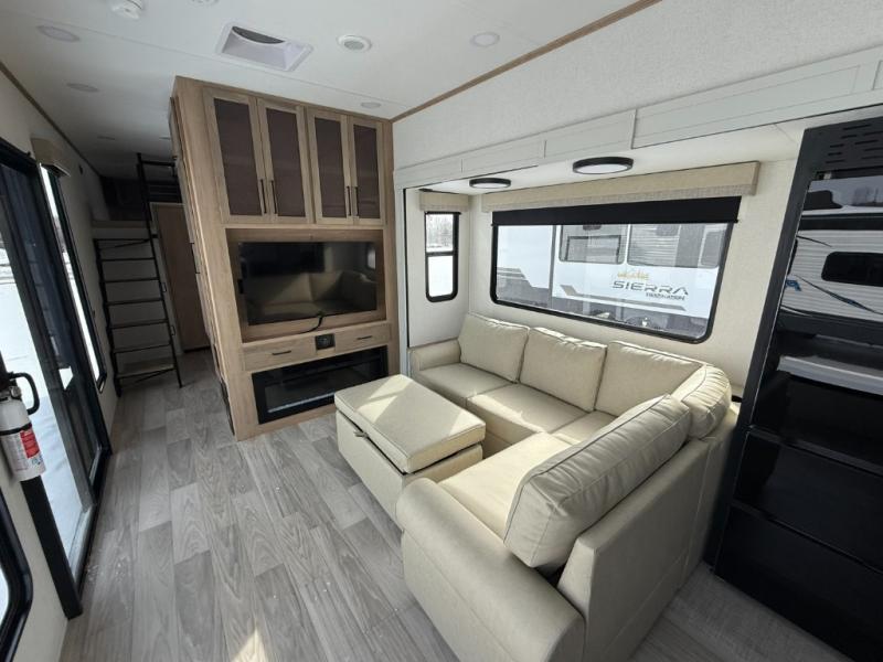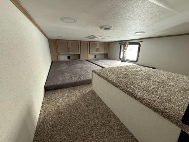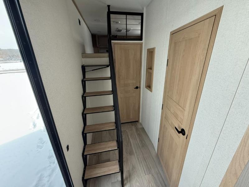 This incredible destination trailer has everything you need to live life to the fullest. Imagine retreating to a peaceful rear bedroom, complete with a king bed, spacious wardrobe, plus a closet with washer and dryer prep. Unwind and pamper yourself in style in the incredible full bathroom, featuring a linen closet, medicine cabinets, and a fiberglass shower with a seat. The living room is the heart of the home, boasting a comfortable sectional sofa, ottoman, and entertainment center perfect for gathering with family or friends and creating unforgettable memories. The loft is a cozy retreat for kids or guests, featuring two bunk mats, and a dual wardrobe/bookcases for their things. The front kitchen has a 19 cu. ft. refrigerator, overhead cabinet, microwave, three-burner cooktop, and free-standing dinette with a waterfall edge, and the pantry provides ample storage for all your favorite foods. Finally, step outside and enjoy the shade and protection of the two awnings and the two entry and two exit doors will make it easy to come and go.
