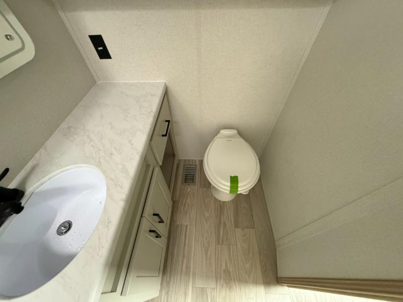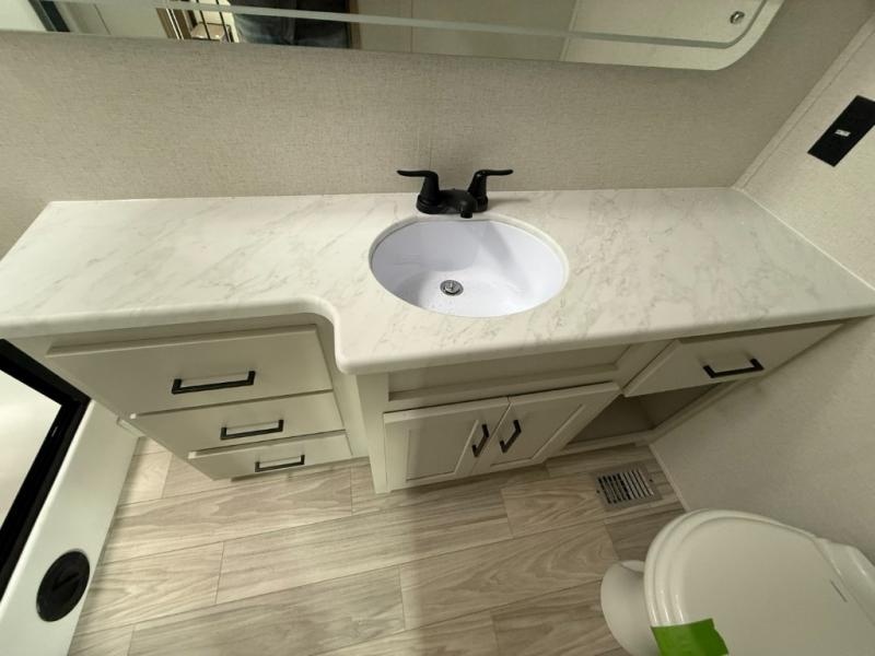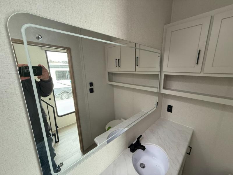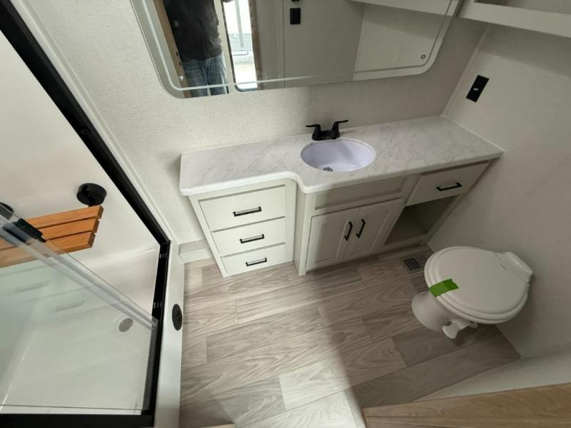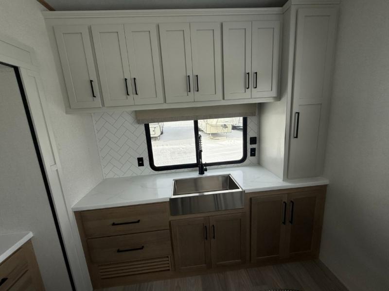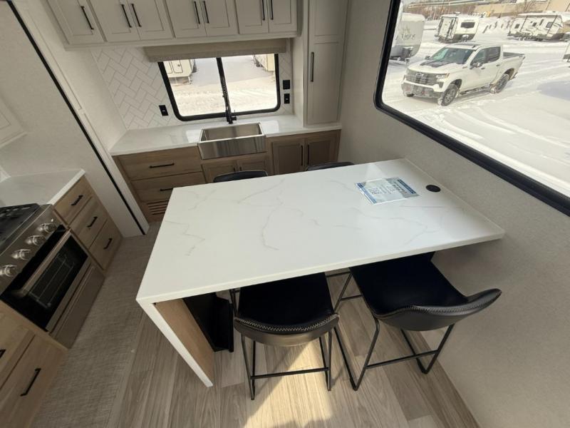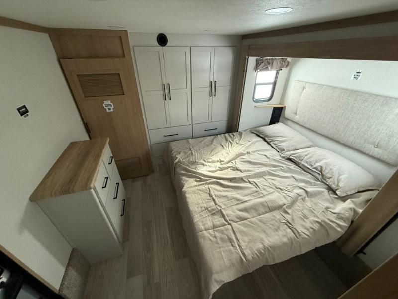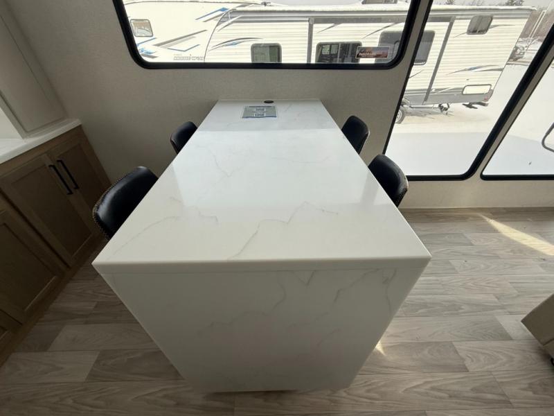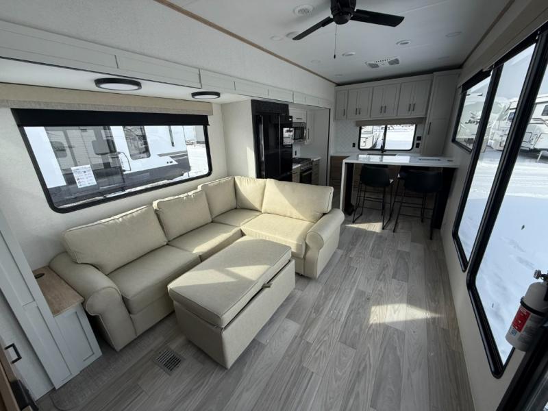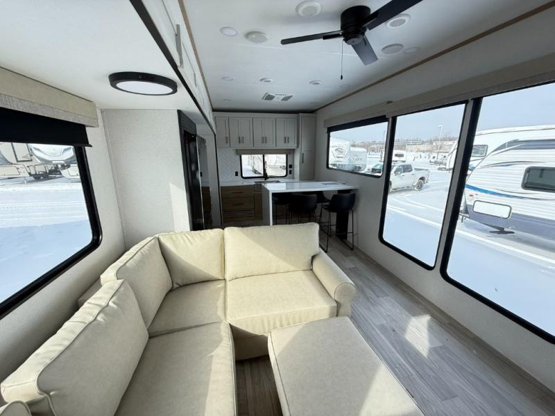 This incredible destination trailer has everything you need to live life to the fullest. Imagine retreating to a peaceful rear bedroom, complete with a king bed, spacious wardrobe, plus a closet with washer and dryer prep. Unwind and pamper yourself in style in the incredible full bathroom, featuring a linen closet, medicine cabinets, and a fiberglass shower with a seat. The living room is the heart of the home, boasting a comfortable sectional sofa, ottoman, and entertainment center perfect for gathering with family or friends and creating unforgettable memories. The loft is a cozy retreat for kids or guests, featuring two bunk mats, and a dual wardrobe/bookcases for their things. The front kitchen has a 19 cu. ft. refrigerator, overhead cabinet, microwave, three-burner cooktop, and free-standing dinette with a waterfall edge, and the pantry provides ample storage for all your favorite foods. Finally, step outside and enjoy the shade and protection of the two awnings and the two entry and two exit doors will make it easy to come and go.