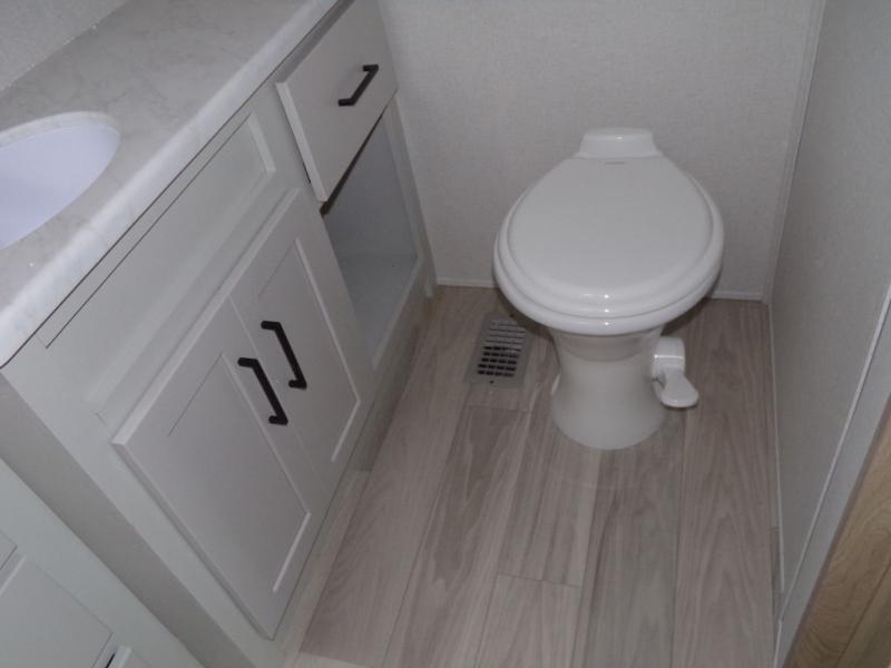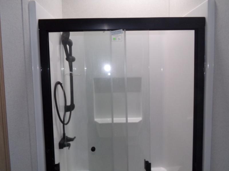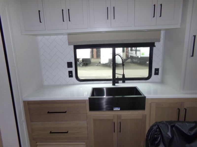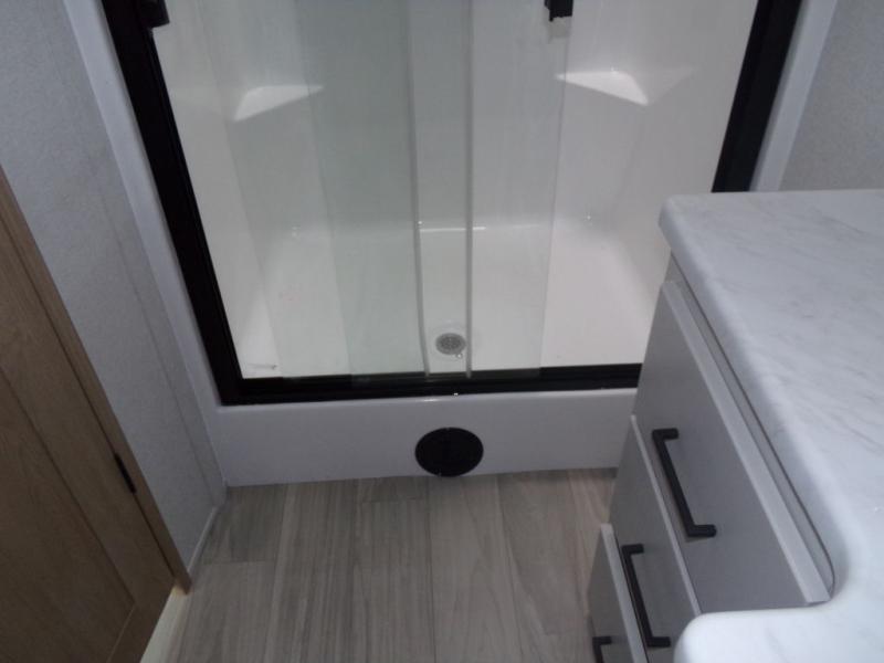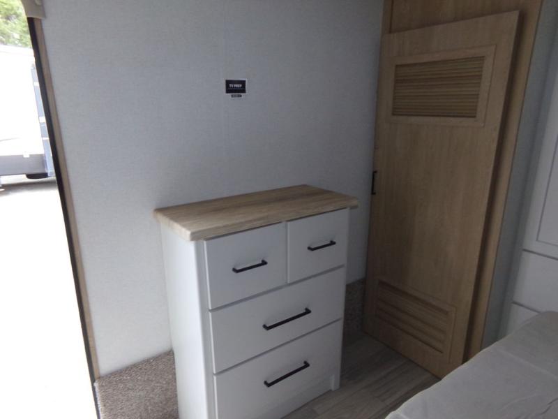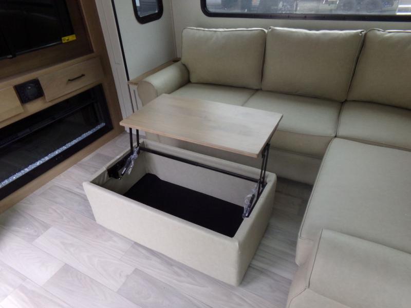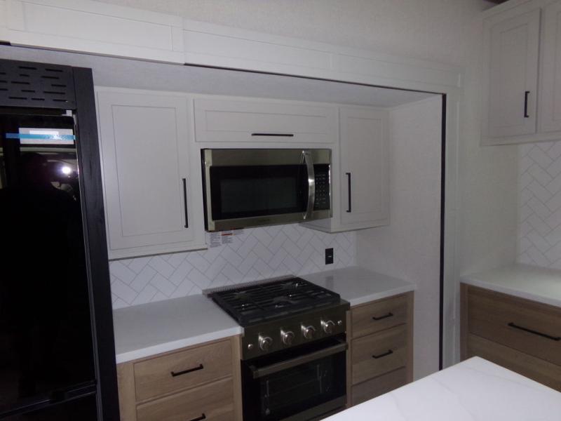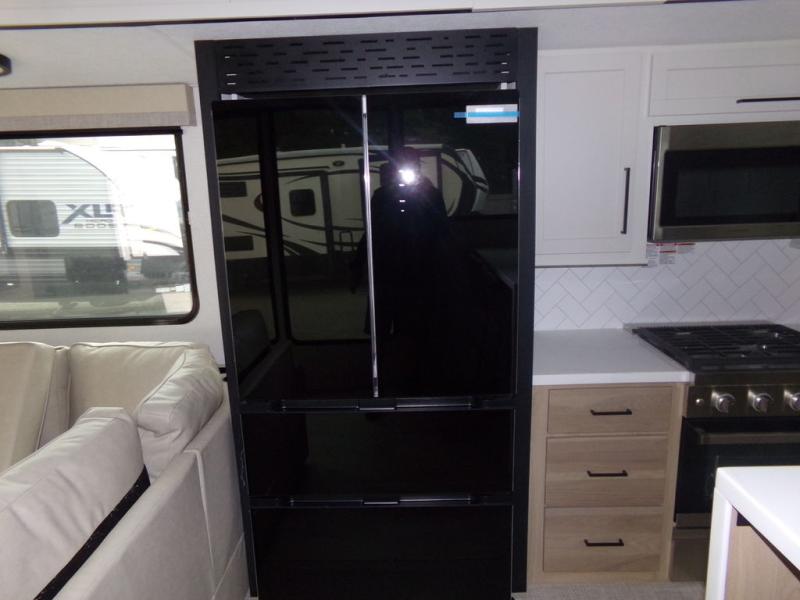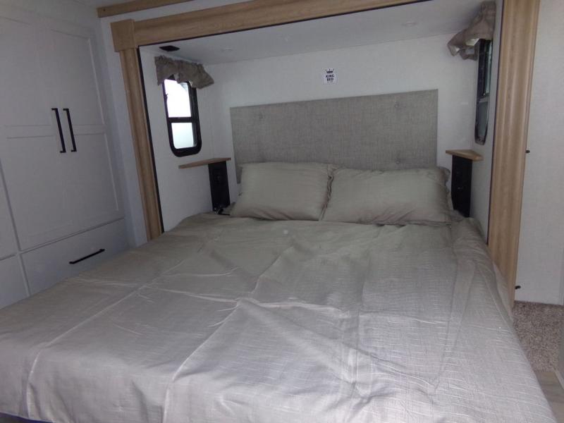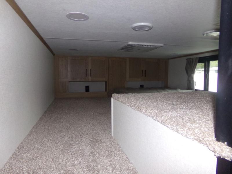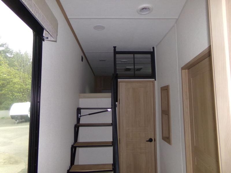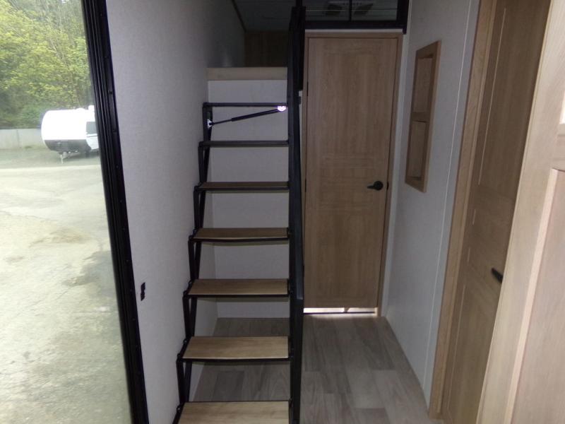 This incredible destination trailer has everything you need to live life to the fullest. Imagine retreating to a peaceful rear bedroom, complete with a king bed, spacious wardrobe, closet with washer and dryer prep, dresser, and TV box, is the perfect sanctuary to rest and recharge. Unwind and pamper yourself in style in the incredible full bathroom, featuring a linen closet, medicine cabinets, and a fiberglass shower with a seat. The living room is the heart of the home, boasting a comfortable sectional sofa, ottoman, and entertainment center perfect for gathering with family or friends and creating unforgettable memories. The loft is a cozy retreat for kids or guests, featuring two bunk mats, and a dual wardrobe/bookcase, is the perfect place to read, play, or sleep. The front kitchen has a 19.6 cu refrigerator, overhead cabinet, microwave, three-burner cooktop, and free-standing dinette with chairs, and the pantry provides ample storage for all your favorite foods. Finally, step outside and enjoy the shade and protection of the 17’ and 21’ awnings and the two entry and two exit doors will make it easy to come and go.