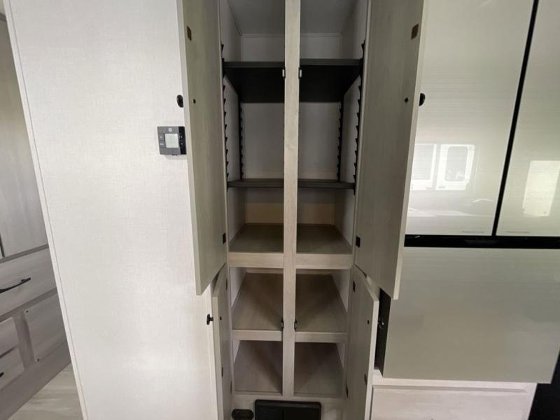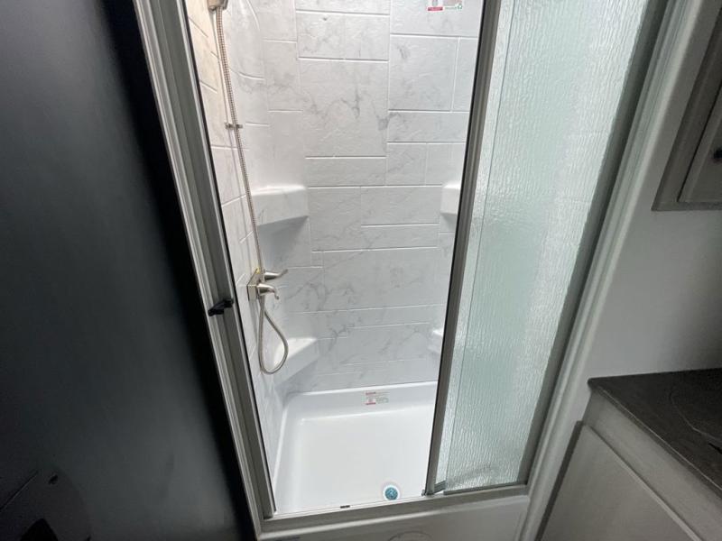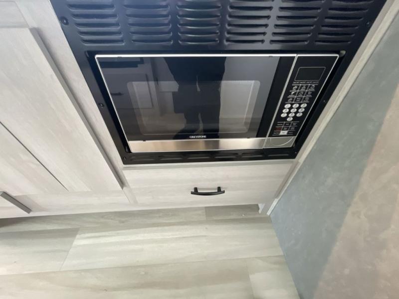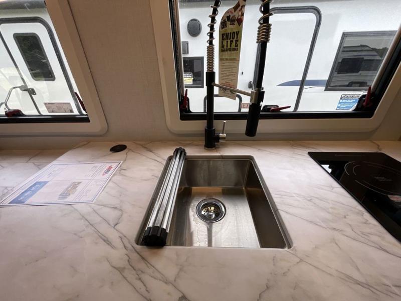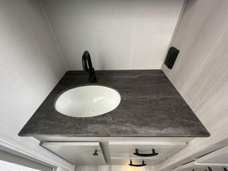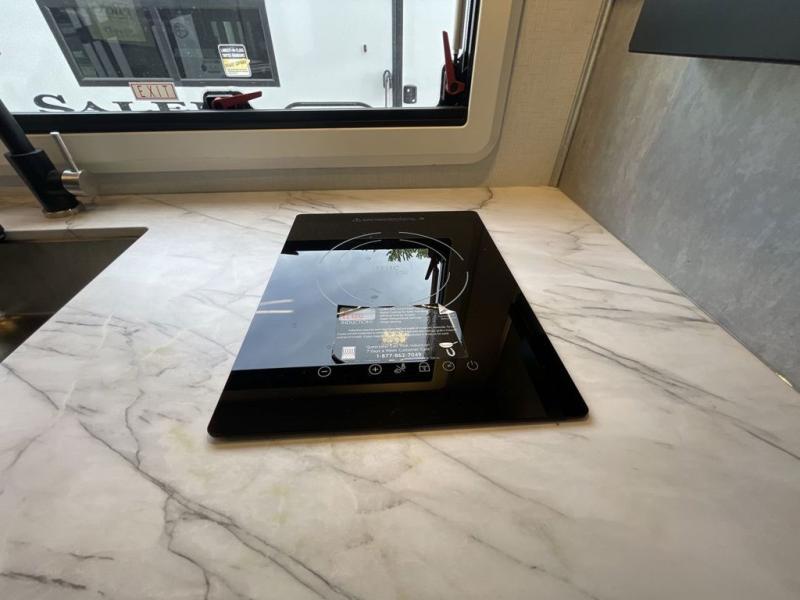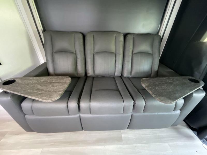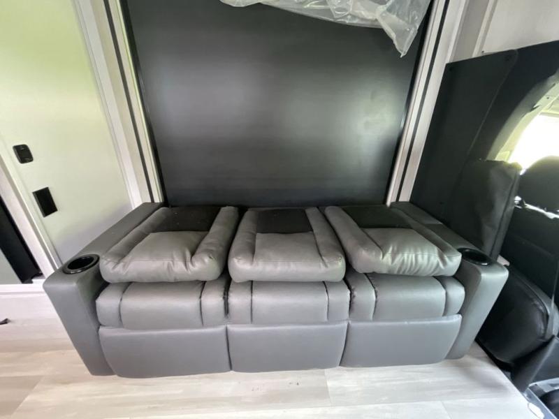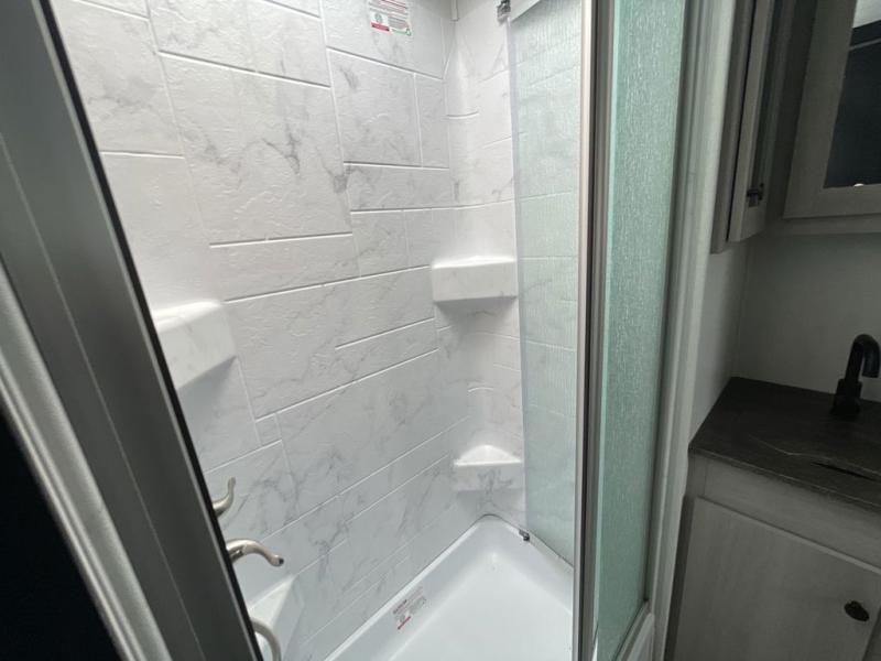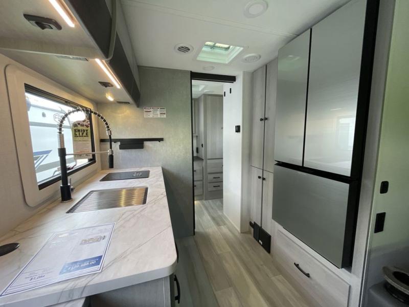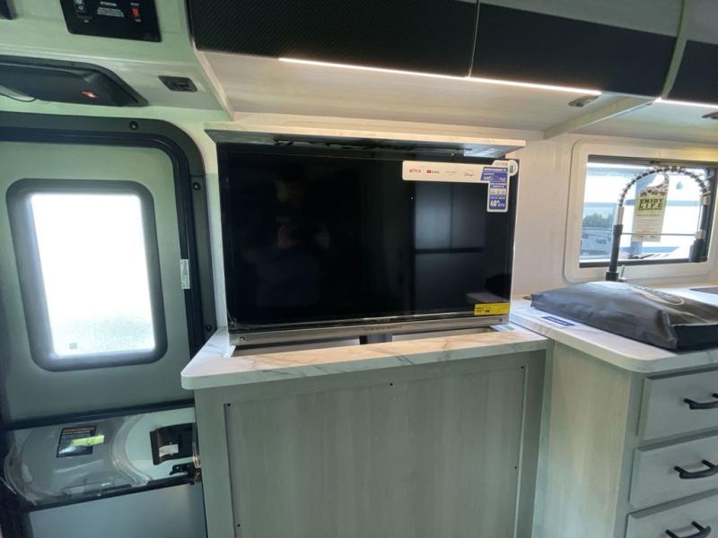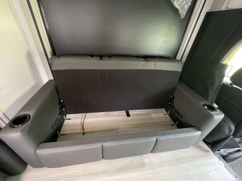 Head out on a luxurious vacation in this motorhome! Stay squeaky clean with a full rear bathroom that has a 24" x 36" shower featuring an oxygen-infused shower head with flexible extension and a skylight above for added natural lighting. There is also a bath wardrobe and linen closet for ample storage space. The 62.5" x 59.5" Murphy bed creates versatility by offering a comfortable place to lay your head at night and a sofa to relax during the day. You can prepare your best home cooked meals using the two burner cooktop and convection microwave oven, while you keep your food fresh in the 10.7 cu. ft. 12V refrigerator! The front cab is only available with the Trekker Cap option on this model; see dealer for more details!