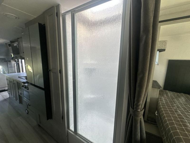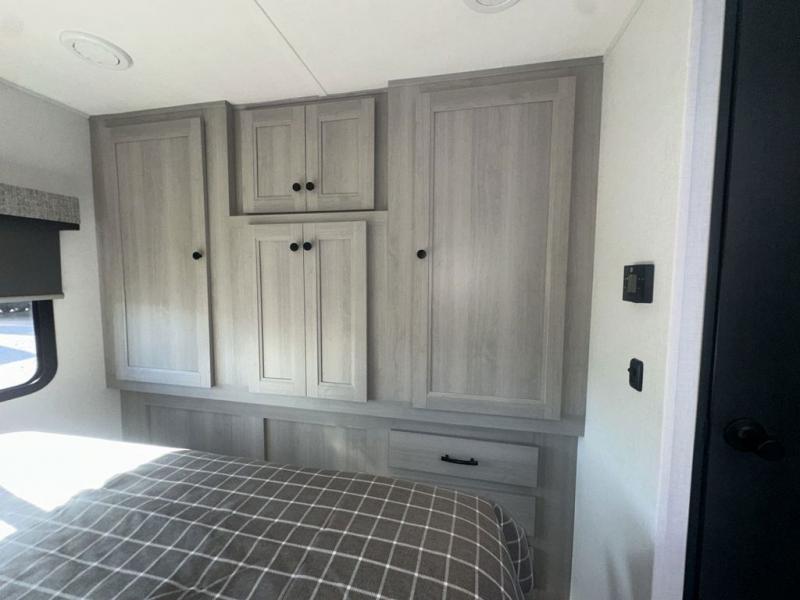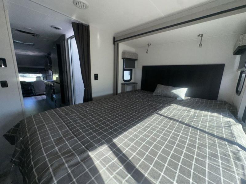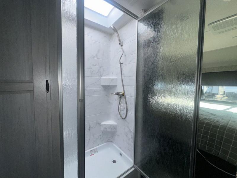 Pack your bags and pick your favorite destination then head out in this motorhome! The rear private bedroom has a 60" x 74" queen bed slide for more interior space, and a linen closet with wardrobes on either side of it. There is also a split-style bath with a private toilet and sink, and the shower is right across the hall. Prepare your best home cooked meals using the three burner cooktop, enjoy dining at the U-shaped dinette, and store any leftovers in the 10.7 cu. ft. 12V refrigerator. You will also appreciate the flip-up countertop for more meal prepping space. Relax each evening on the 66" sofa, or you can replace it for the optional power theater seating. There is even a 60" x 80" bunk over the cab for extra sleeping or storage space!