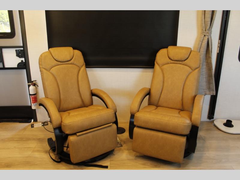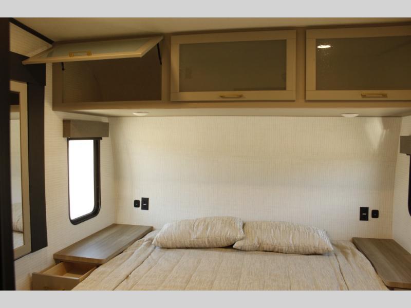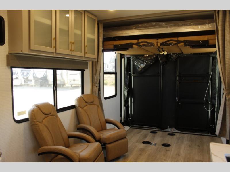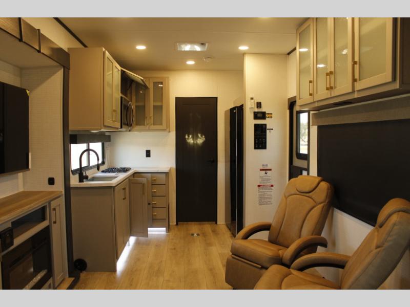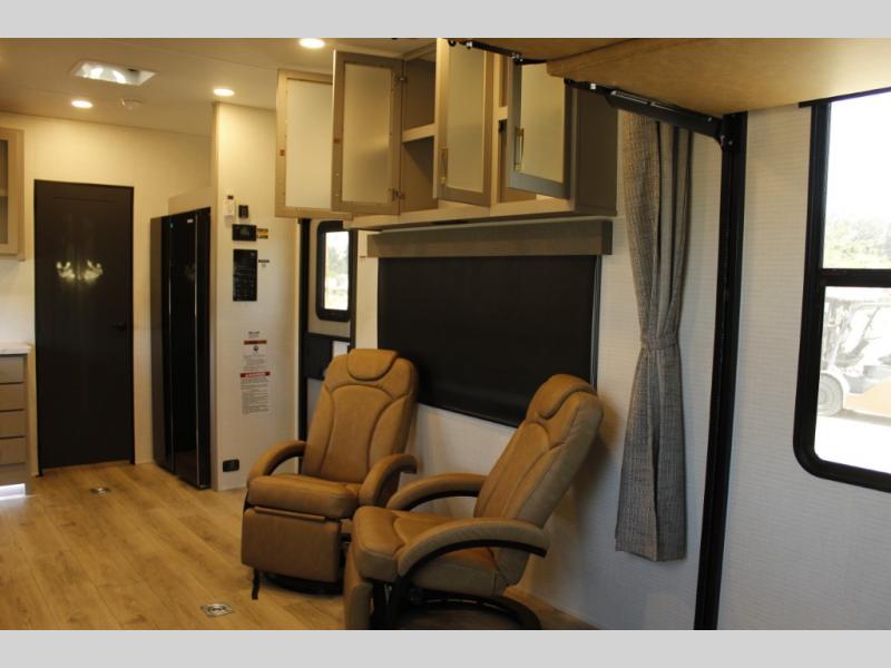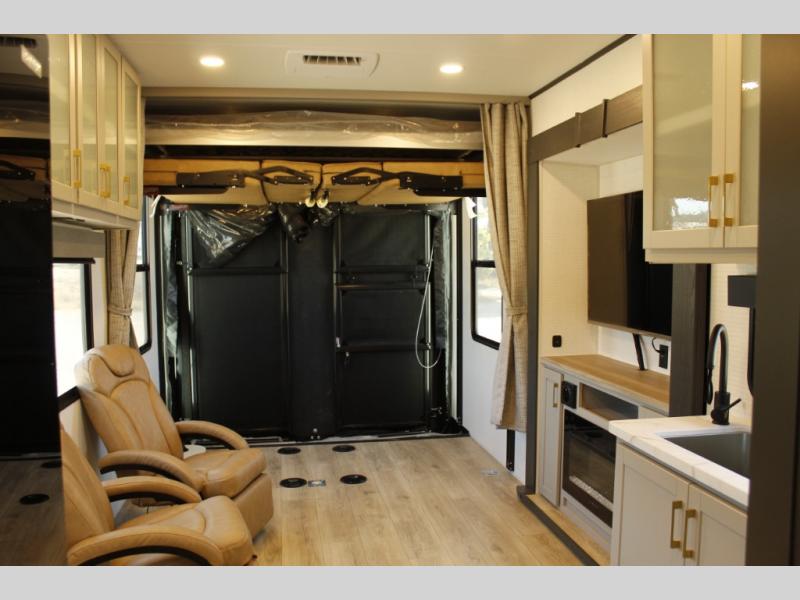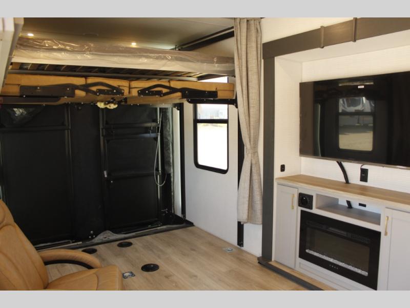 Are you looking for a travel trailer that can haul your favorite riding toys and still provide at-home comforts? This toy hauler is the one with 15' 1" total garage space, a front master bedroom with a king bed and dresser slide out, and a walk-through bath! The main living area also includes many comforts, like the dual lounge chairs, entertainment center slide out with a fireplace, and full kitchen. Your guests will find their beds on the electric pass-thru dinette or the drop-down electric bed!