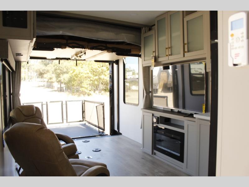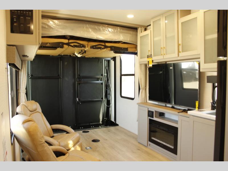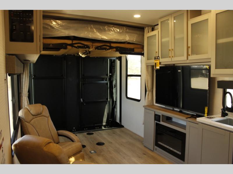 Spend your weekends riding the trails with this toy hauler in tow! There is 16' 1" total garage space for your toys and a ramp door for quick unloading. While the chef of your group is preparing lunch on the cooktop, everyone else can play a card game at the electric pass-thru dinette. This model includes an entertainment center directly across from the dual lounge chairs for all-around comfort. The king bed in the front private bedroom is sure to bring a great night's rest, while your guests sleep on the dinette or drop-down electric bed above!