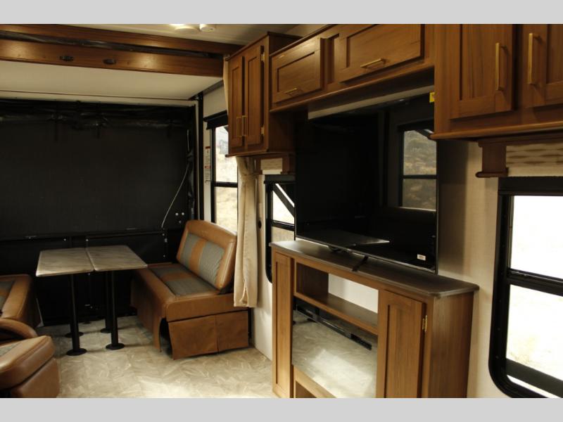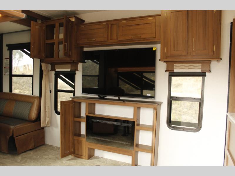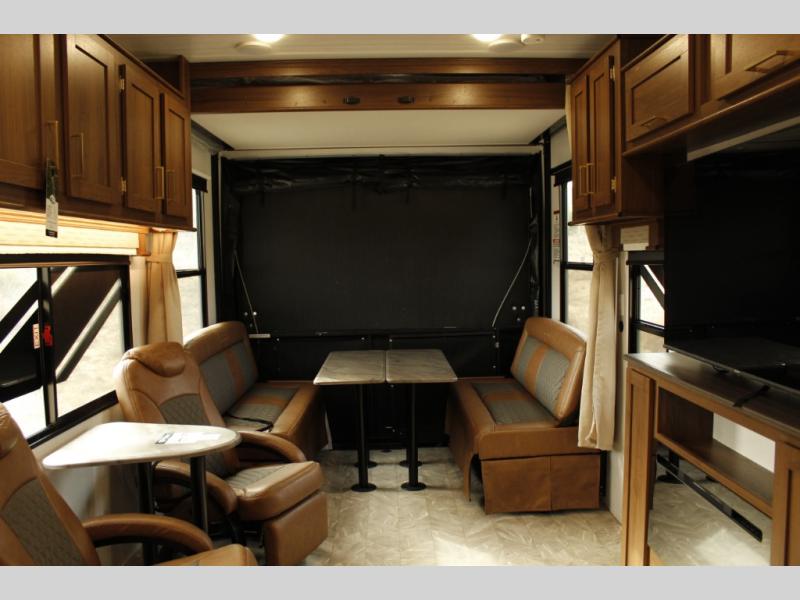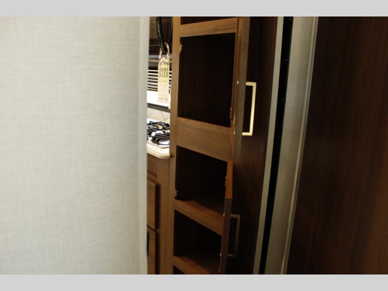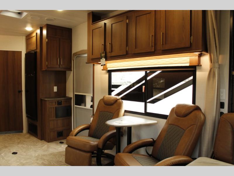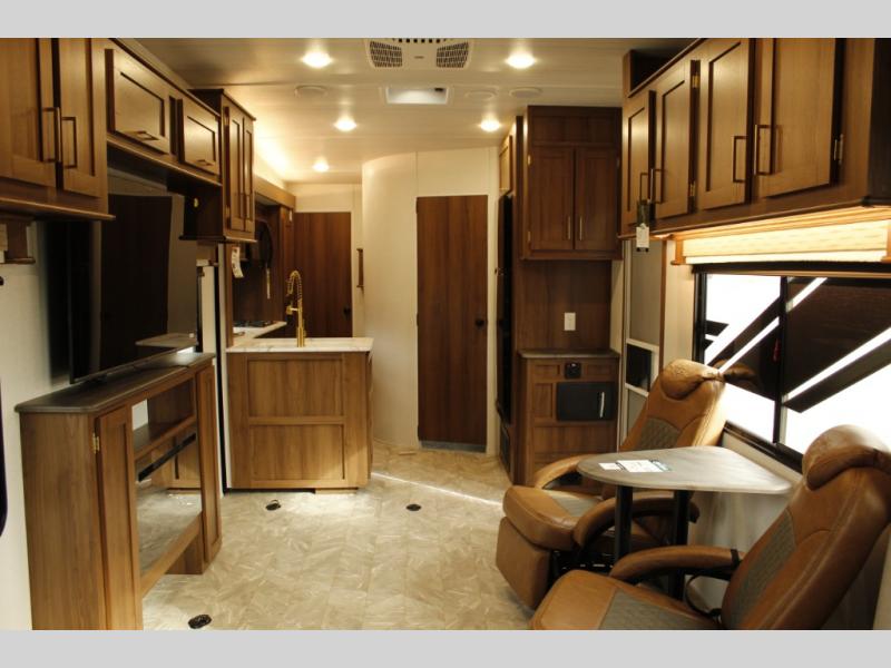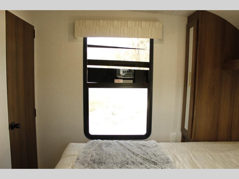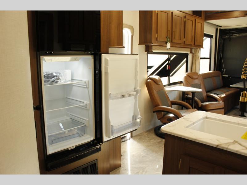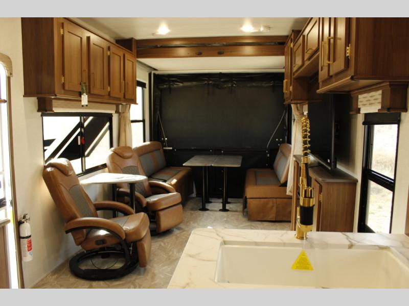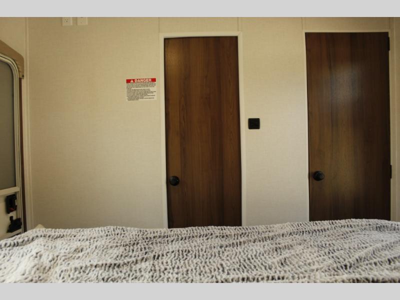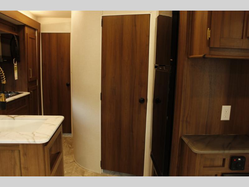 This dual entry travel trailer is sure to meet all your needs. Once you arrive at the campground, unload your toys from the 15' 7" total garage space, then grab a cold drink from the refrigerator. You can then relax on the dual lounge chairs, play a game at the electric pass-thru dinette, or let your guests rest on the electric bed. If you need a rest yourself, you'll find the king bed in the front master bedroom ultra comfortable. This model also includes an entertainment center with a fireplace and a kitchen slide out with the sink, counter space, cooktop, and pantry!