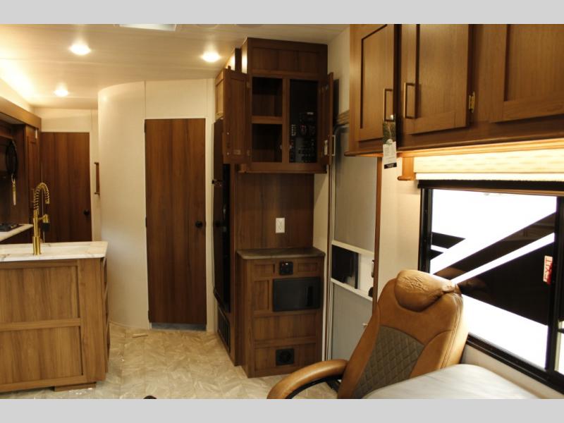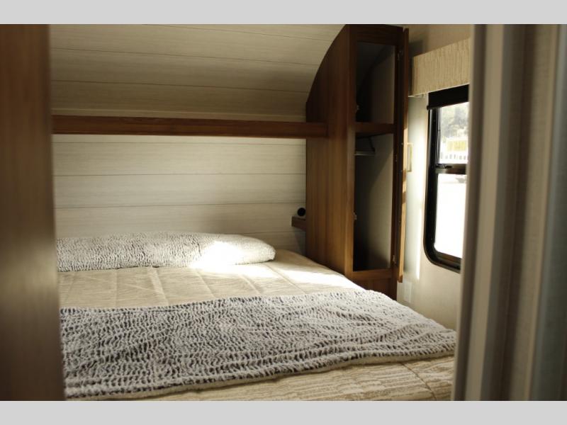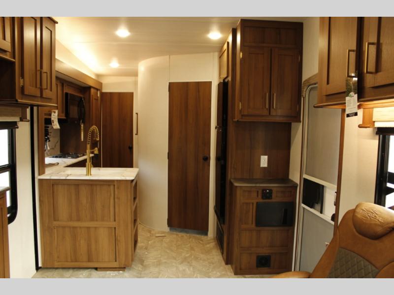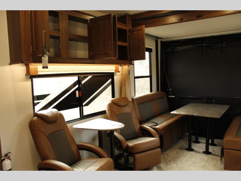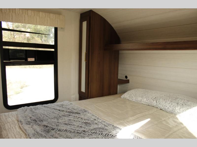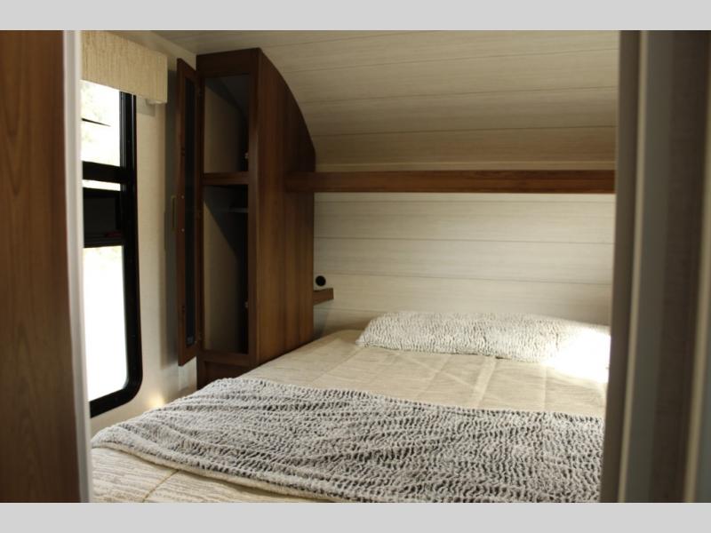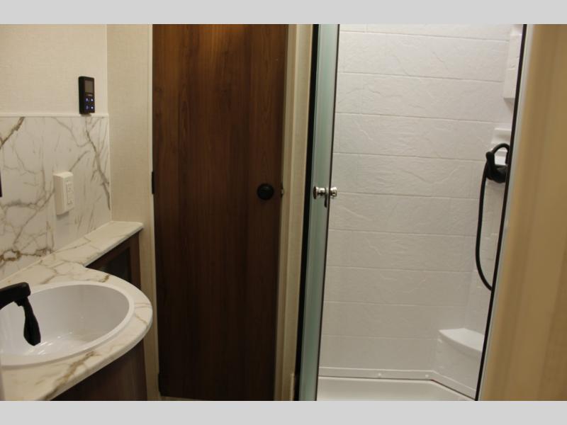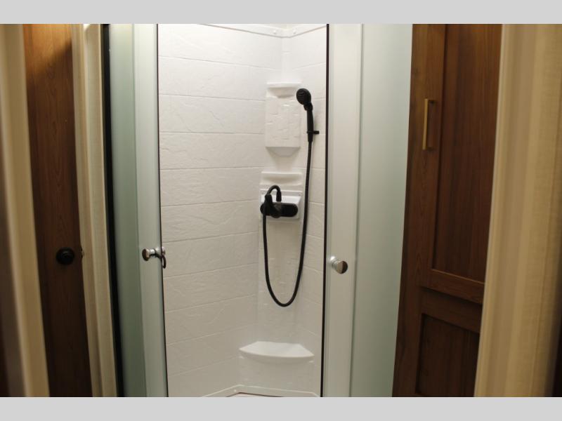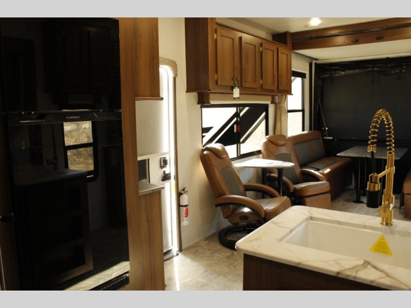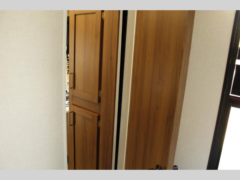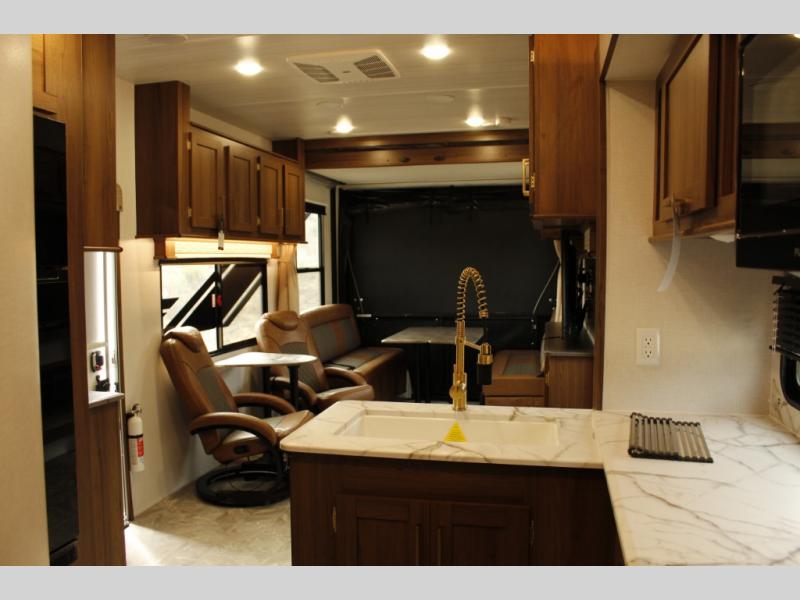 This dual entry travel trailer is sure to meet all your needs. Once you arrive at the campground, unload your toys from the 15' 7" total garage space, then grab a cold drink from the refrigerator. You can then relax on the dual lounge chairs, play a game at the electric pass-thru dinette, or let your guests rest on the electric bed. If you need a rest yourself, you'll find the king bed in the front master bedroom ultra comfortable. This model also includes an entertainment center with a fireplace and a kitchen slide out with the sink, counter space, cooktop, and pantry!