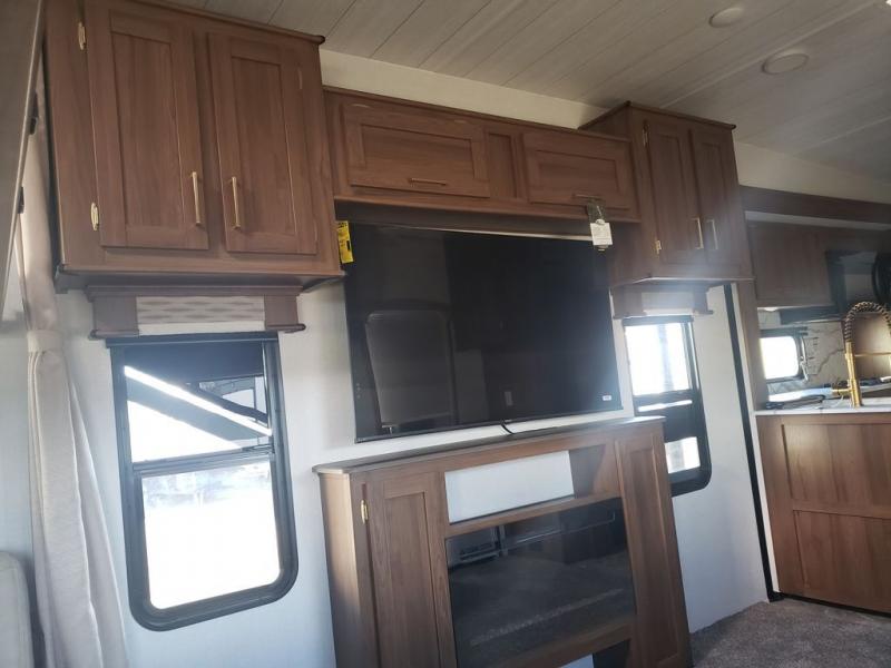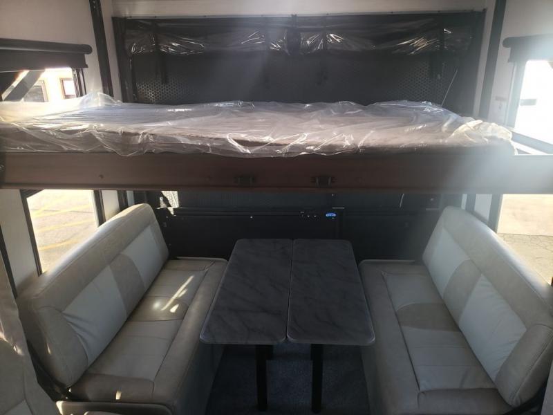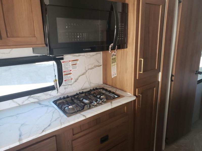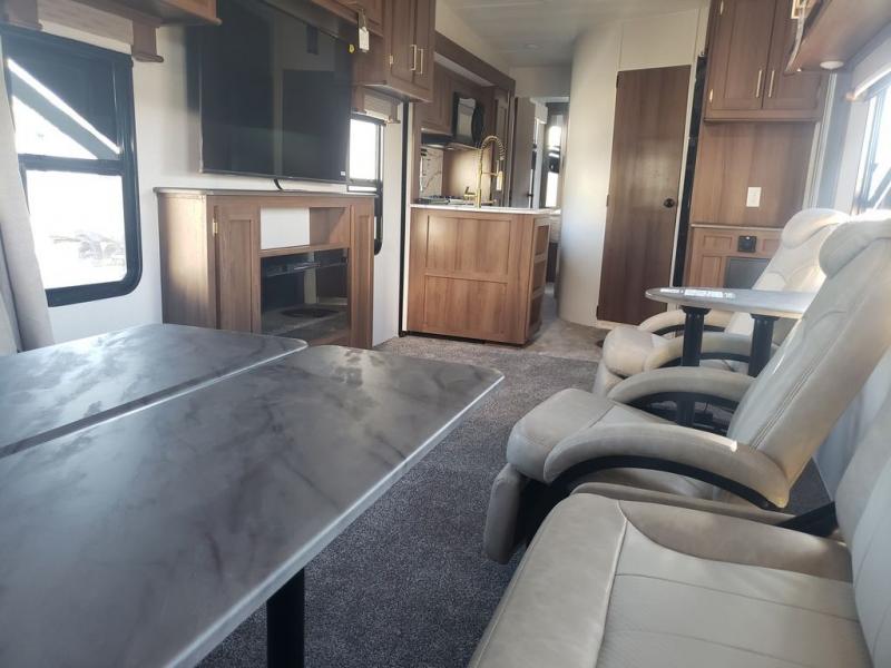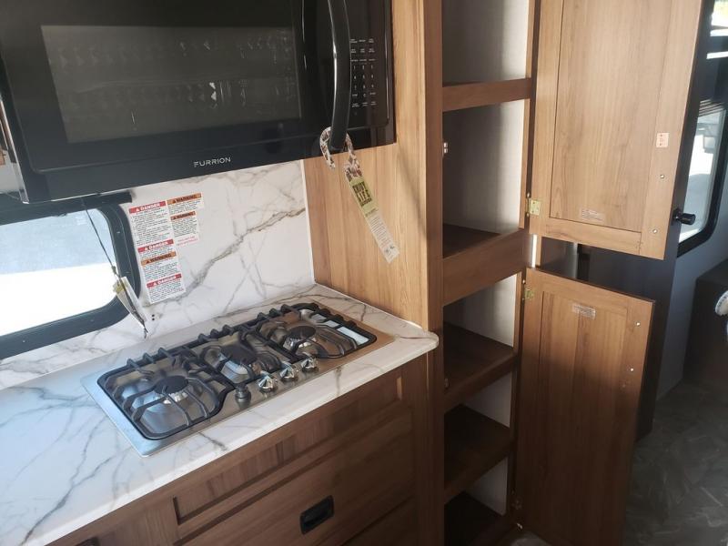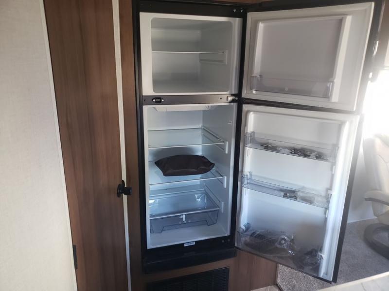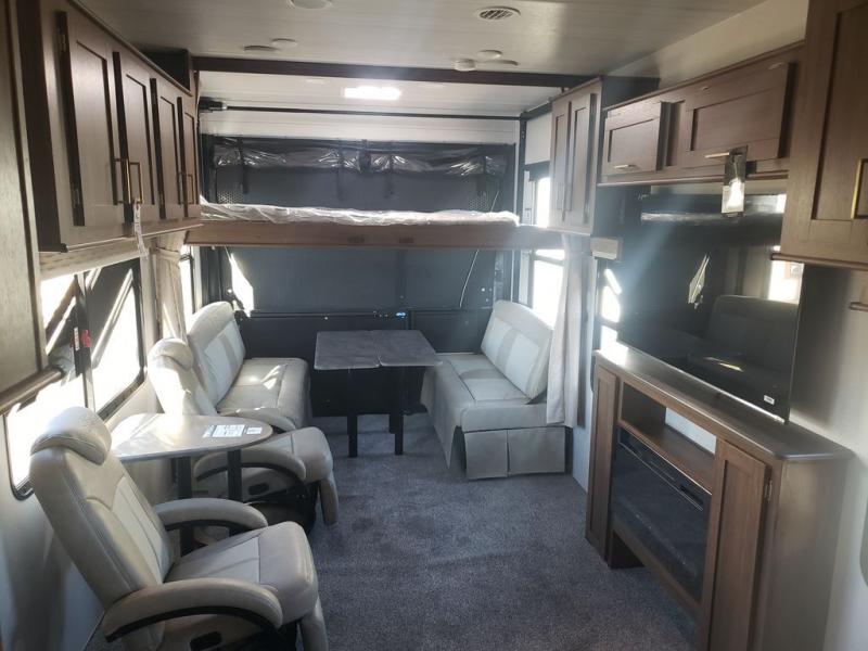 This dual entry travel trailer is sure to meet all your needs. Once you arrive at the campground, unload your toys from the 15' 7" total garage space, then grab a cold drink from the refrigerator. You can then relax on the dual lounge chairs, play a game at the electric pass-thru dinette, or let your guests rest on the electric bed. If you need a rest yourself, you'll find the king bed in the front master bedroom ultra comfortable. This model also includes an entertainment center with a fireplace and a kitchen slide out with the sink, counter space, cooktop, and pantry!
