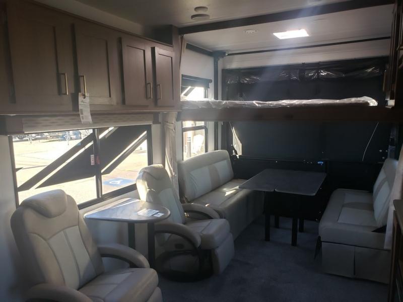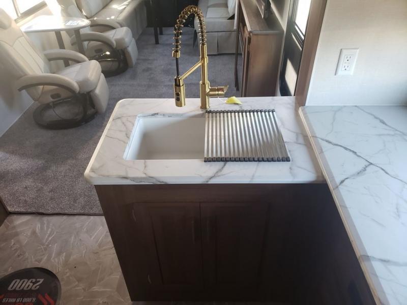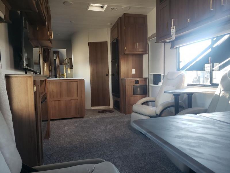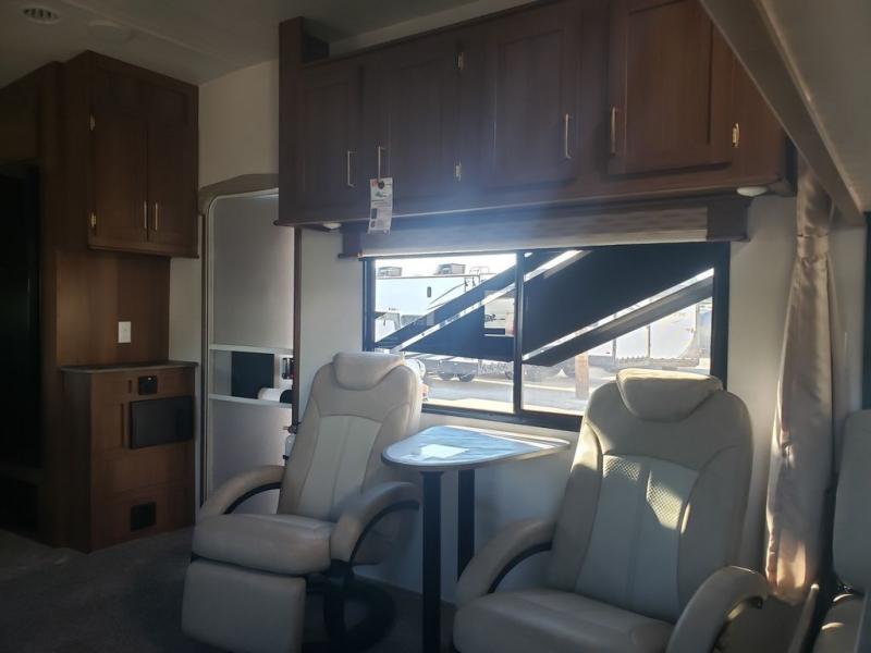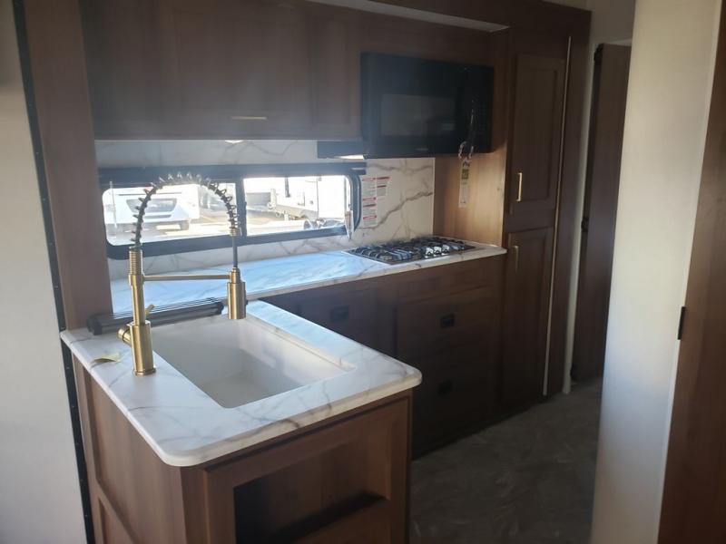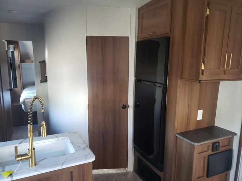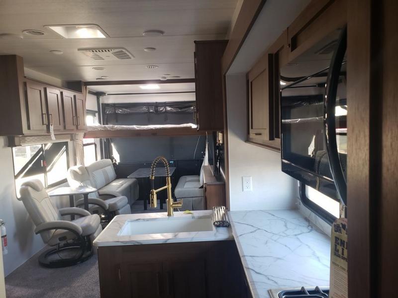 This dual entry travel trailer is sure to meet all your needs. Once you arrive at the campground, unload your toys from the 15' 7" total garage space, then grab a cold drink from the refrigerator. You can then relax on the dual lounge chairs, play a game at the electric pass-thru dinette, or let your guests rest on the electric bed. If you need a rest yourself, you'll find the king bed in the front master bedroom ultra comfortable. This model also includes an entertainment center with a fireplace and a kitchen slide out with the sink, counter space, cooktop, and pantry!