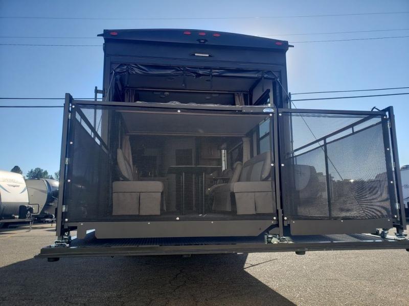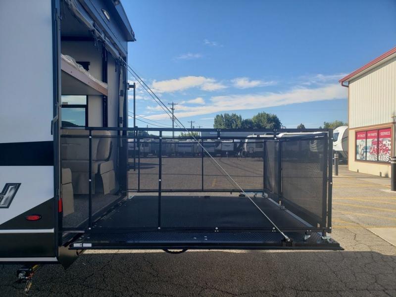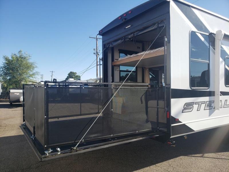 With any Stealth toy hauler by Forest River you will enjoy innovative floorplans and "off-road approved" chassis to take your adventures up a notch! There are four different build levels to choose from to best fit your needs, budget, and style. Each travel trailer and fifth wheel include flipped axles with no interior drive on wheel wells, Flip Tread solid entry steps, and tie-downs mounted to steel throughout to keep toys secure on the way to the campground. The power tongue jack will make it easier than ever to hitch up and go, and the Lippert ladder prep means you can add this option to easily access the roof. A 40 gallon fuel station comes standard to keep your toys ready to go when you are, and the dual 20 lbs. propane tanks will let you hook up the grill to make dinner for your whole crew. Some of the other convenient features include a matching spare tire if an unfortunate flat happens, a 335W solar panel, and a 1.5 cu. ft. convection microwave. And don't forget about the available options that will allow you to customize your toy hauler exactly how you want it!