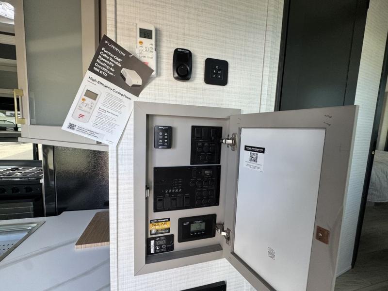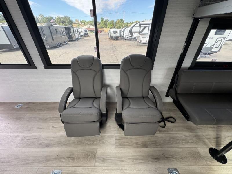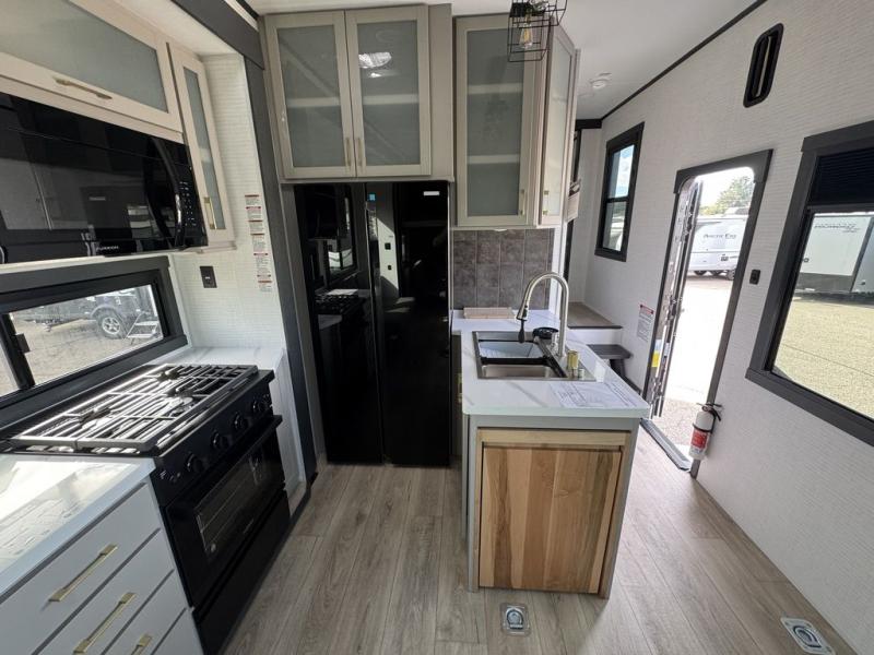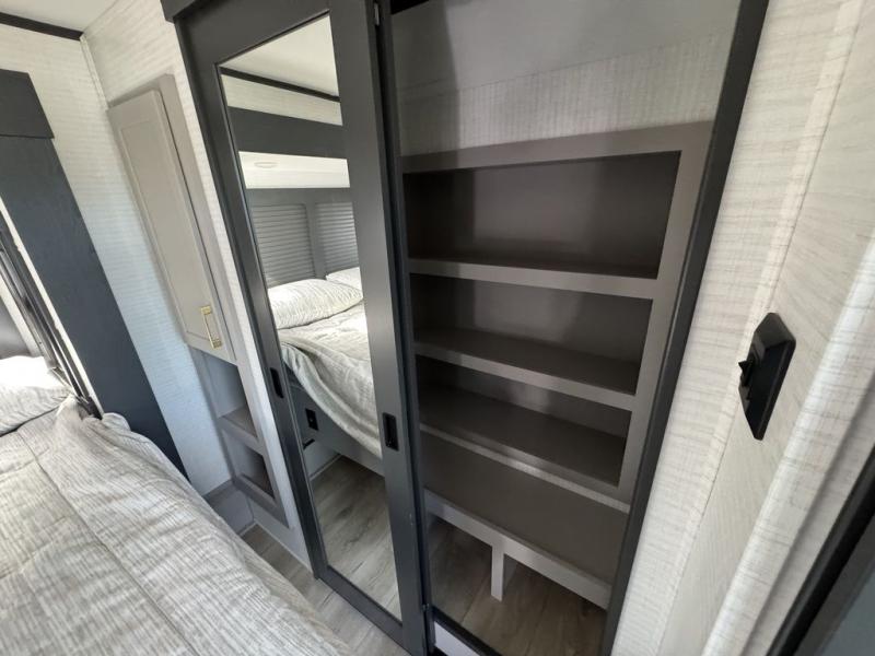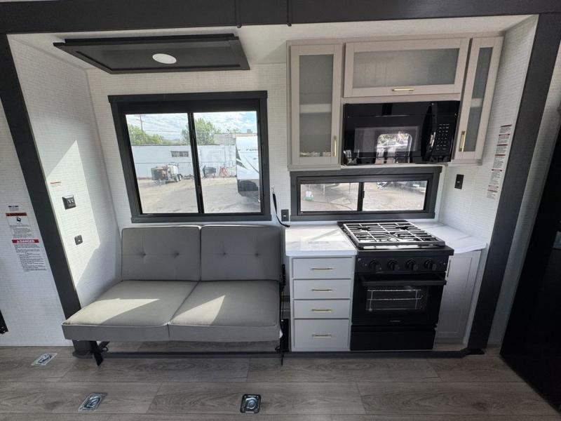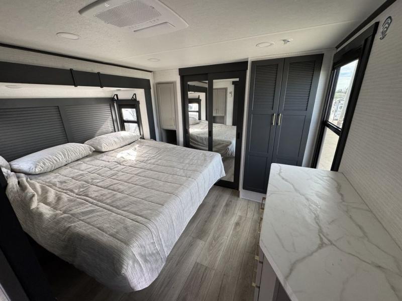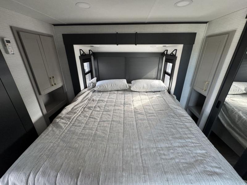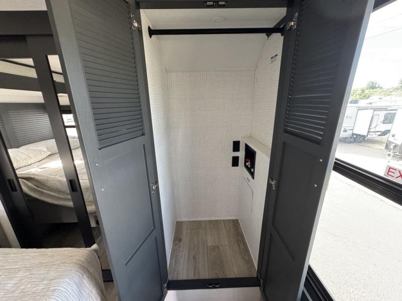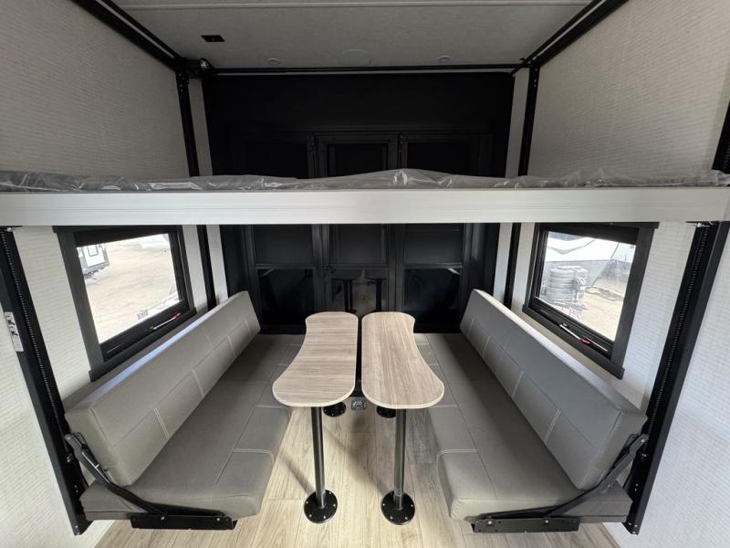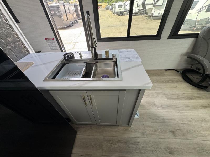 This toy hauler will bring the greatest sleeping experience on your road trip thanks to its private front bedroom, featuring a king bed with flip-up floor storage below, perfect for stashing your favorite gear. The room also includes a spacious wardrobe, washer and dryer prep for added convenience, shelves, dresser, and seat, providing ample storage and comfort. The full bathroom is spacious, complete with a generous 30 x 48 shower and linen closet for all your towels and bath clothes. You'll feel right at home with the luxurious amenities and comfortable living spaces. The kitchen is equipped with a microwave, waterfall sink, flip-up countertop for added space when cooking, a 16 cu fridge, pantry, and overhead cabinets. The living room is the perfect place to relax, featuring a flip-up sofa, two garage chairs, a TV, and an overhead cabinet. You'll have everything you need to unwind after a long day of adventure. In the garage, you'll find sit-n-sleep rollovers, a removable dinette table, and a sleep-and-store above. Also, perform various activities outside without worrying about the weather thanks to the massive 20’ awning and enjoy the fresh air. With its luxurious amenities, spacious living areas, and versatile garage space, our toy hauler is the perfect vehicle for anyone who loves adventure.