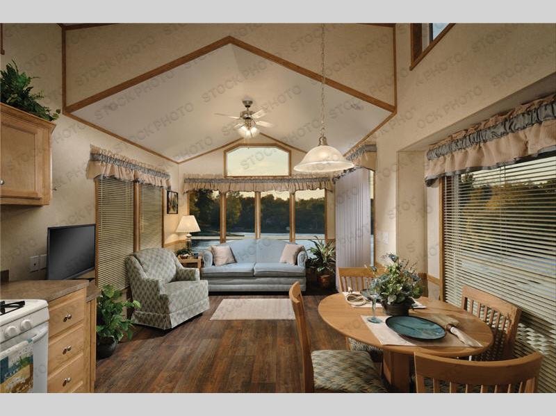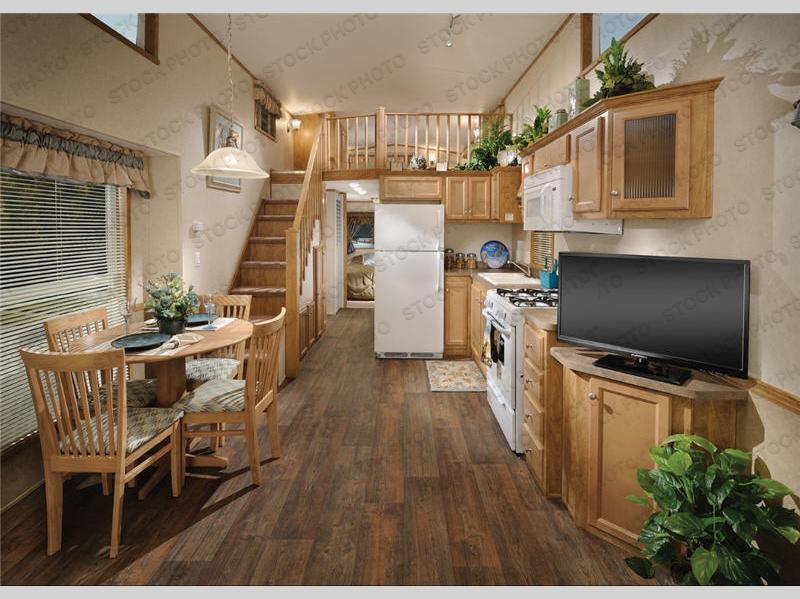 You will enjoy vacationing in this 40CKCL - Loft park model! With an L-shaped kitchen to make whipping up your delicious meals even easier, and the drop leaf table with four lumbar supported chairs is conveniently located across from it too. You can even choose to add the optional box bay window to add natural lighting as you enjoy your meals. After you have finished dining, you can relax on the front hide-a-bed sofa or in the swivel rocker with a ceiling fan above it all to keep you cool. You might like to venture to the rear private bedroom and take a quick nap on the queen-sized bed. Your kids will love having their own space in the loft with a cabinet for your storage needs!