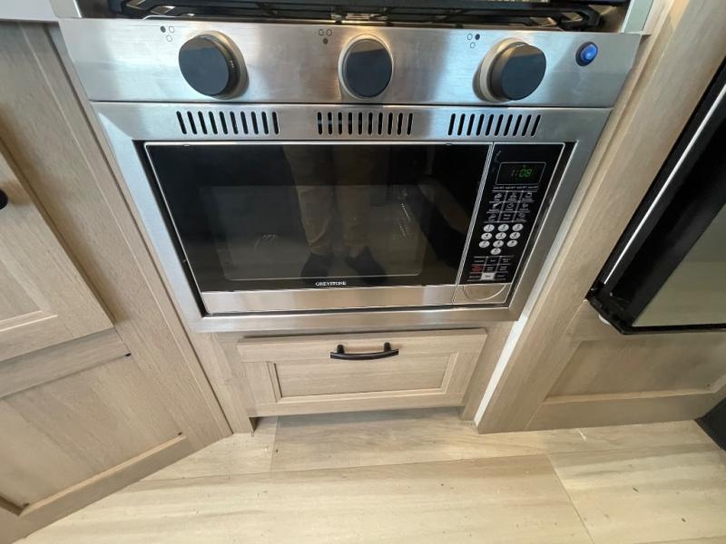A lot of convenience has been packed into this coach with the full rear bathroom, the master suite, a complete kitchen, two TVs, and a bunk above the cab. An added bonus is the U-shaped dinette which can serve as a dining space or sleeping space depending on how you have it set up. If you don't need the bunk above cab for sleeping space, you could change it out for the optional Trekker cap with built-in entertainment center and storage. The kitchen is equipped with all of your favorites: a pantry, a convection microwave, a three-burner range, a flip-up countertop, and a 10.7-cubic foot refrigerator.