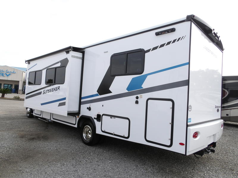 This Sunseeker LE Class C gas motorhome will allow you to travel to other states with your favorite people beside you! You can take a moment to enjoy a fresh cup of coffee in the morning while sitting at the booth dinette or on the sofa, or you can spend a little extra time creating a hearty breakfast in the kitchen on the recessed three-burner range. The 10.7-cubic foot refrigerator will store your cheese and milk, and the convection microwave will heat up leftovers with ease. The separated bathroom leads into the rear bedroom where you will find an RV queen bed with wardrobes on either side, and you can also head outside to enjoy the 15' 6" electric awning with LED lights before bed.