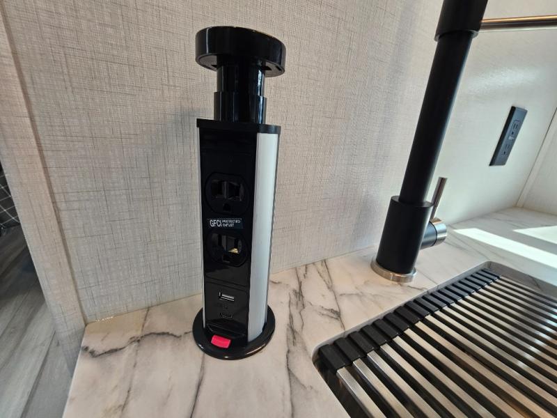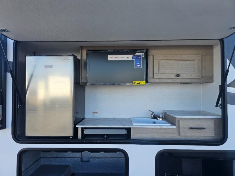 Outdoor Kitchen & Entertainment – Take your camping experience to the next level with an exterior kitchen and TV, perfect for cooking meals outside while watching the big game or your favorite show.