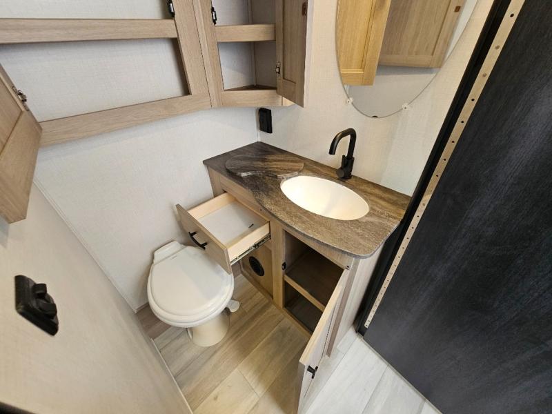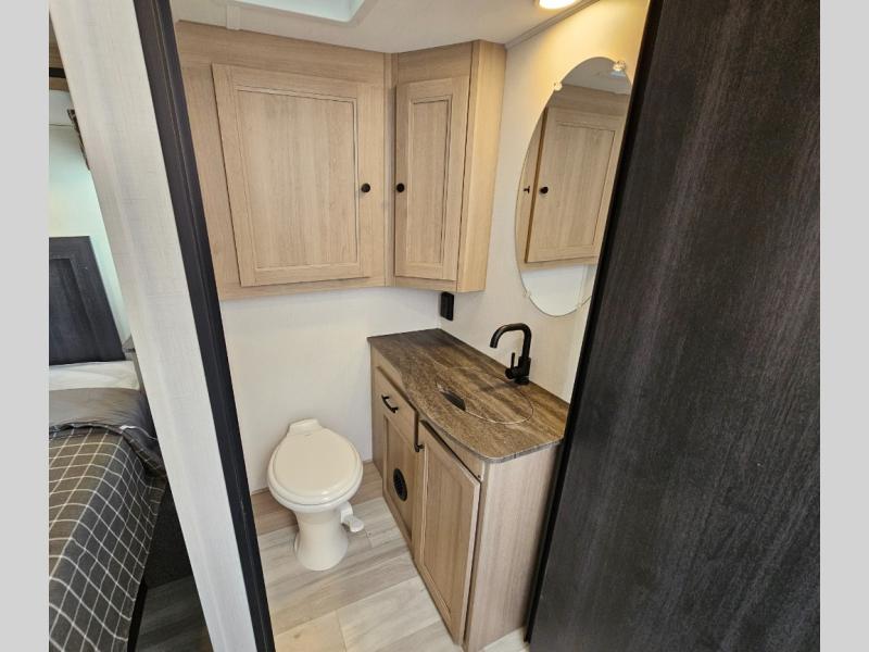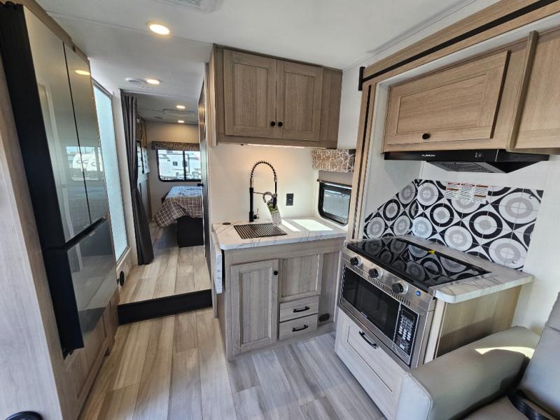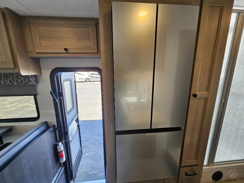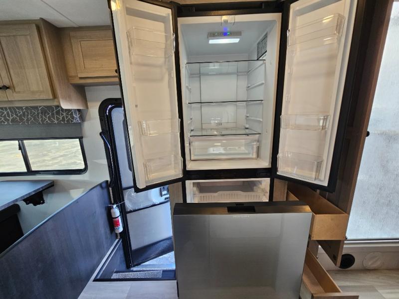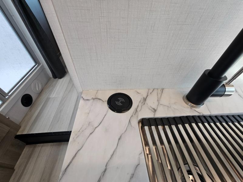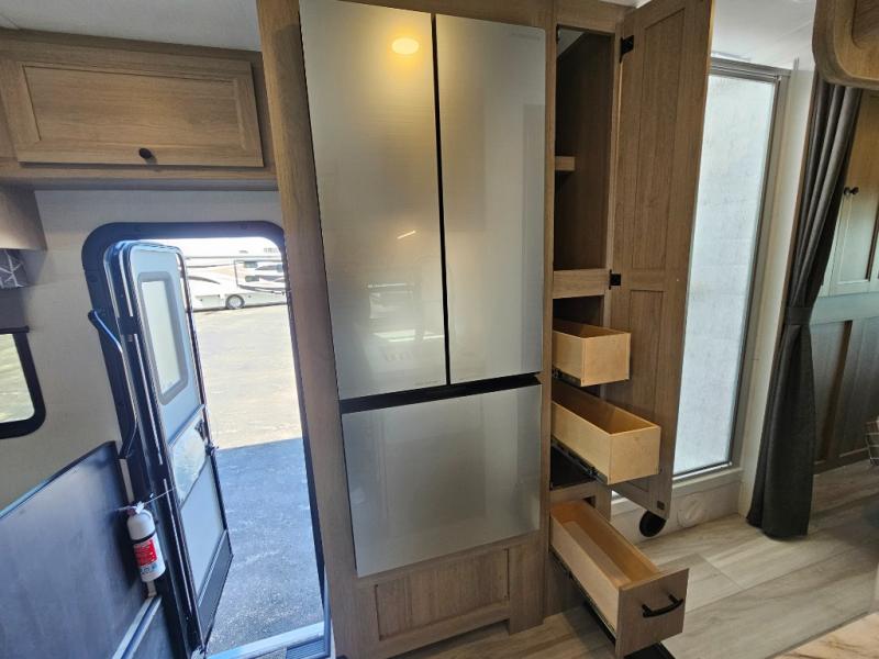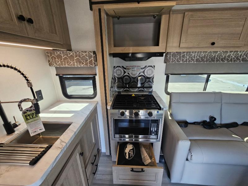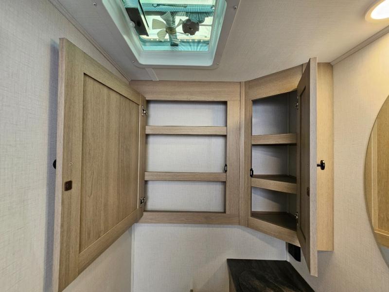 Fully Equipped Kitchen – The well-appointed kitchen boasts a three-burner cooktop, convection microwave, residential-style refrigerator, and ample counter space, making meal prep on the road easier than ever.