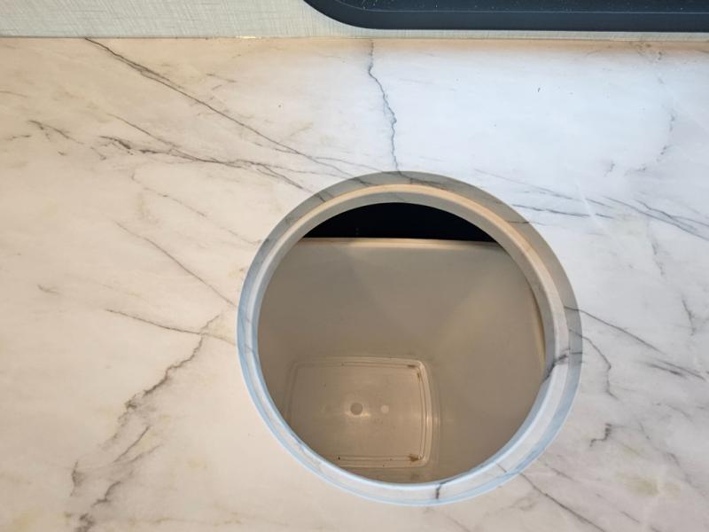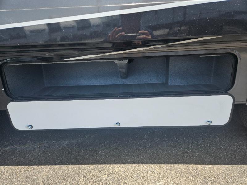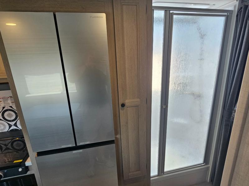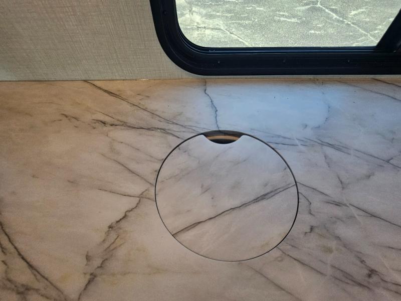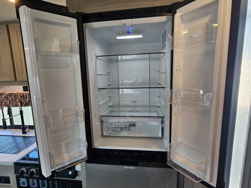 Fully Equipped Kitchen – Includes a three-burner range with oven, microwave, large double-door refrigerator, solid-surface countertops, and ample cabinet space for cooking on the road.