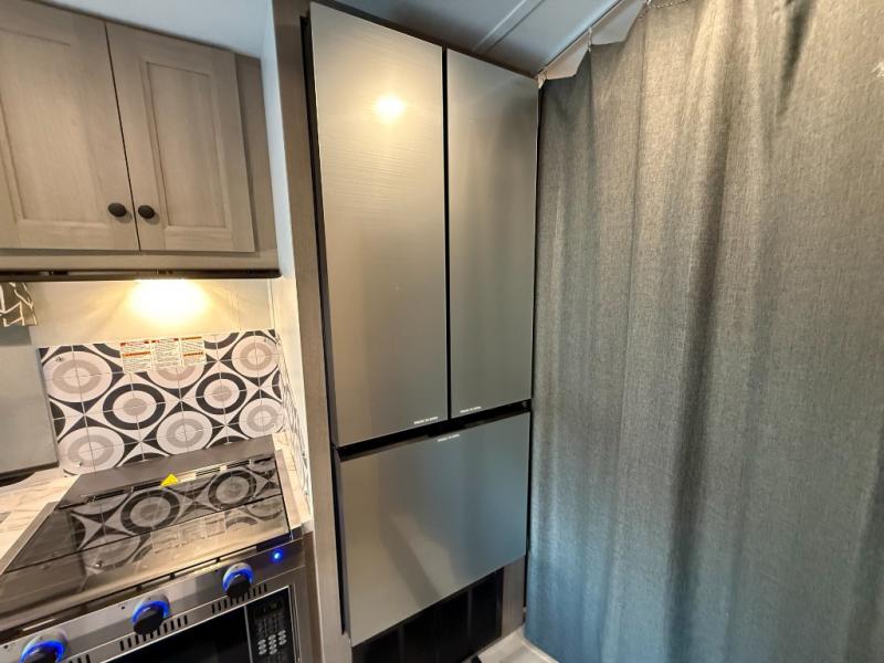 Kitchen: 12V refrigerator (~10.7 cu ft), three-burner cooktop, convection microwave, sink with flip-up counter extension.