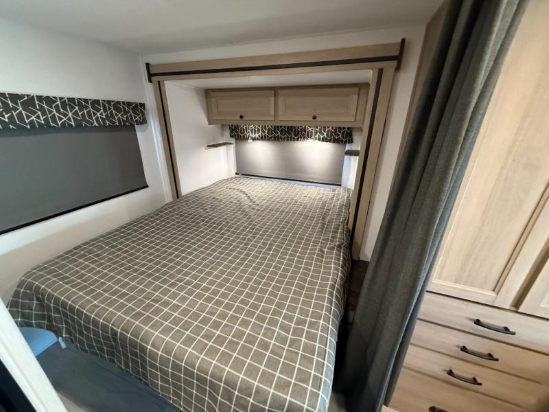 Sleeps 5: Queen-size wedge bed in the rear slide-out, a cab-over bunk, plus converts the dinette if needed.