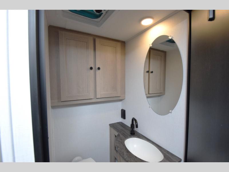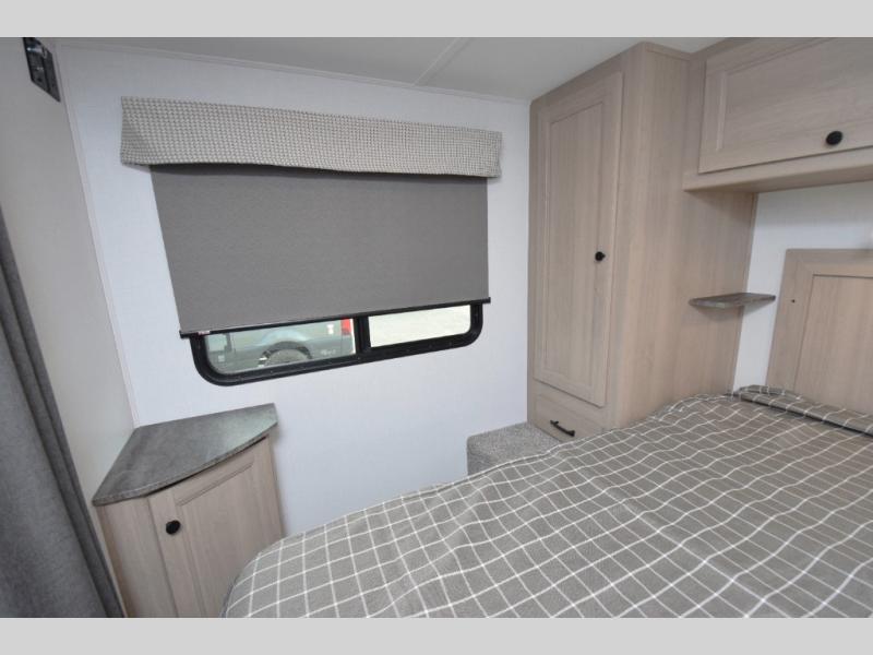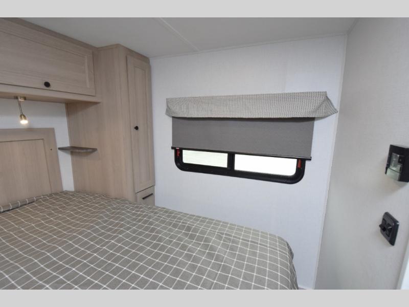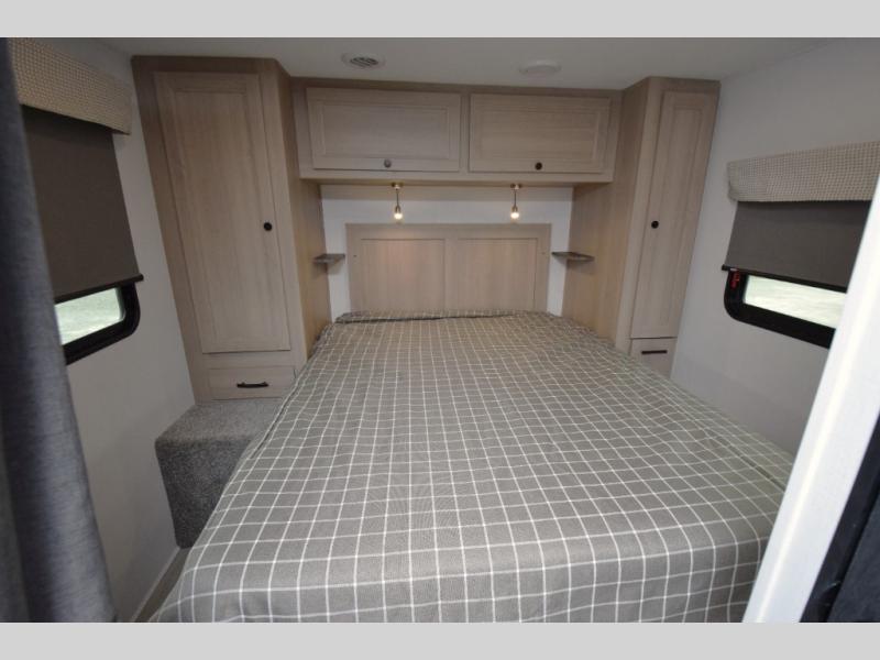 - Private Bedroom: The rear private bedroom offers a peaceful retreat with an RV queen bed and wardrobes on either side for all your clothing and personal items.