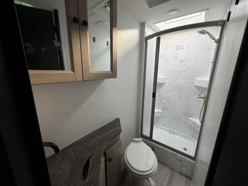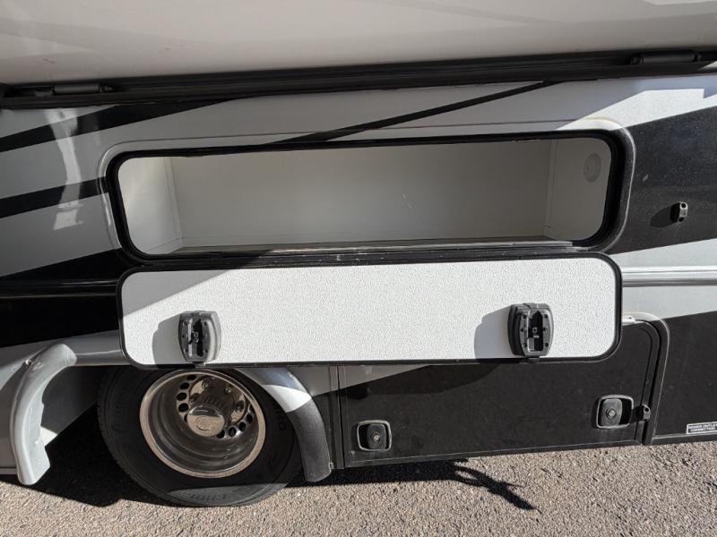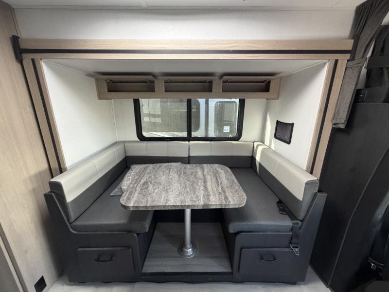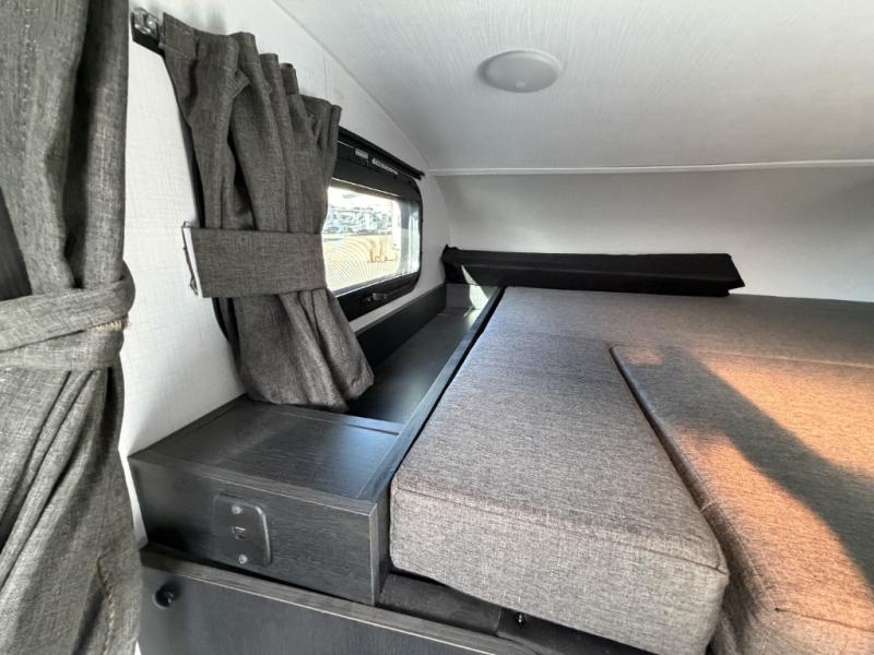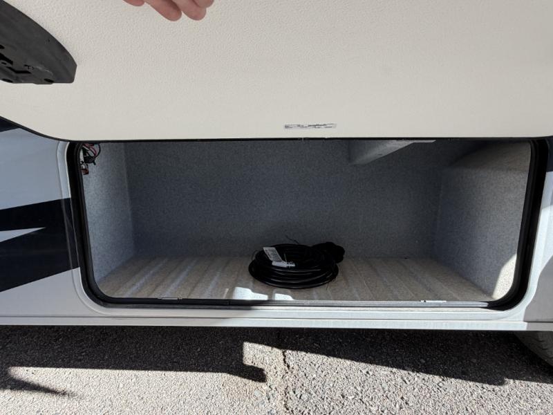 Everything you need is found in this cozy motorhome for five to six people. The swivel captain's seats can become a part of the living area once you park, and your guests can gather around the U-shaped dinette slide for game night. Your meals can be prepared each day on the induction cooktop with a convection microwave, and the flip-up counter will provide more prep space. There is also a 10.7 cu. ft. 12V refrigerator for food storage. The bedroom features a queen bed slide, 12V TV, plus a wardrobe to keep your clothes organized. A 60" x 80" cab-over bunk provides more sleeping space, or you can choose the optional Trekker cap with a built-in entertainment center!