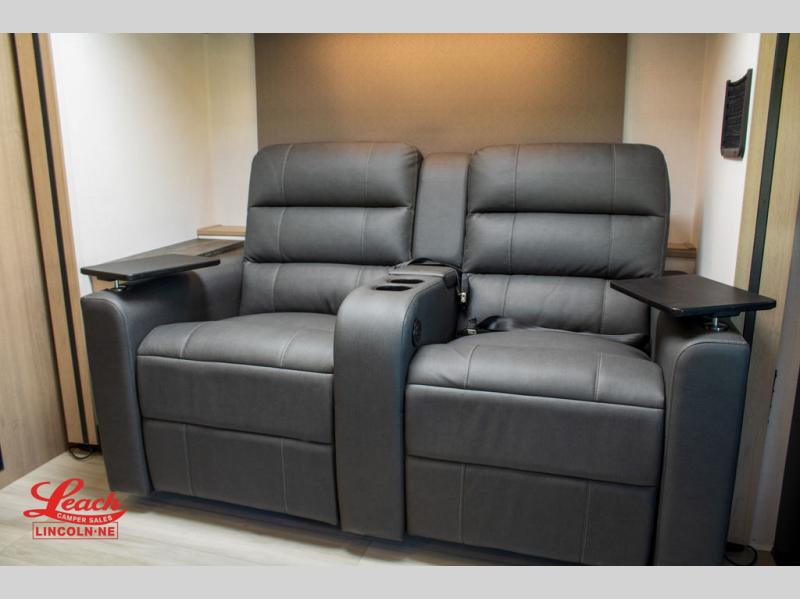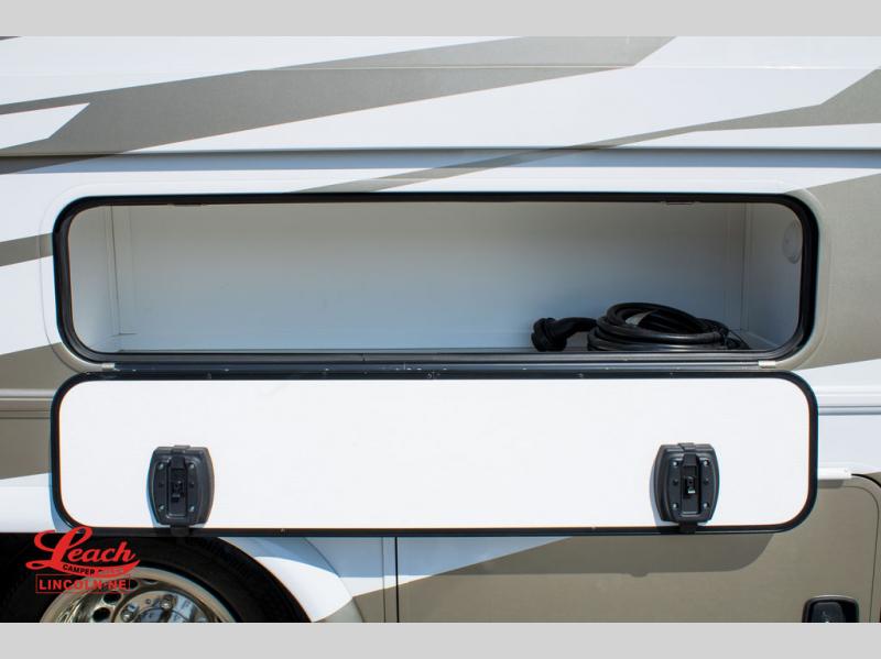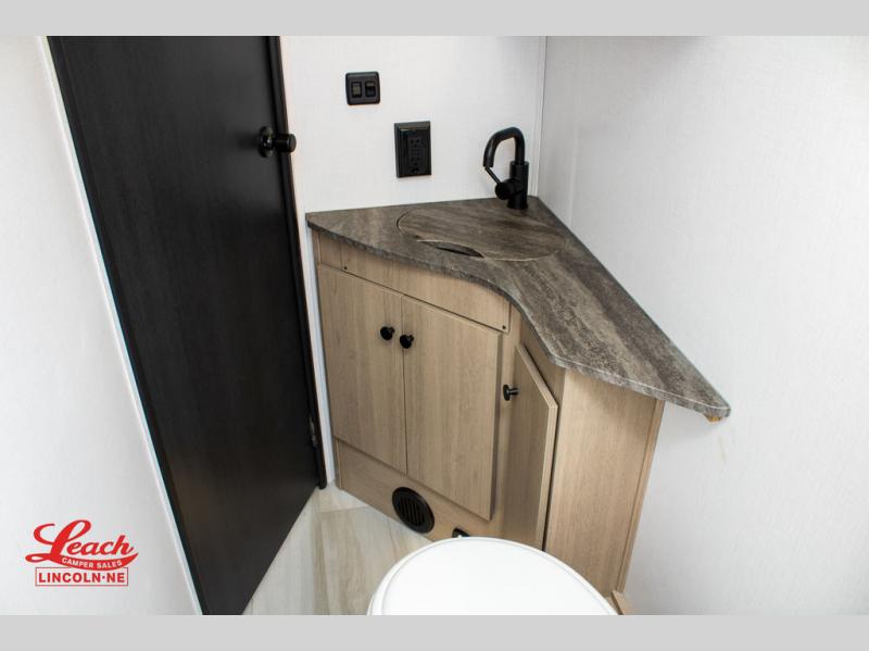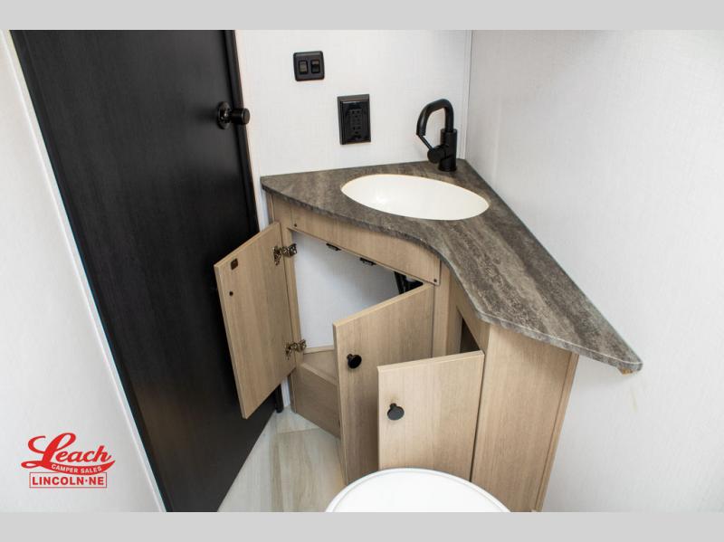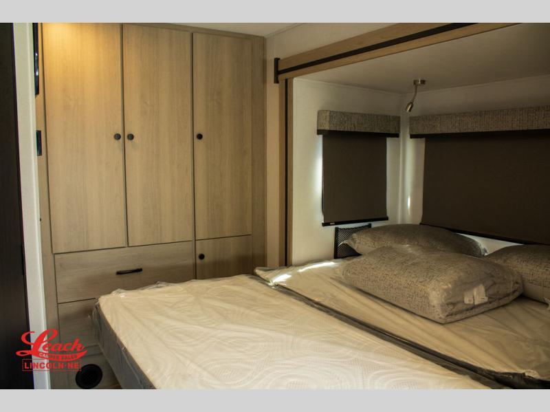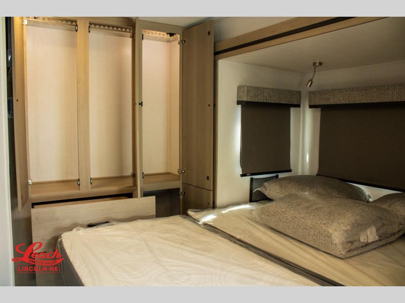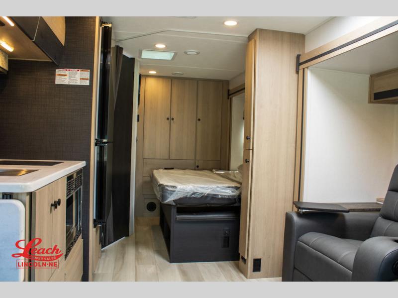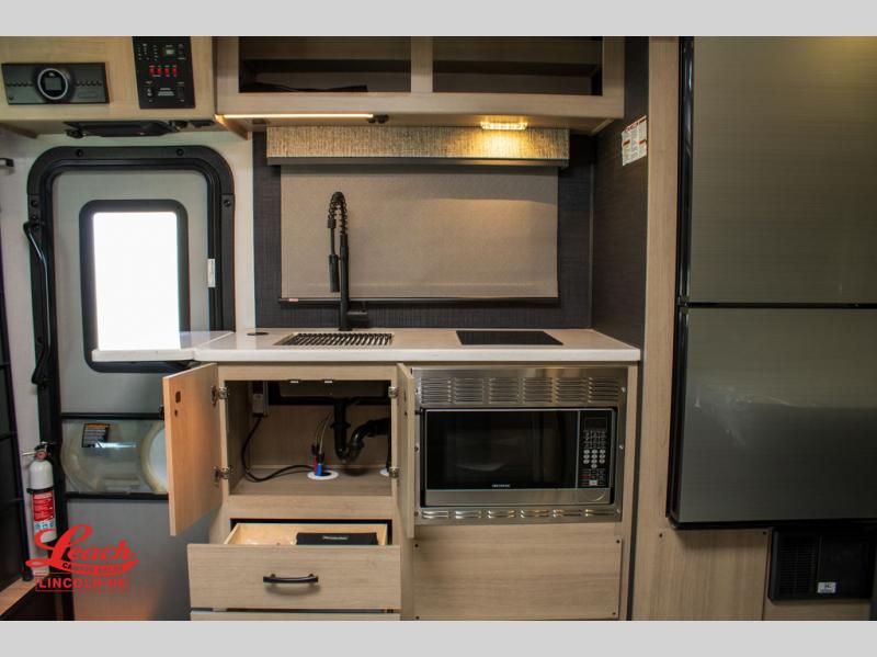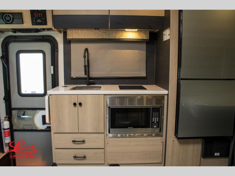 Everything you need is found in this cozy motorhome for five to six people. The swivel captain's seats can become a part of the living area once you park, and your guests can gather around the U-shaped dinette slide for game night. Your meals can be prepared each day on the induction cooktop with a convection microwave, and the flip-up counter will provide more prep space. There is also a 10.7 cu. ft. 12V refrigerator for food storage. The bedroom features a queen bed slide, 12V TV, plus a wardrobe to keep your clothes organized. A 60" x 80" cab-over bunk provides more sleeping space, or you can choose the optional Trekker cap with a built-in entertainment center!