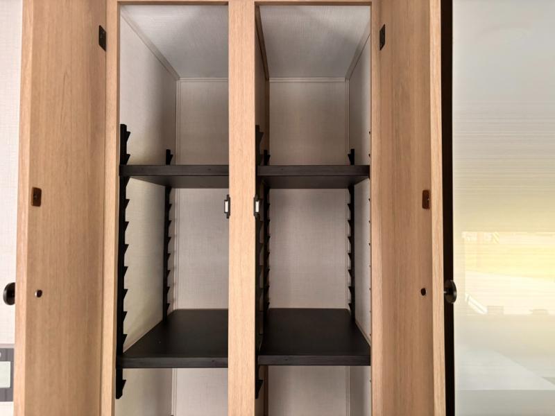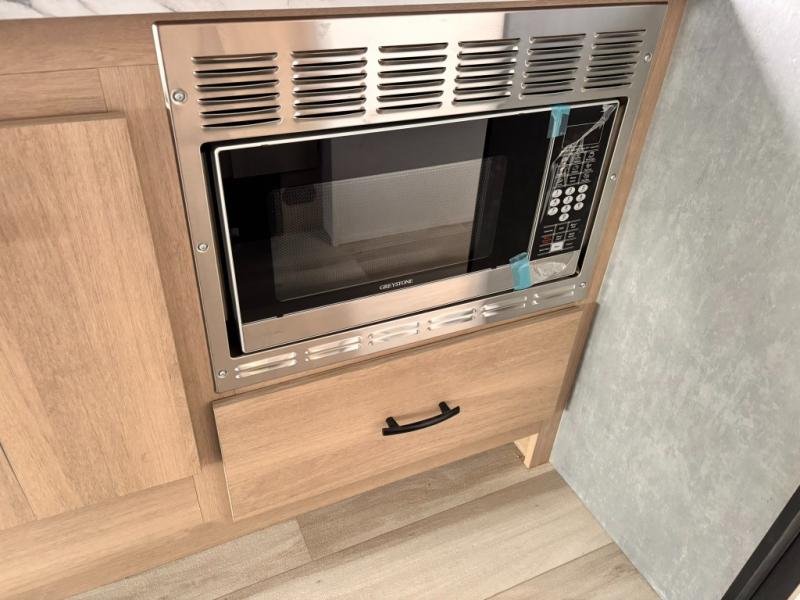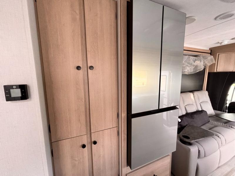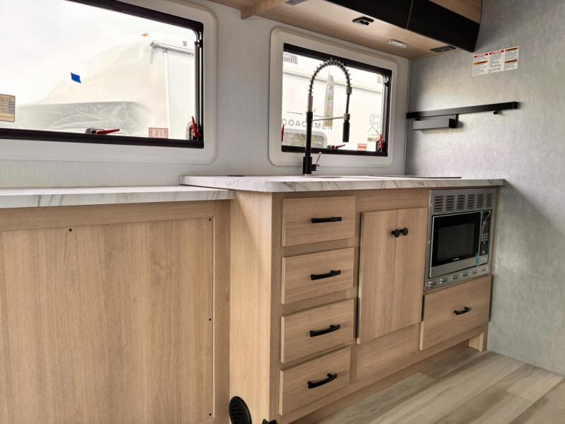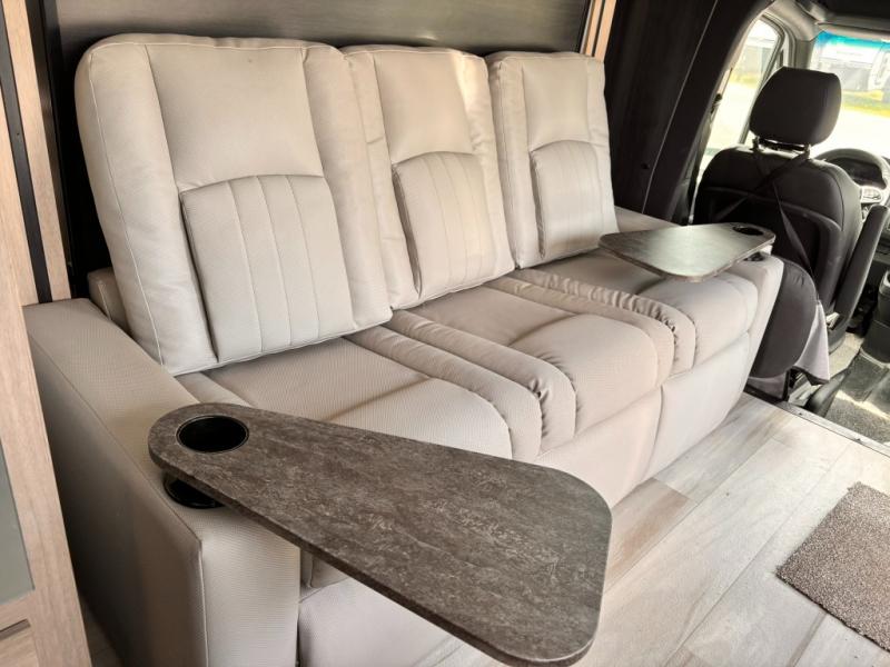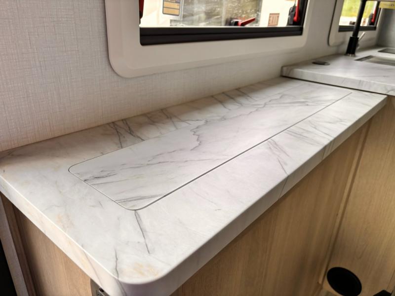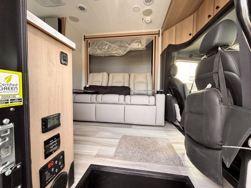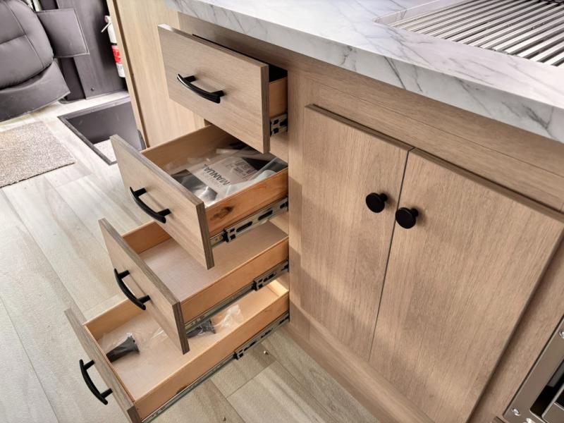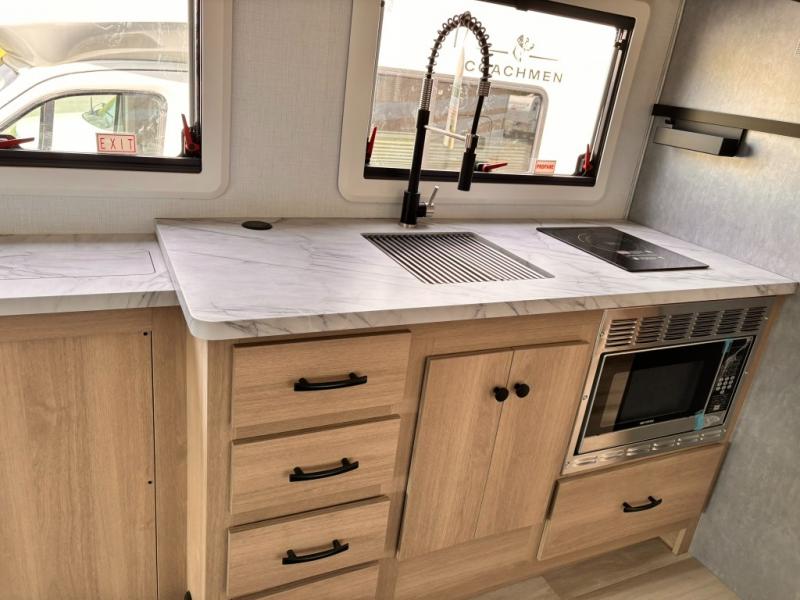 Trips across the state are made cozy in this single slide out coach for two! Once you've parked for the day, you can make lunch on the recessed induction cooktop or in the convection microwave. The sofa slide out provides a place to relax, and the Murphy bed can be folded out when you're ready for some shut-eye. You will appreciate how spacious the full rear bath is, and there is a wardrobe plus a linen closet here for ample storage. The cab-over bunk is only available with the Trekker Cap option; see dealer for more details.