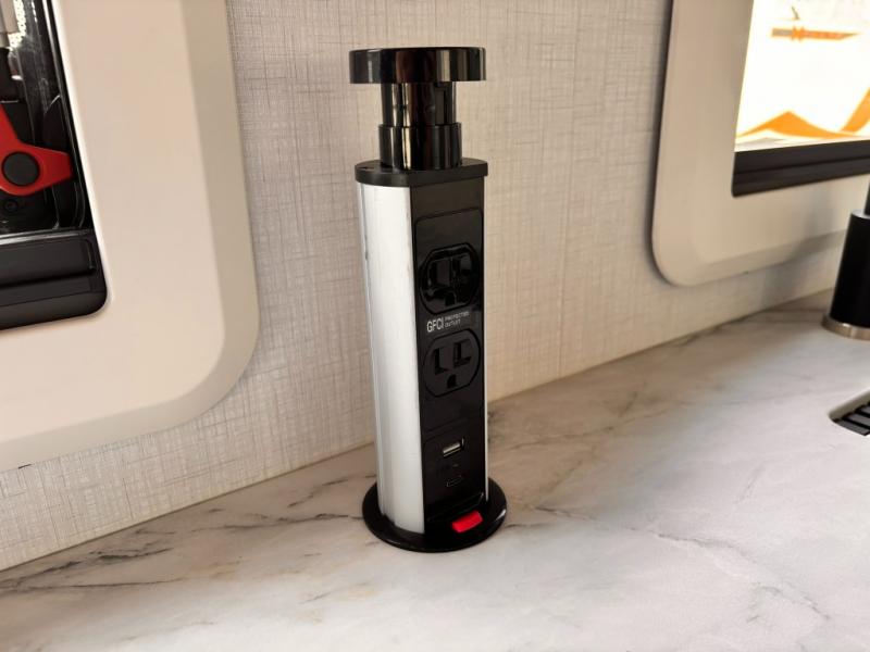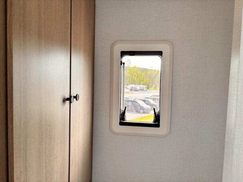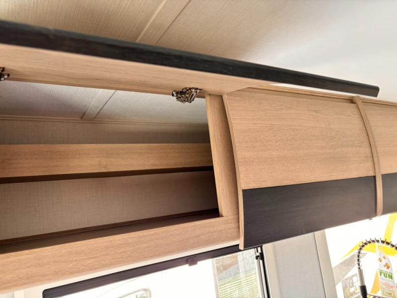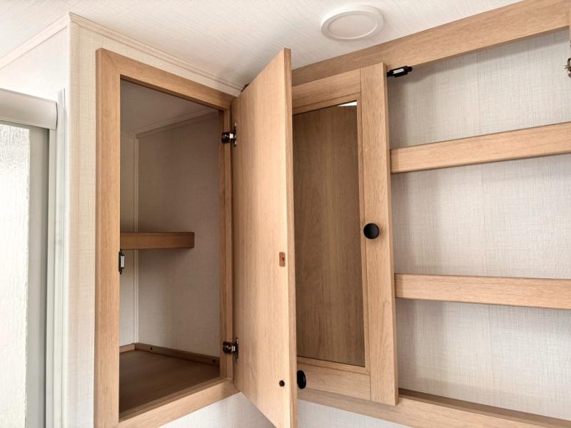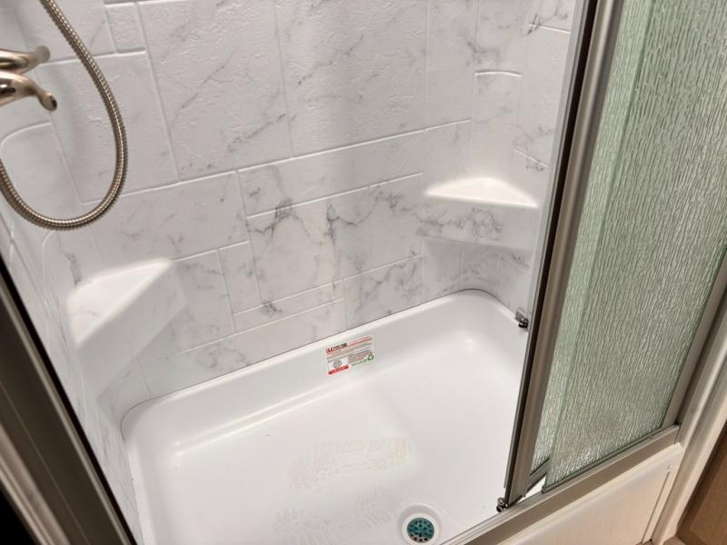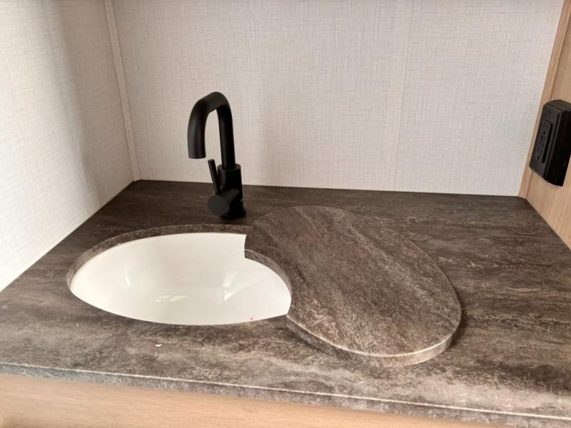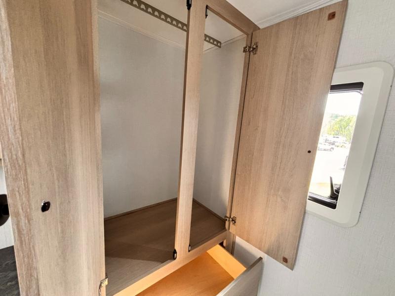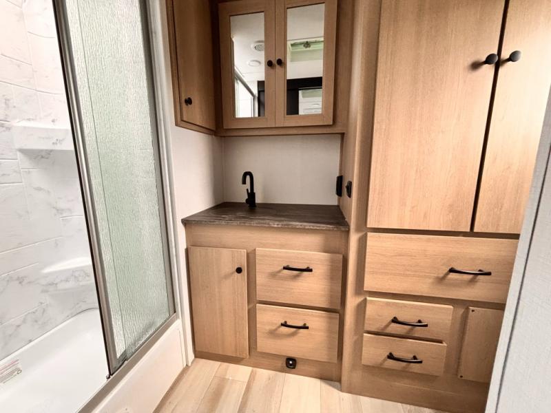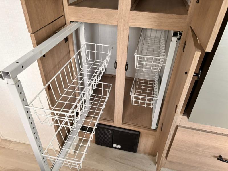 Trips across the state are made cozy in this single slide out coach for two! Once you've parked for the day, you can make lunch on the recessed induction cooktop or in the convection microwave. The sofa slide out provides a place to relax, and the Murphy bed can be folded out when you're ready for some shut-eye. You will appreciate how spacious the full rear bath is, and there is a wardrobe plus a linen closet here for ample storage. The cab-over bunk is only available with the Trekker Cap option; see dealer for more details.