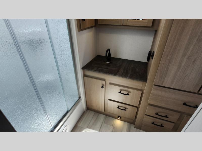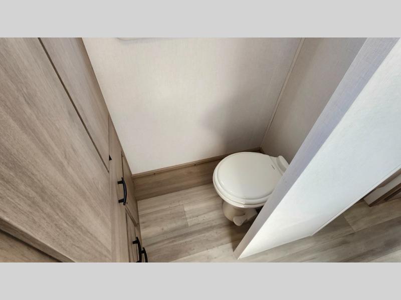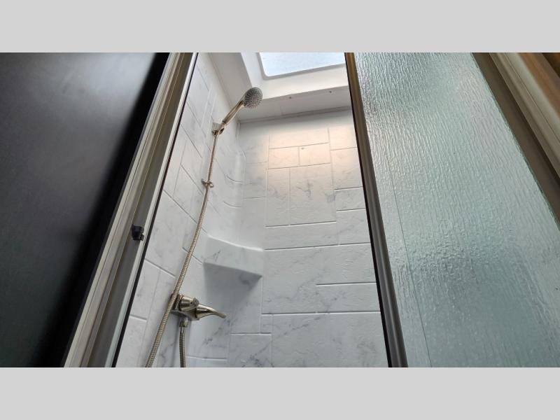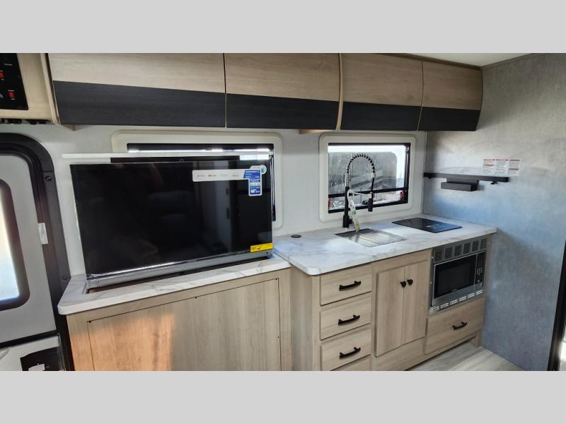 Trips across the state are made cozy in this single slide out coach for two! Once you've parked for the day, you can make lunch on the recessed induction cooktop or in the convection microwave. The sofa slide out provides a place to relax, and the Murphy bed can be folded out when you're ready for some shut-eye. You will appreciate how spacious the full rear bath is, and there is a wardrobe plus a linen closet here for ample storage. The cab-over bunk is only available with the Trekker Cap option; see dealer for more details.