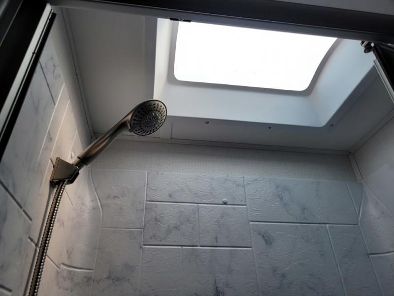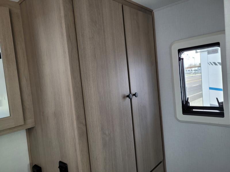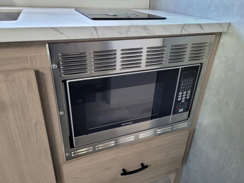 Trips across the state are made cozy in this single slide out coach for two! Once you've parked for the day, you can make lunch on the recessed induction cooktop or in the convection microwave. The sofa slide out provides a place to relax, and the Murphy bed can be folded out when you're ready for some shut-eye. You will appreciate how spacious the full rear bath is, and there is a wardrobe plus a linen closet here for ample storage. The cab-over bunk is only available with the Trekker Cap option; see dealer for more details.