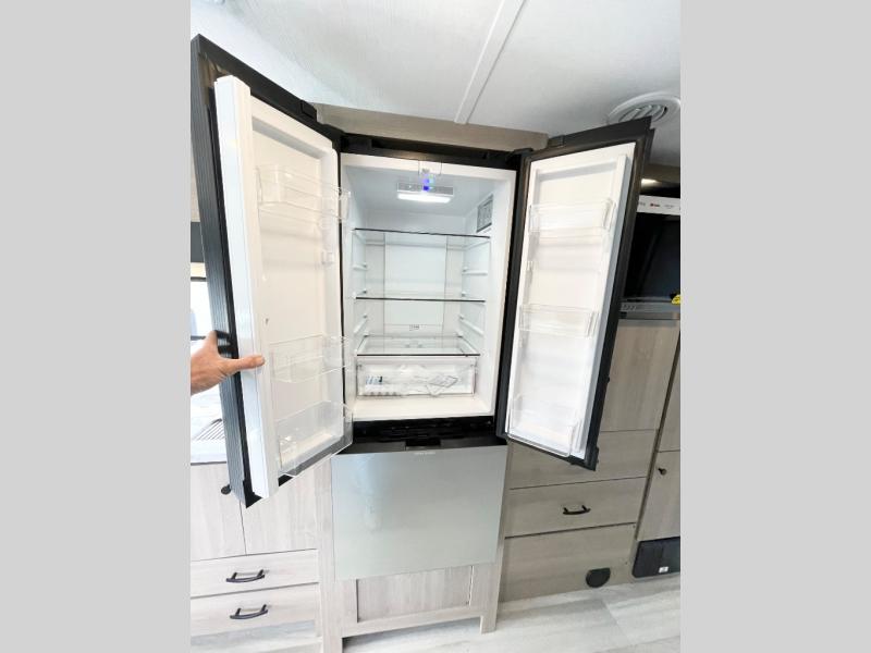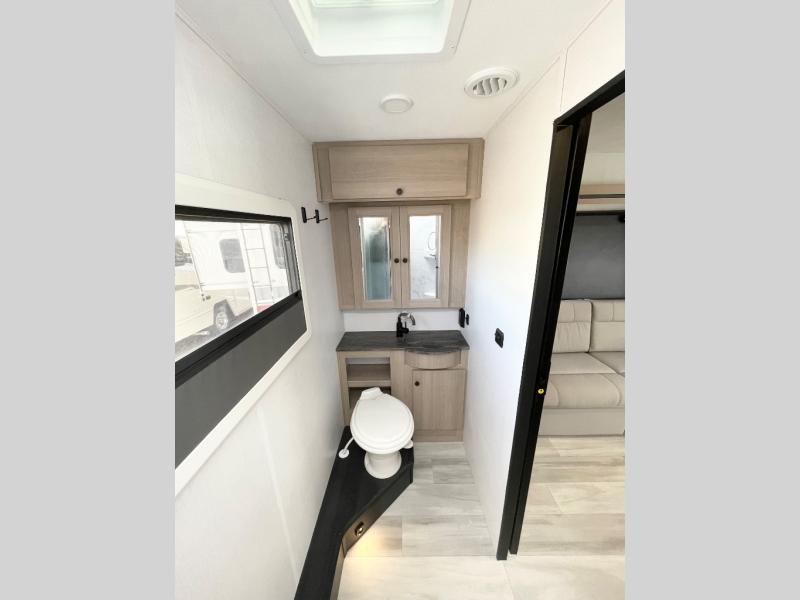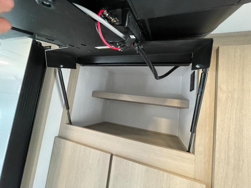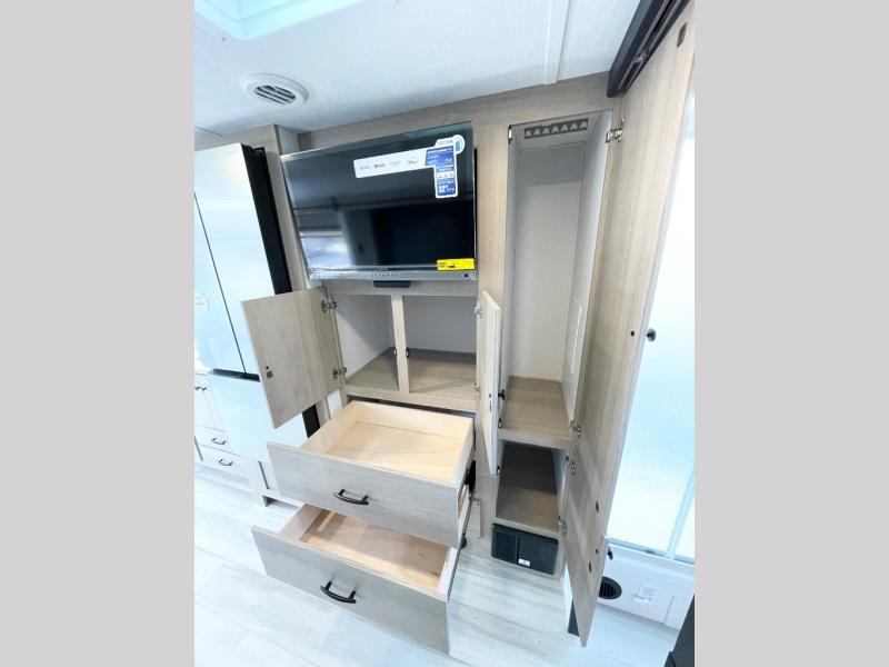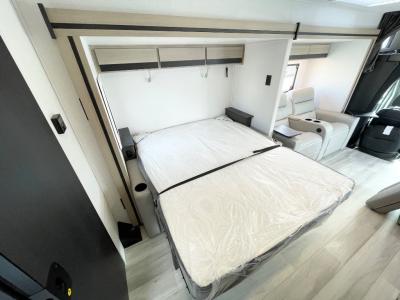 This versatile coach is perfect for the couple ready for adventure. The overhead bunk will allow one to two more to tag along, or you can choose the optional Trekker cap to replace the overhead bunk. After you park for the day, relax on the power theater seat with a good book, or enjoy a meal on the sofa with a table. And the queen Murphy bed can be folded down when you're ready for bed. You will find drawers with hidden storage behind the TV for your valuables, plus plenty of overhead compartments. This model also features a spacious full rear bath, allowing you to stay clean throughout your whole trip!