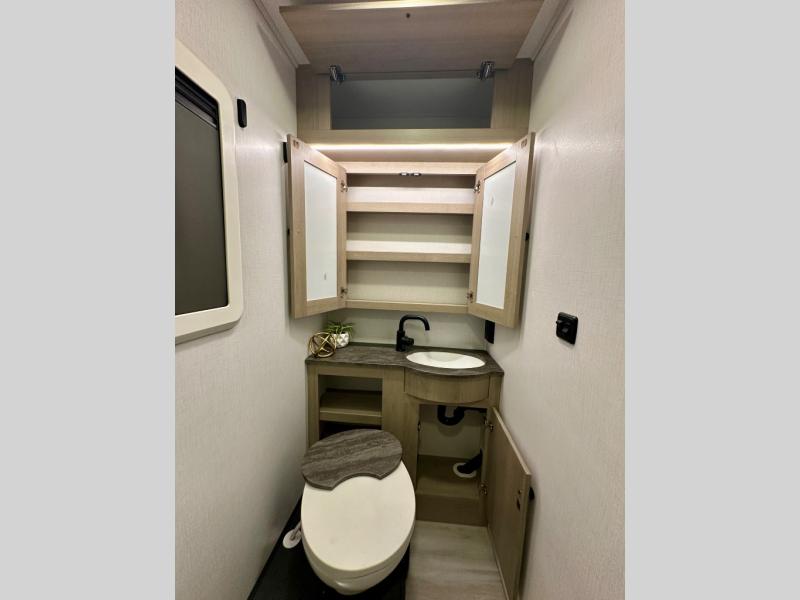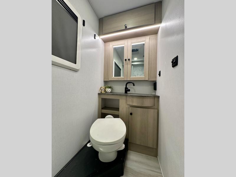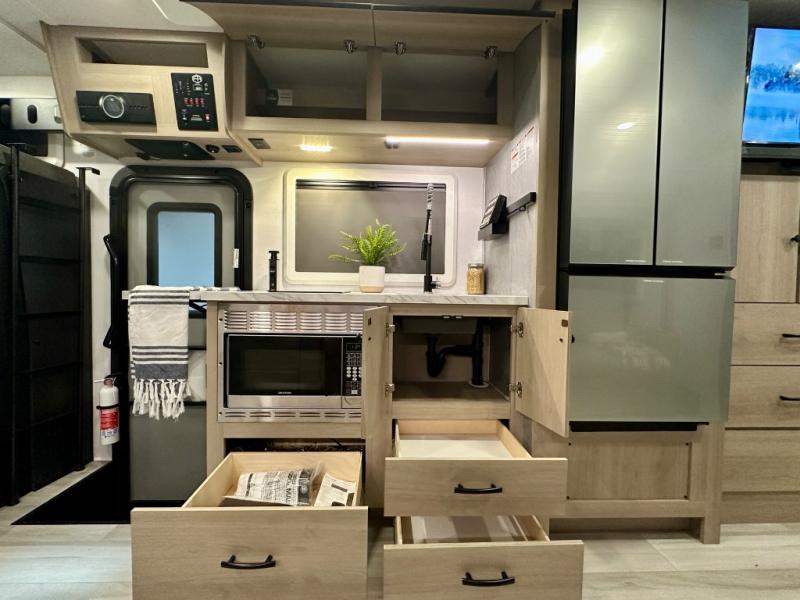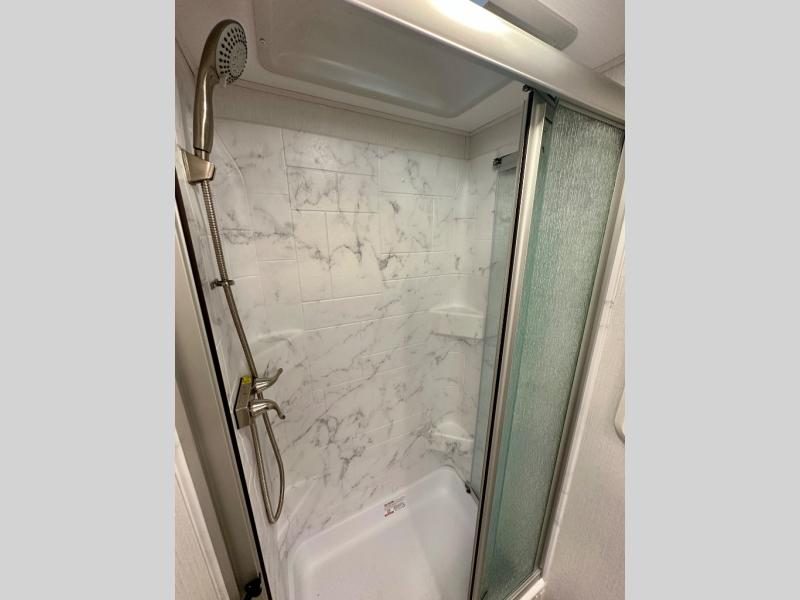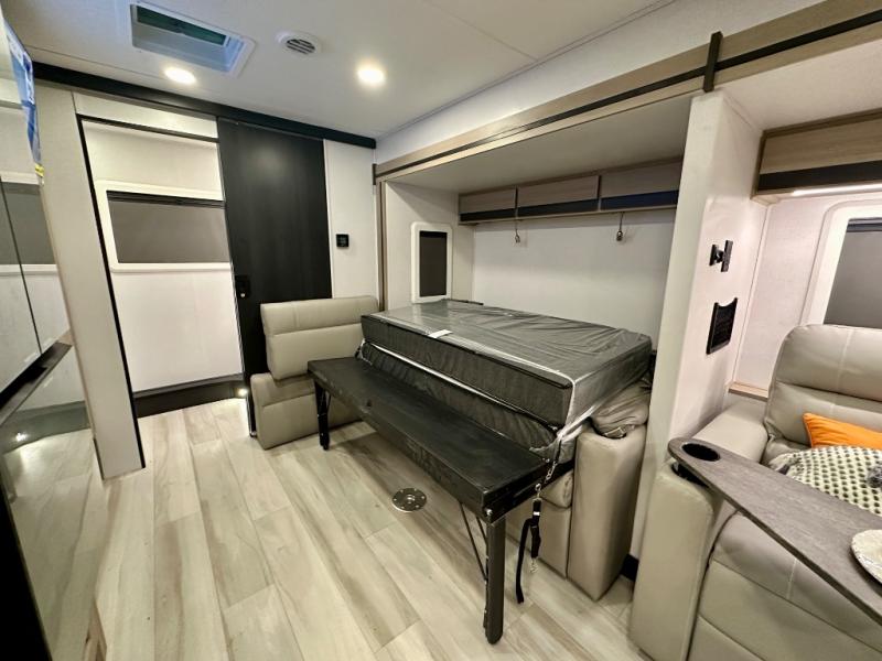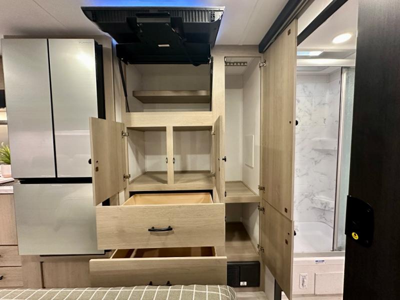 This versatile coach is perfect for the couple ready for adventure. The overhead bunk will allow one to two more to tag along, or you can choose the optional Trekker cap to replace the overhead bunk. After you park for the day, relax on the power theater seat with a good book, or enjoy a meal on the sofa with a table. And the queen Murphy bed can be folded down when you're ready for bed. You will find drawers with hidden storage behind the TV for your valuables, plus plenty of overhead compartments. This model also features a spacious full rear bath, allowing you to stay clean throughout your whole trip!