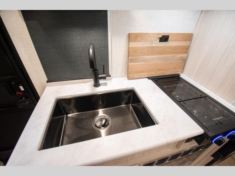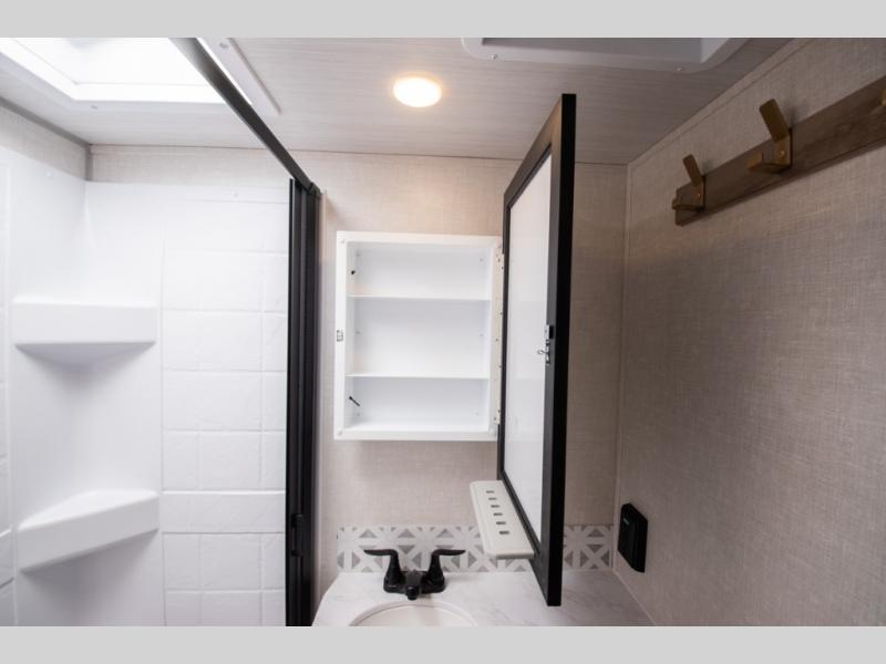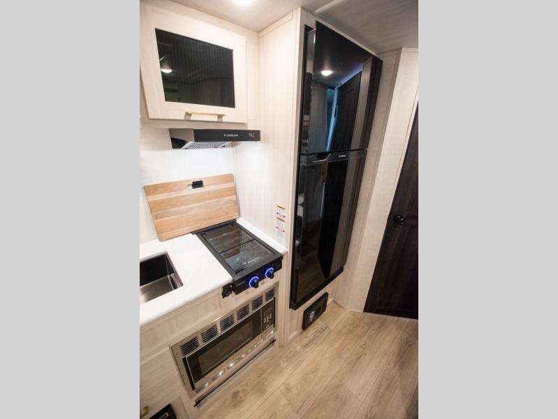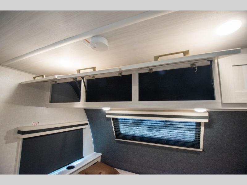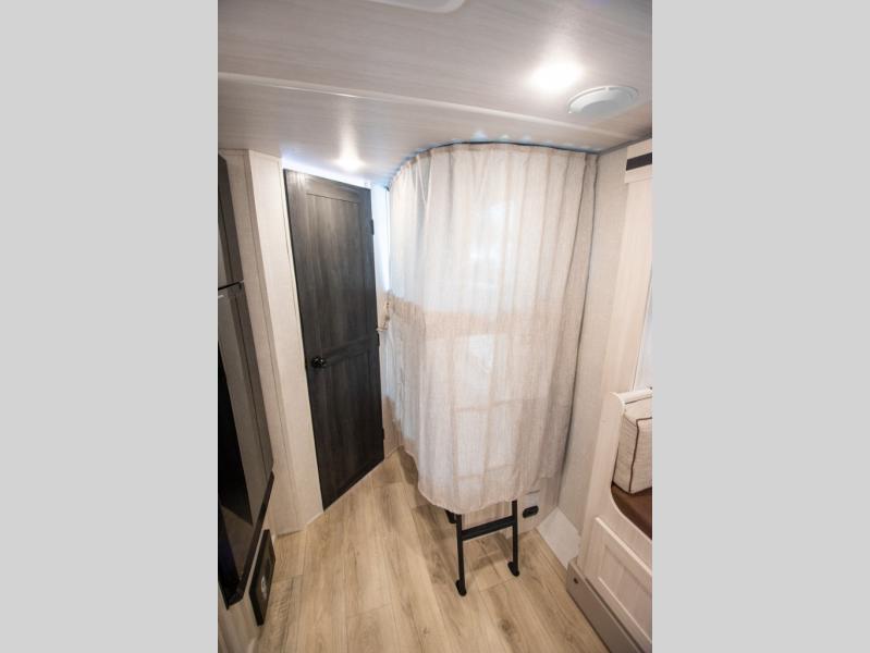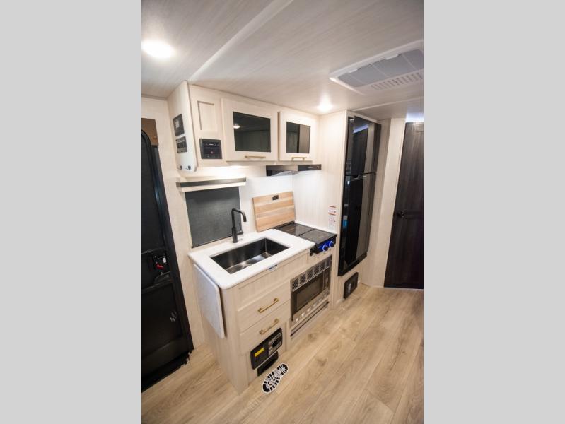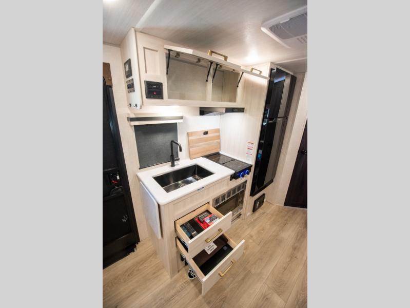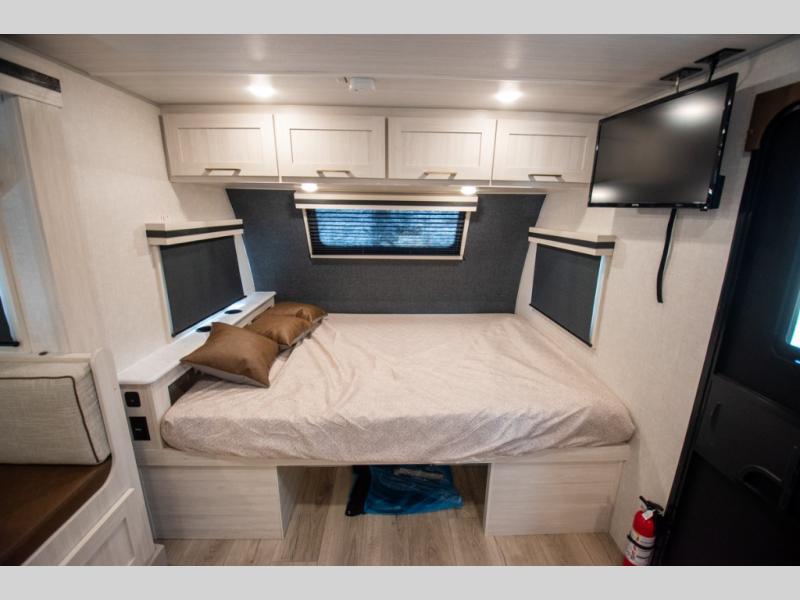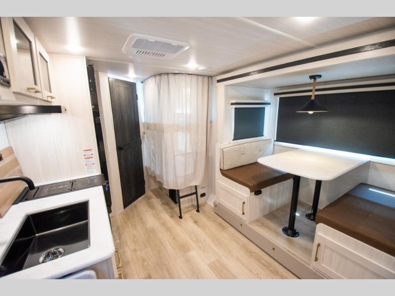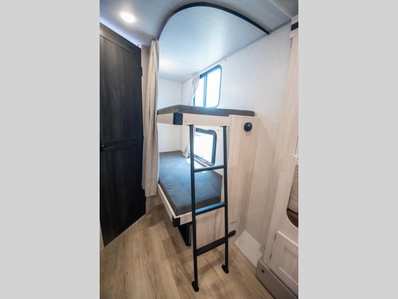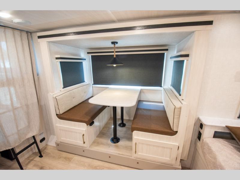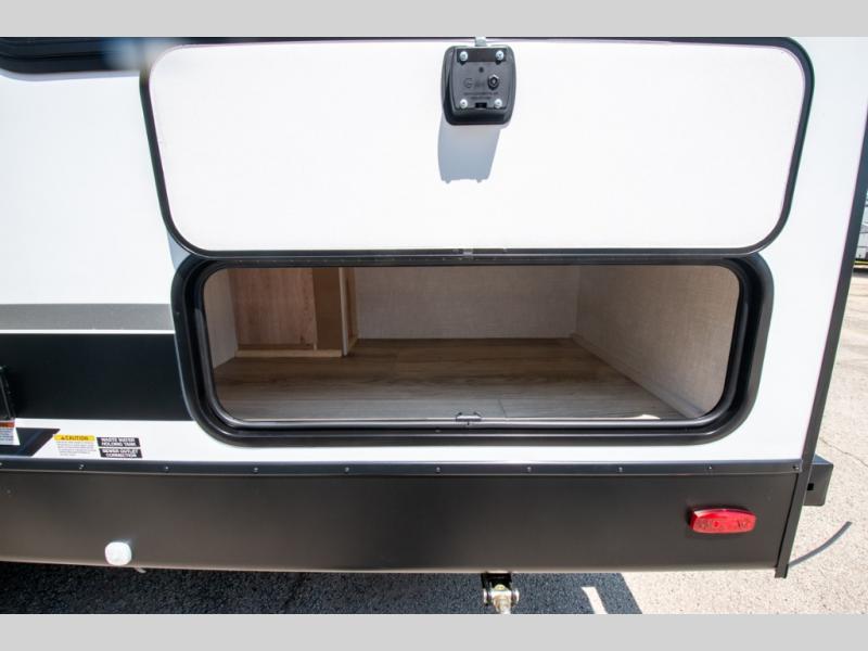 Bring along family or friends in this travel trailer that can sleep up to six people each night. The dinette slide will provide the chef space to cook on the two burner cooktop, or they may just head outdoors to cook on the outside kitchen. There is also an outdoor shelf here and a spray port for your convenience. The true queen-size bed up front is sure to provide a great night's rest, plus there is a "Stargazer" front window that will allow natural light in and beautiful starry nights.