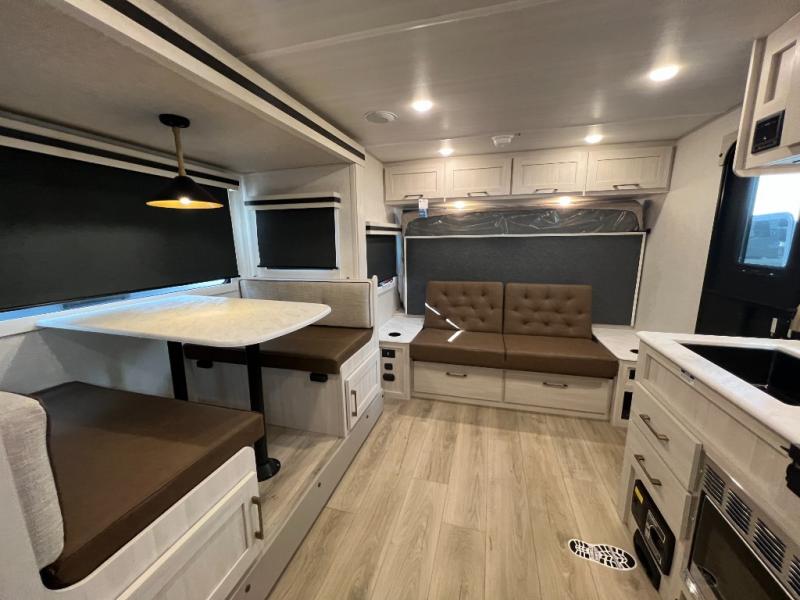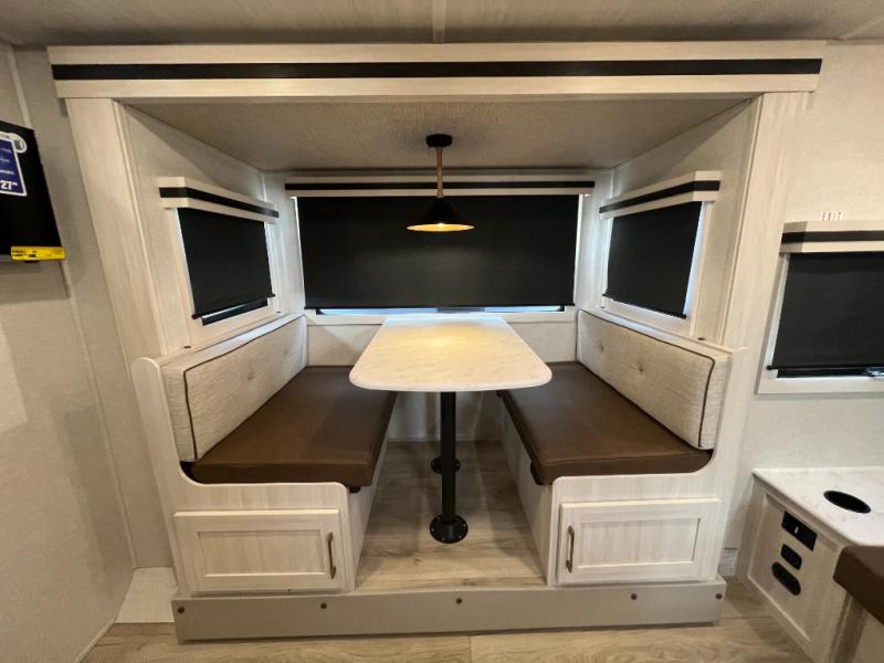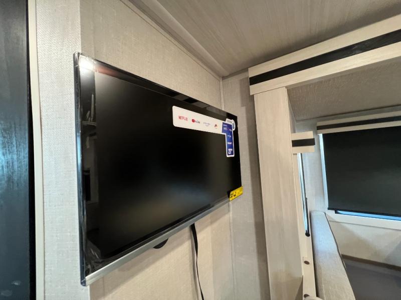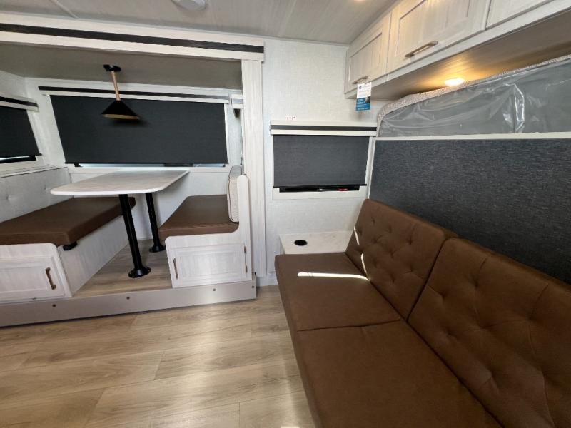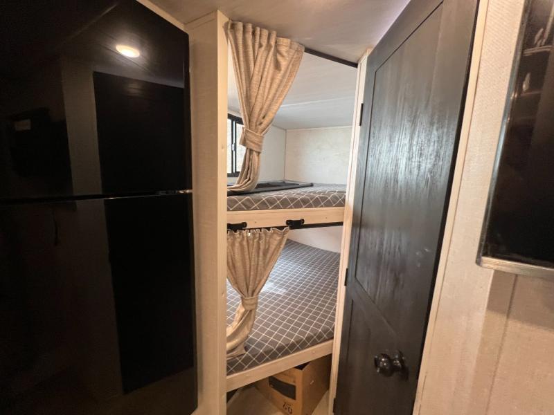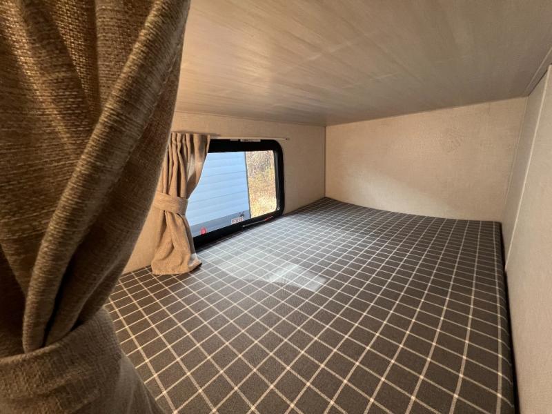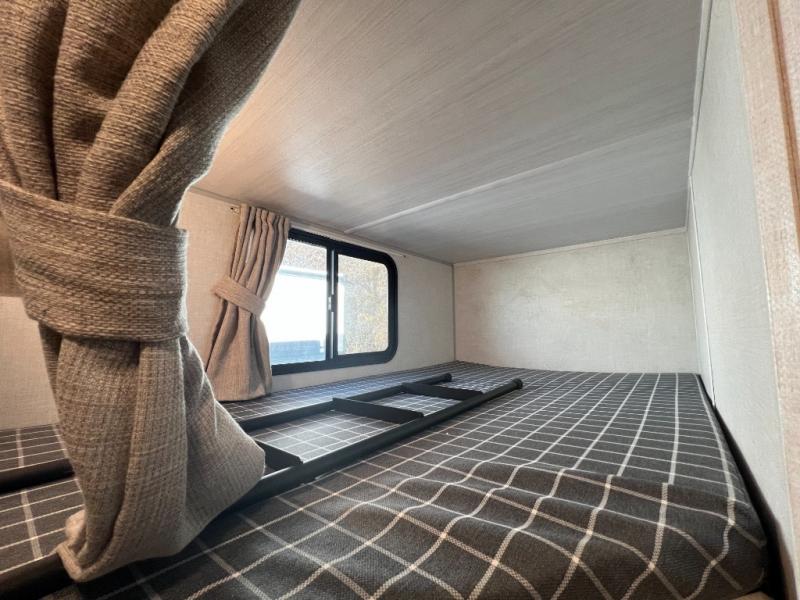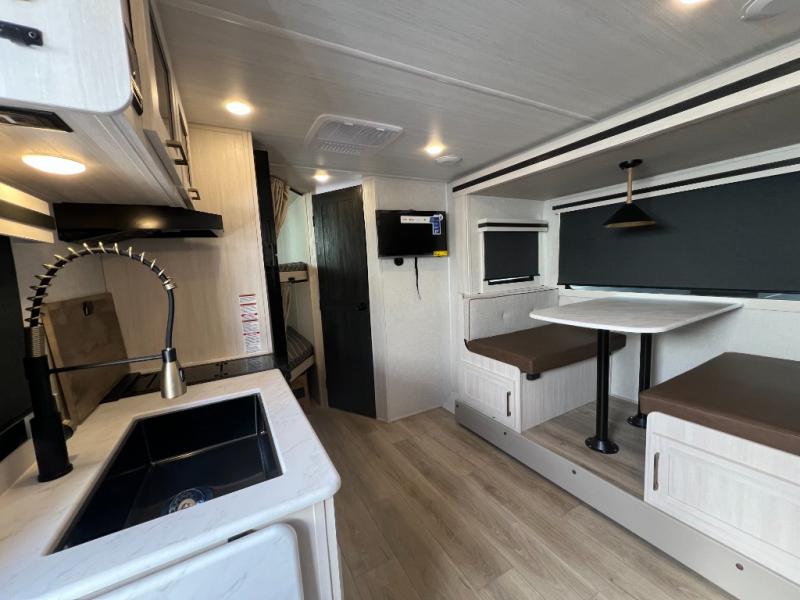 Experiencing the camping lifestyle just got easier with this travel trailer in tow! The outdoor kitchen includes griddle and a shelf, plus there is a two burner cooktop inside if the weather isn't cooperating. There is a dinette slide where you can play a game of cards at, and the HD TV will allow you to keep up on your favorite shows. The kids or your guests can make themselves comfortable on the oversized bunks with a ladder, and the spacious full bath is close by for easy nighttime use. This model also includes a front queen-size Murphy bed with two end tables to set your books or phone on, plus there is overhead storage for your valuables.