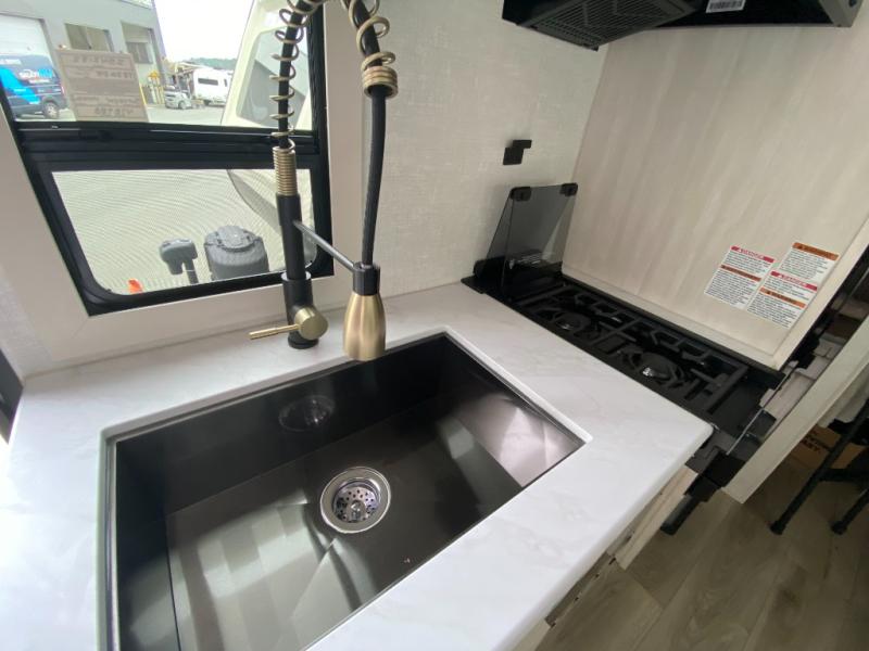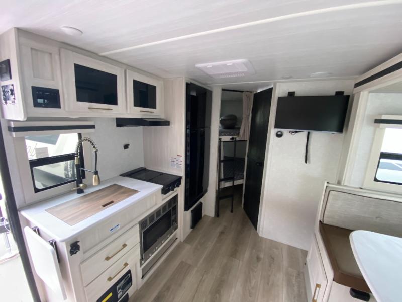 Experiencing the camping lifestyle just got easier with this travel trailer in tow! The outdoor kitchen includes griddle and a shelf, plus there is a two burner cooktop inside if the weather isn't cooperating. There is a dinette slide where you can play a game of cards at, and the HD TV will allow you to keep up on your favorite shows. The kids or your guests can make themselves comfortable on the oversized bunks with a ladder, and the spacious full bath is close by for easy nighttime use. This model also includes a front queen-size Murphy bed with two end tables to set your books or phone on, plus there is overhead storage for your valuables.