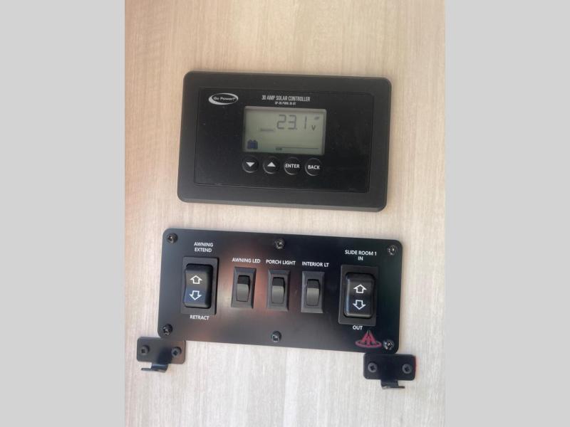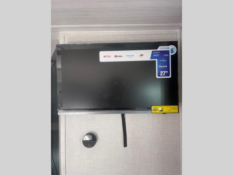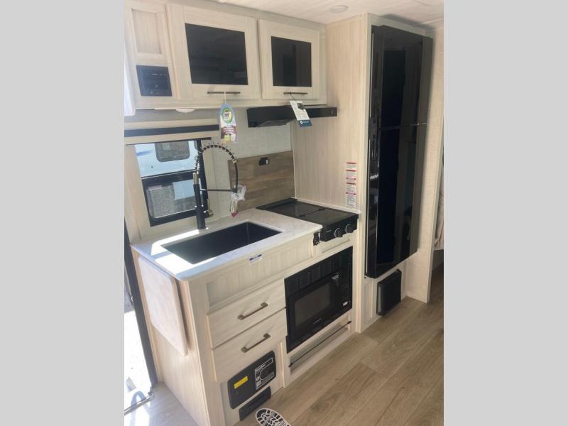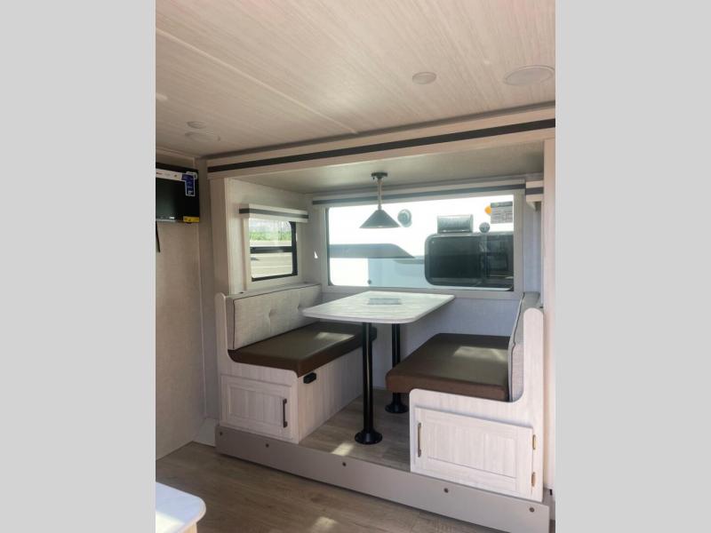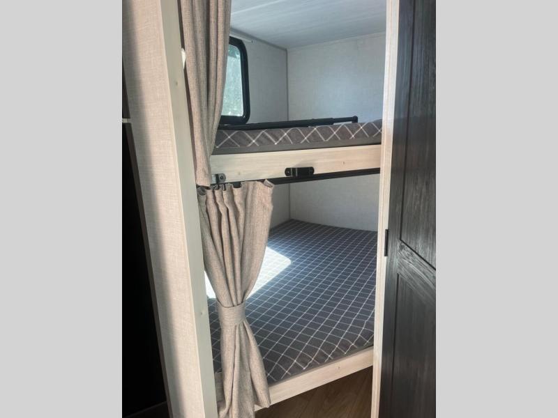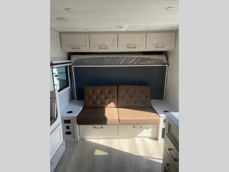 Experiencing the camping lifestyle just got easier with this travel trailer in tow! The outdoor kitchen includes griddle and a shelf, plus there is a two burner cooktop inside if the weather isn't cooperating. There is a dinette slide where you can play a game of cards at, and the HD TV will allow you to keep up on your favorite shows. The kids or your guests can make themselves comfortable on the oversized bunks with a ladder, and the spacious full bath is close by for easy nighttime use. This model also includes a front queen-size Murphy bed with two end tables to set your books or phone on, plus there is overhead storage for your valuables.