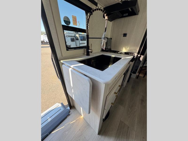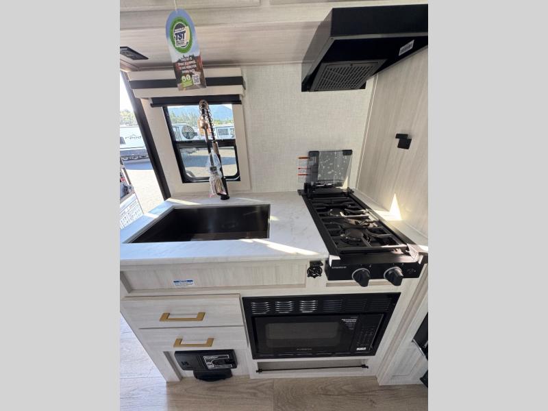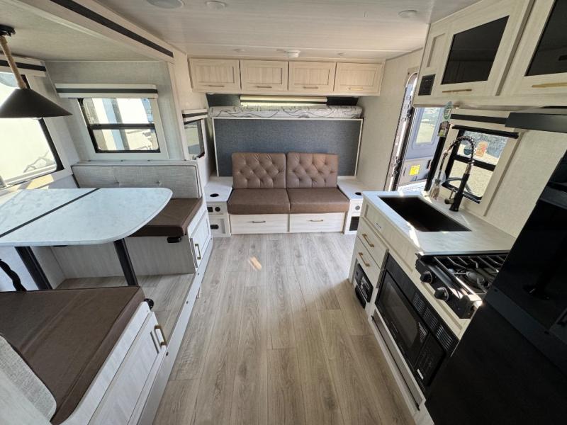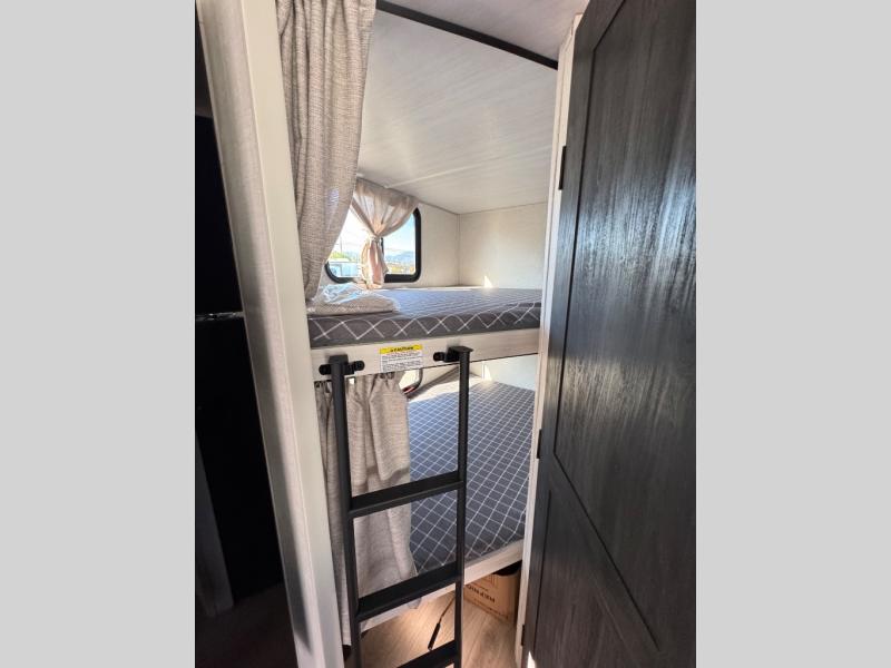 Experiencing the camping lifestyle just got easier with this travel trailer in tow! The outdoor kitchen includes griddle and a shelf, plus there is a two burner cooktop inside if the weather isn't cooperating. There is a dinette slide where you can play a game of cards at, and the HD TV will allow you to keep up on your favorite shows. The kids or your guests can make themselves comfortable on the oversized bunks with a ladder, and the spacious full bath is close by for easy nighttime use. This model also includes a front queen-size Murphy bed with two end tables to set your books or phone on, plus there is overhead storage for your valuables.